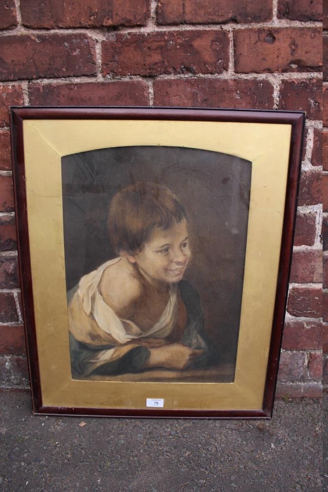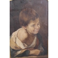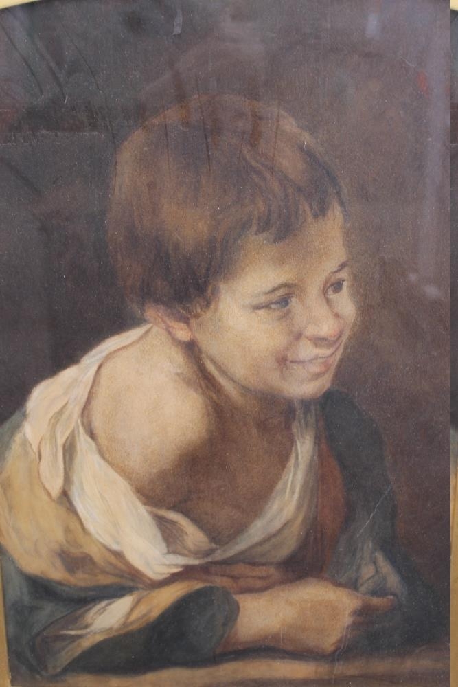 A LATE 19TH / EARLY 20TH CENTURY STUDY OF A YOUNG BOY LEANING ON A TABLE, unsigned, watercolour, framed and glazed, 50 x 36 cm
