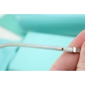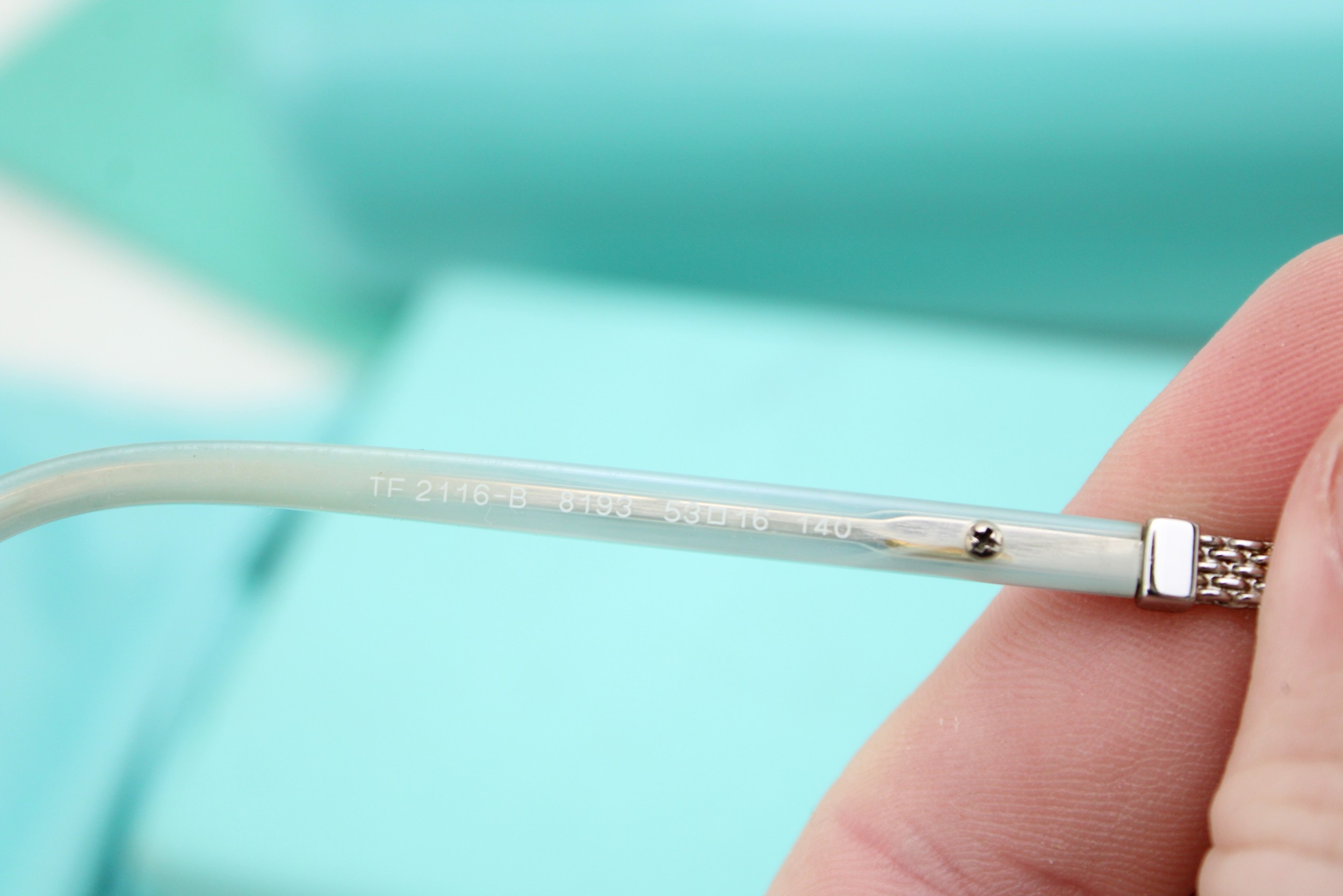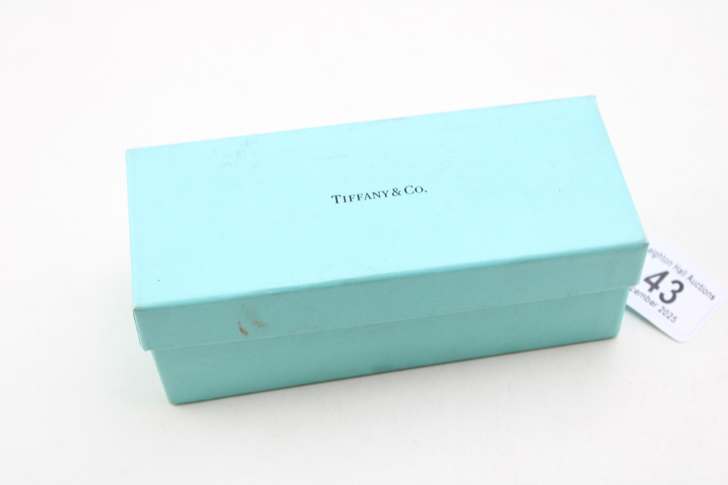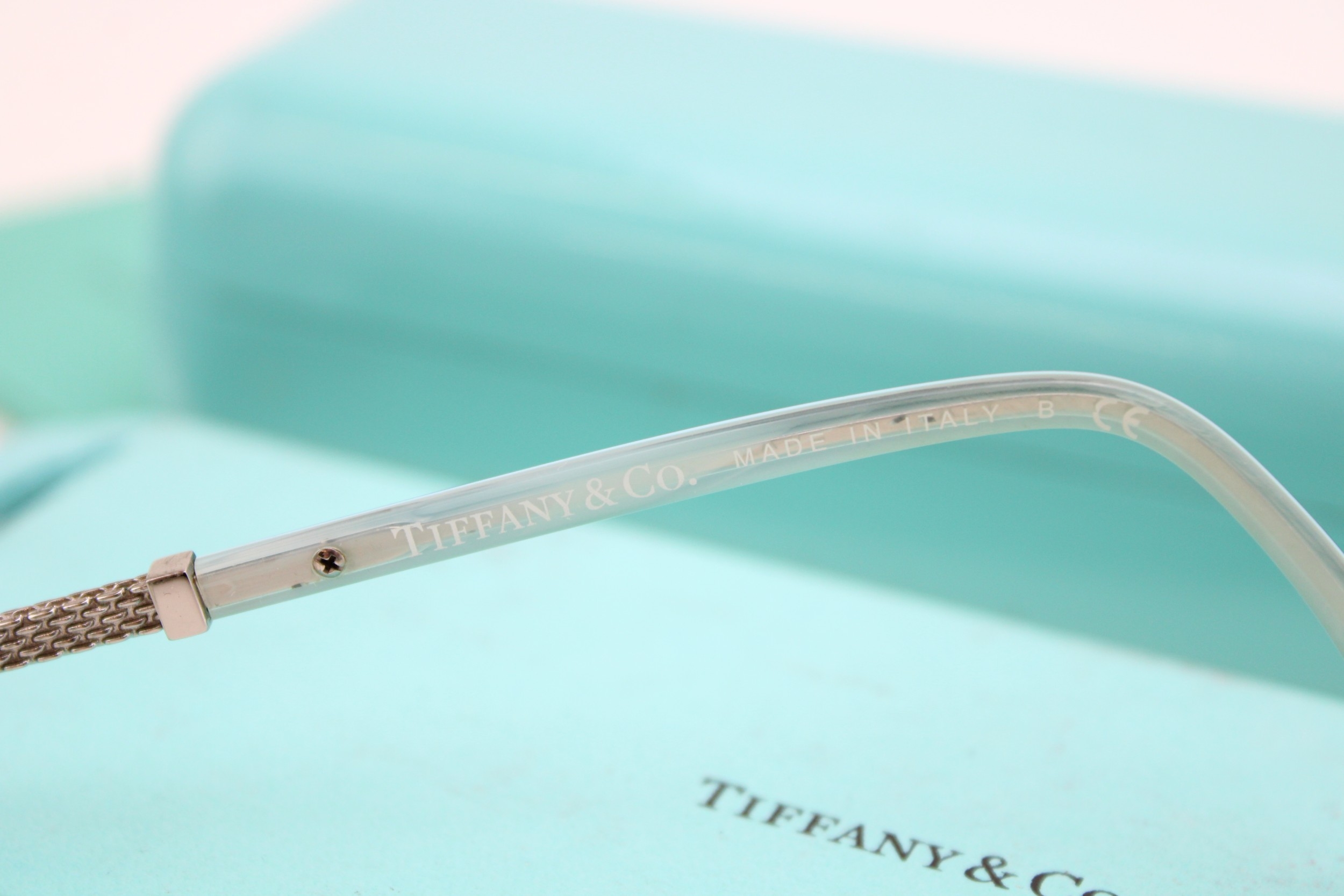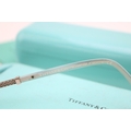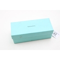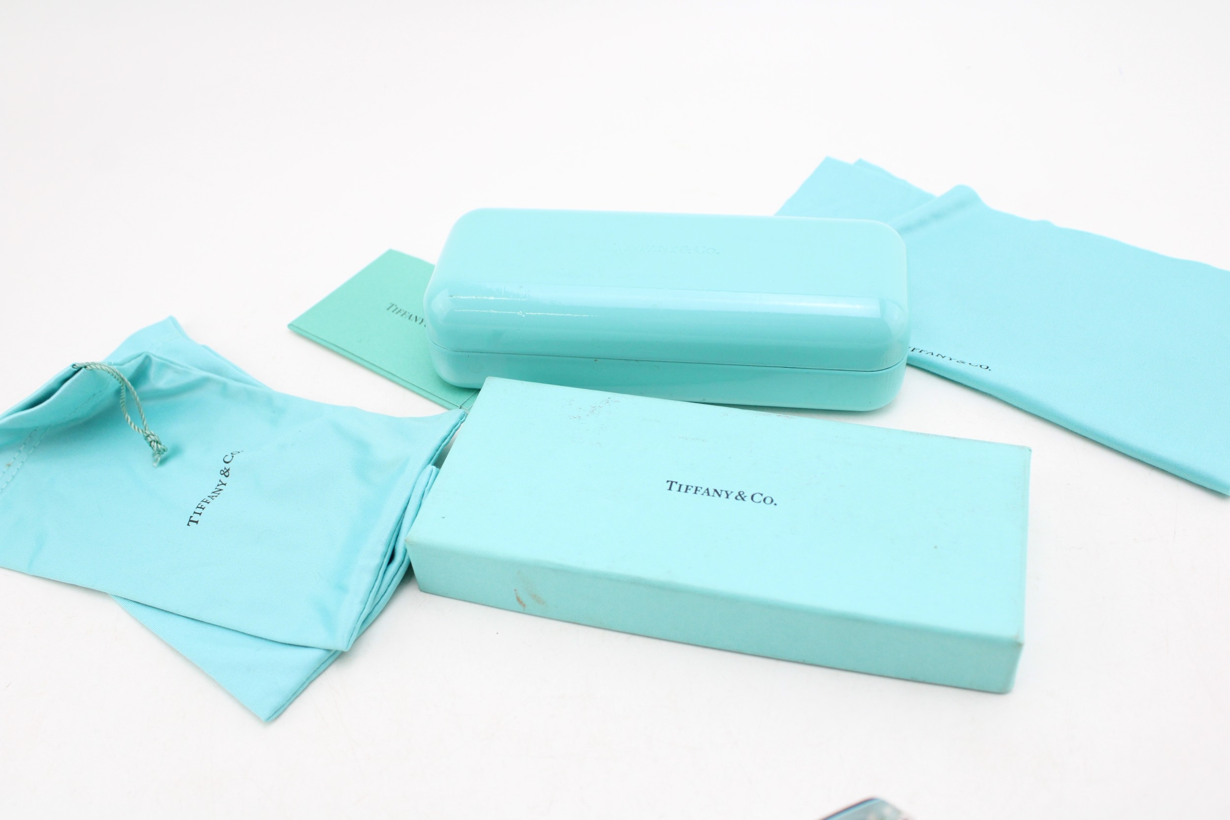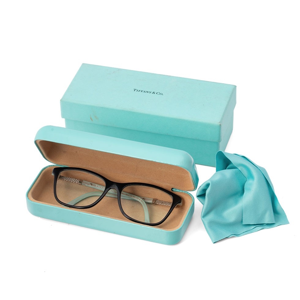 A cased pair of Tiffany reading glasses, in black and pale blue, with woven metal detail to each arm, marked Tiffany & Co to the outside of each arm, with original signed blue cleaning cloth, sleeve, pouch and hard shell Tiffany & Co case, 6 by 16 by 4cm deep, in original Tiffany & Co box.