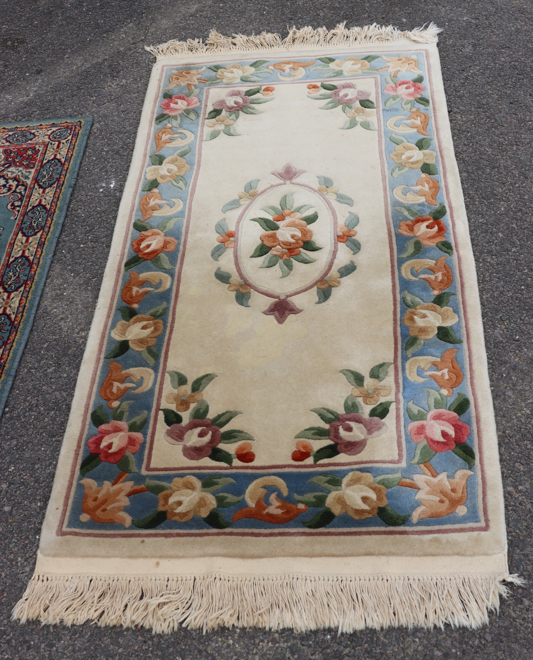 A small rug on cream ground with floral pattern, 176cm x 76c...