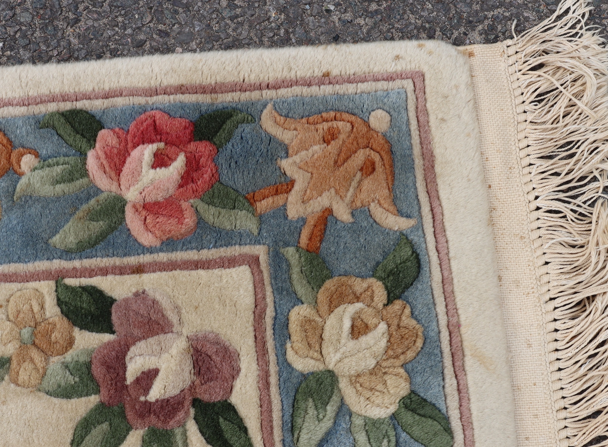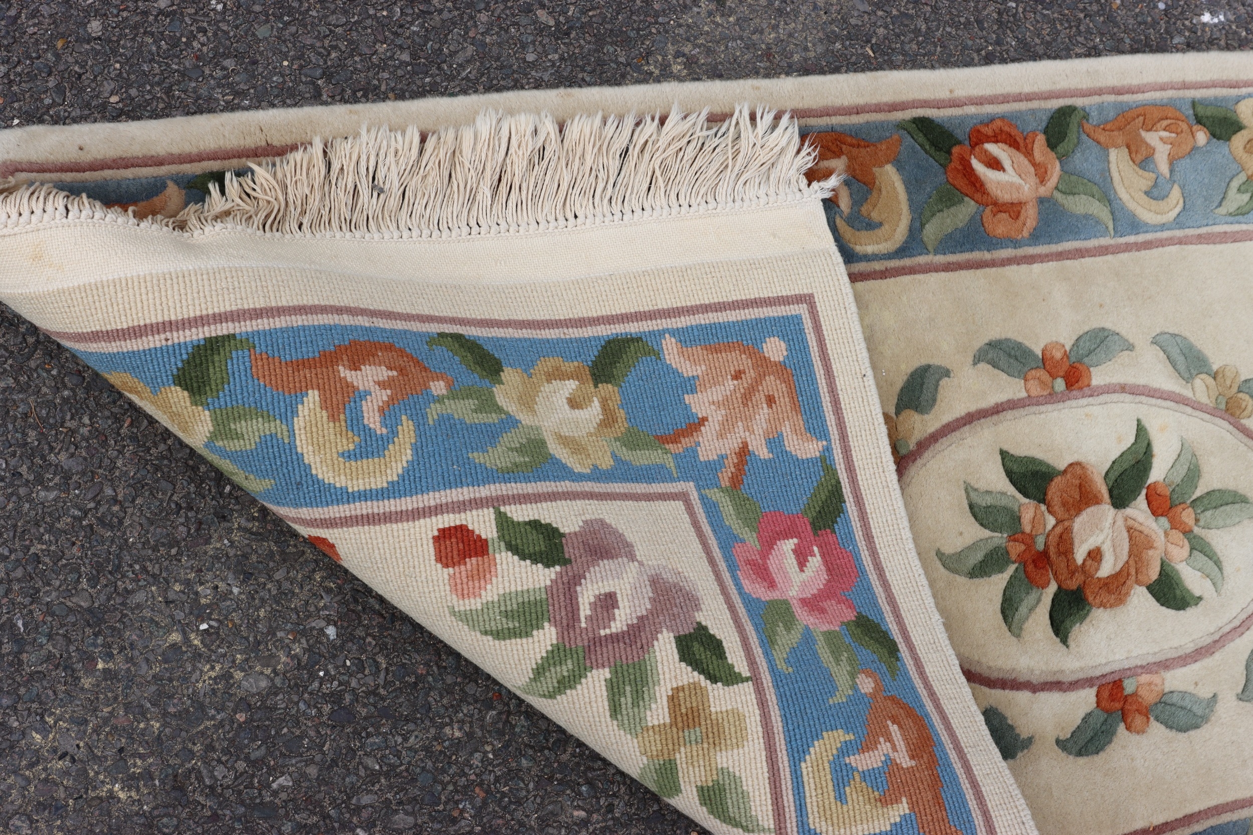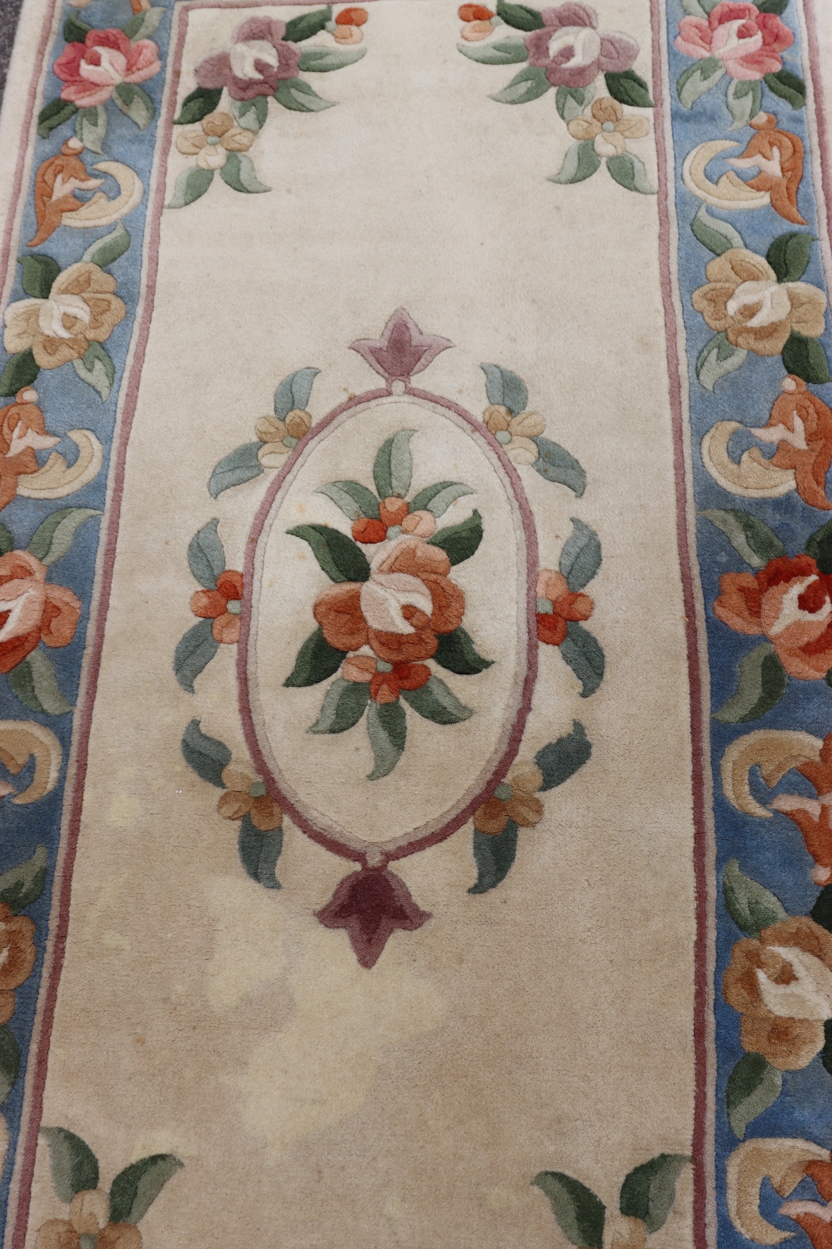 A small rug on cream ground with floral pattern, 176cm x 76cm (scattered spots and marks).