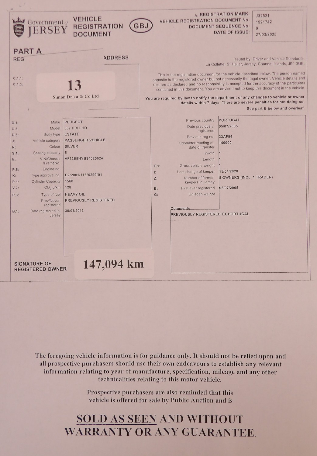 A 2005 Peugeot 307 1.6 HDi left hand drive estate J32521 (diesel/manual), odometer reading 147,094 kilometres