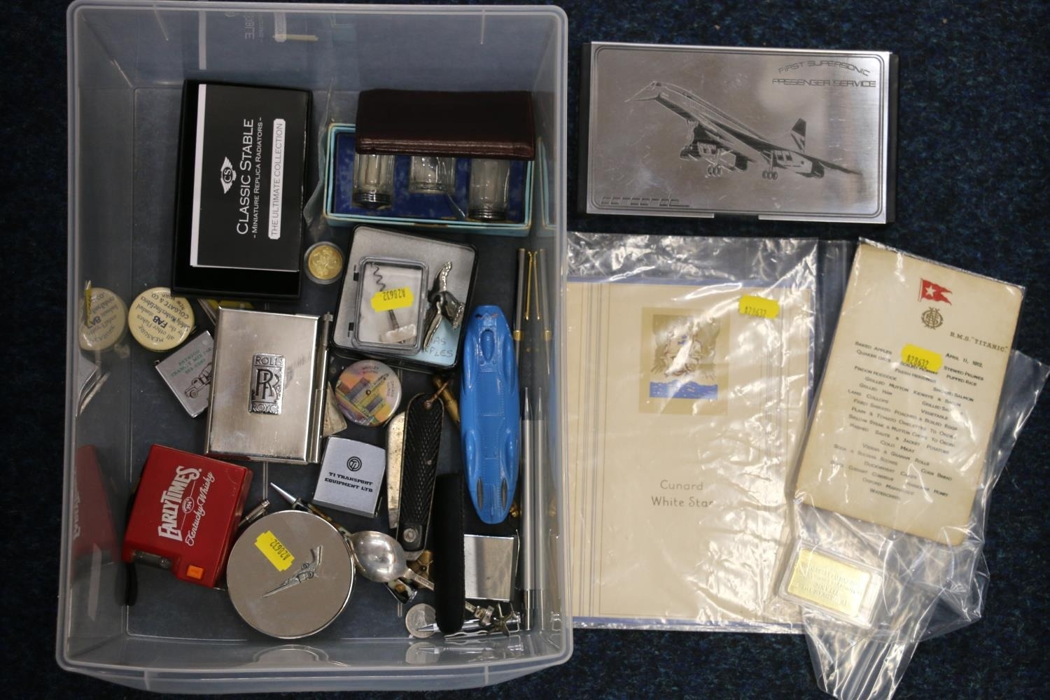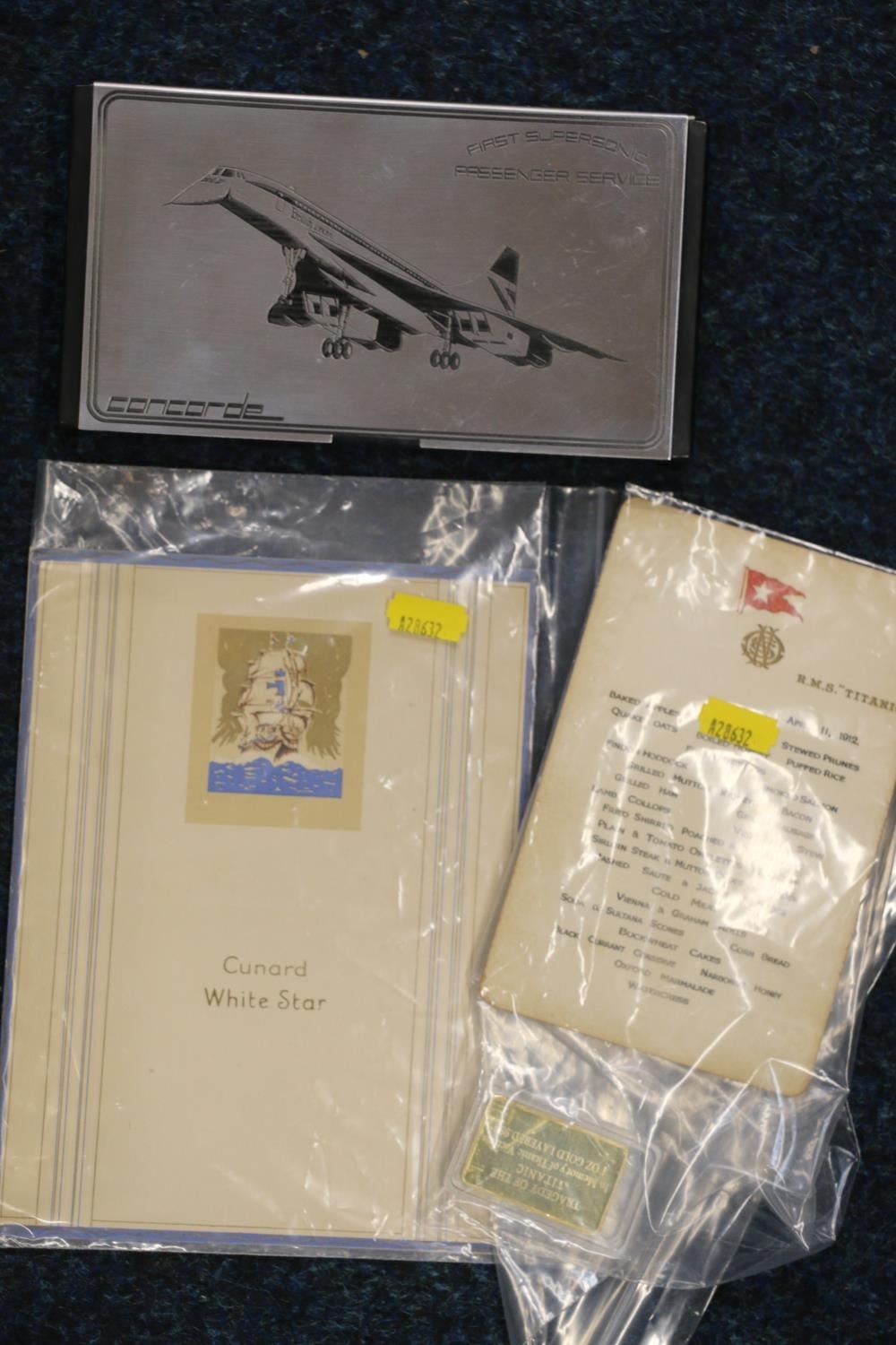 Cunard White Star Line menu, a reproduction Titanic menu, a Concorde box, a cruet set, a Wrigley Building Chicago tape measure, etc.