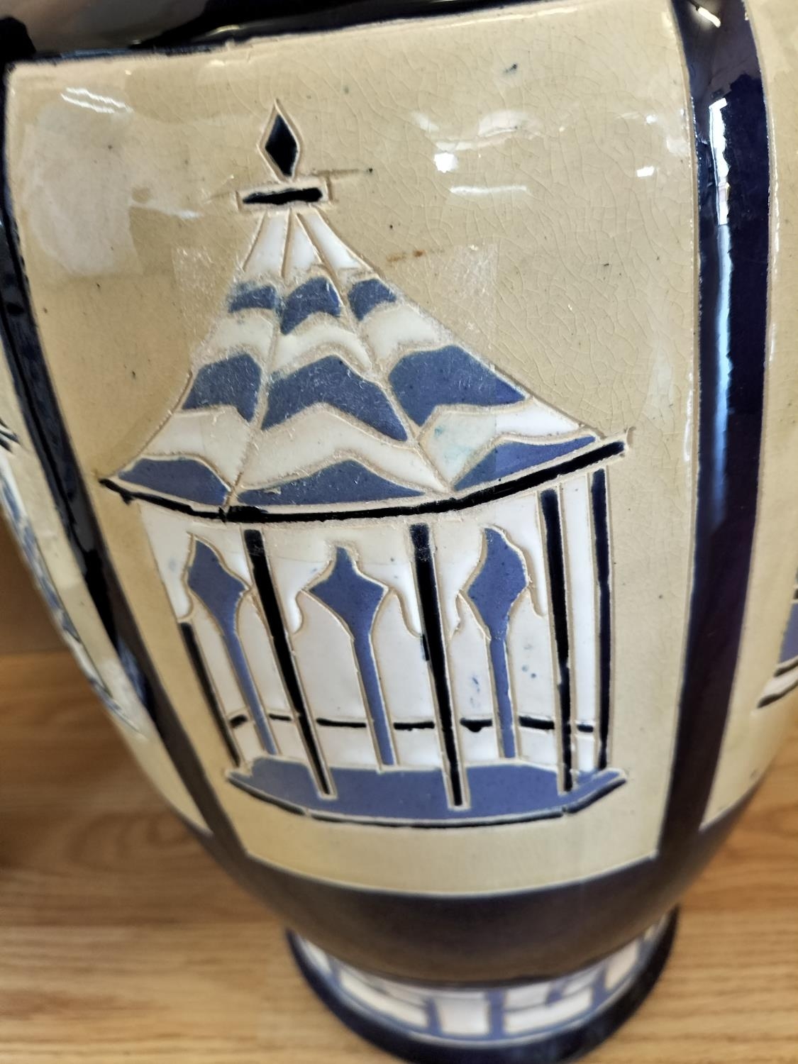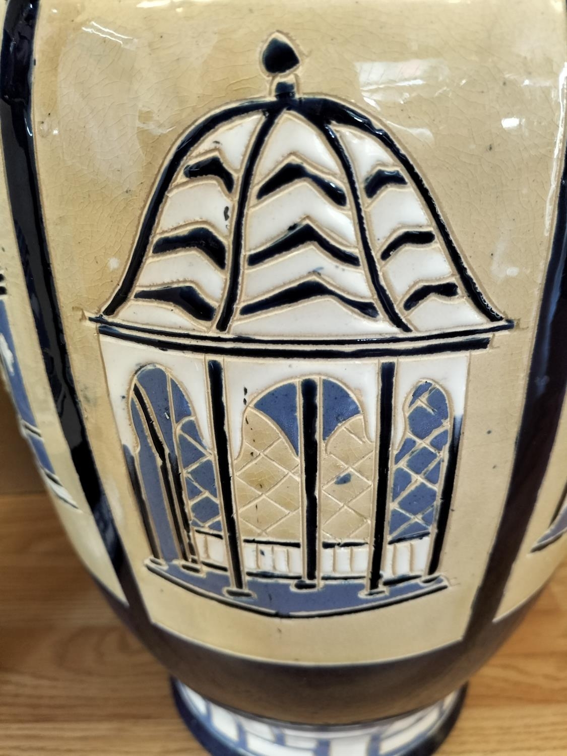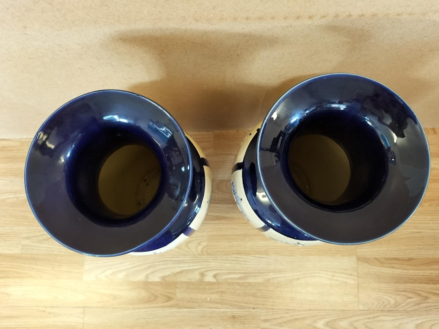 Pair of Large 53cm Ceramic Baluster Gazebo/Pagoda Vases. Unmarked, Possibly Brannam Pottery.