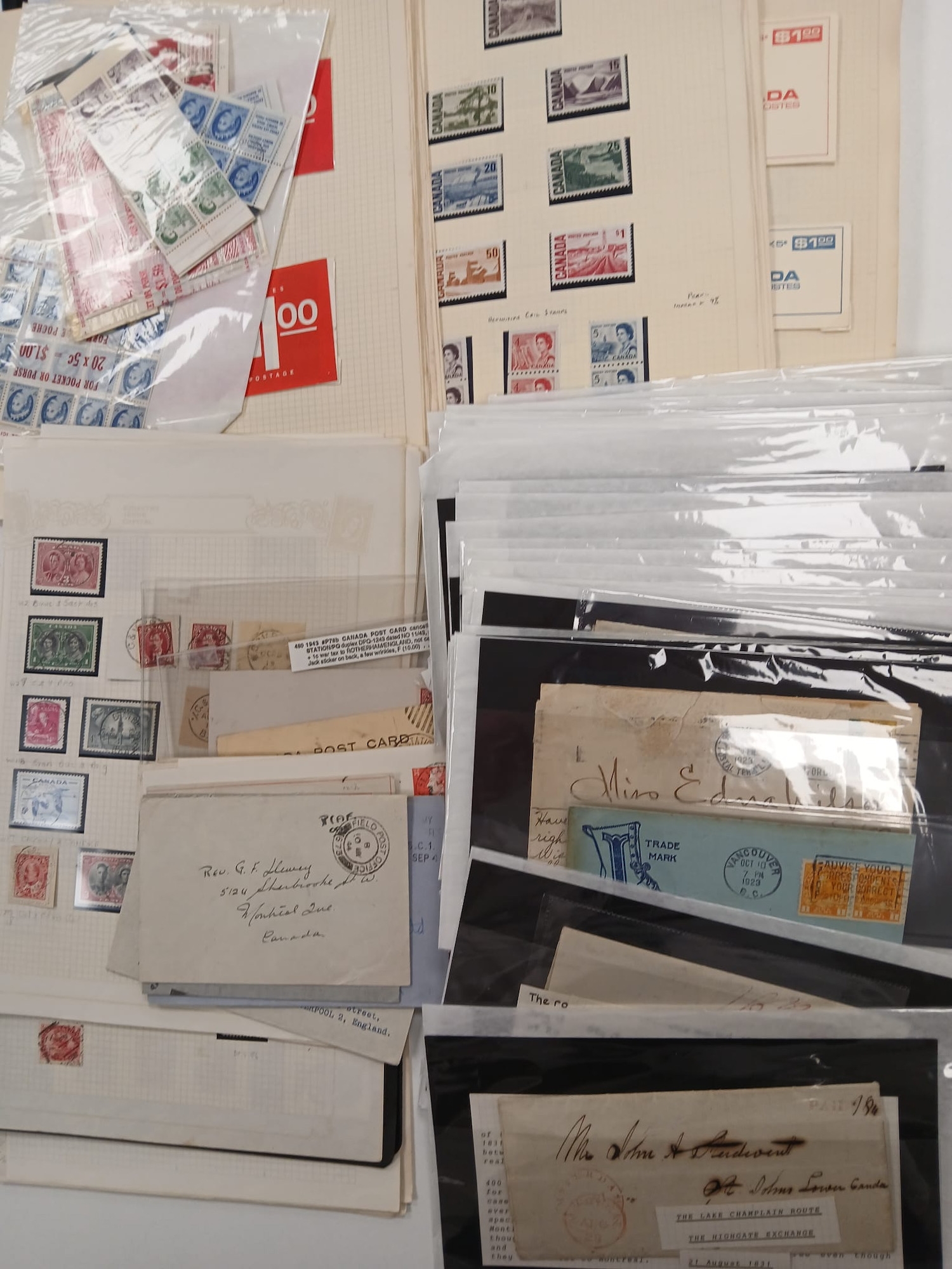 Canada. Stamps and covers, with part collections on album pages including QV postmark interest, but strength in a collection of postal history with various handstamps etc (40 items), with written descriptions including The Lake Champlain Route 1842, The Highgate Exchange 1831. Viewing recommended.