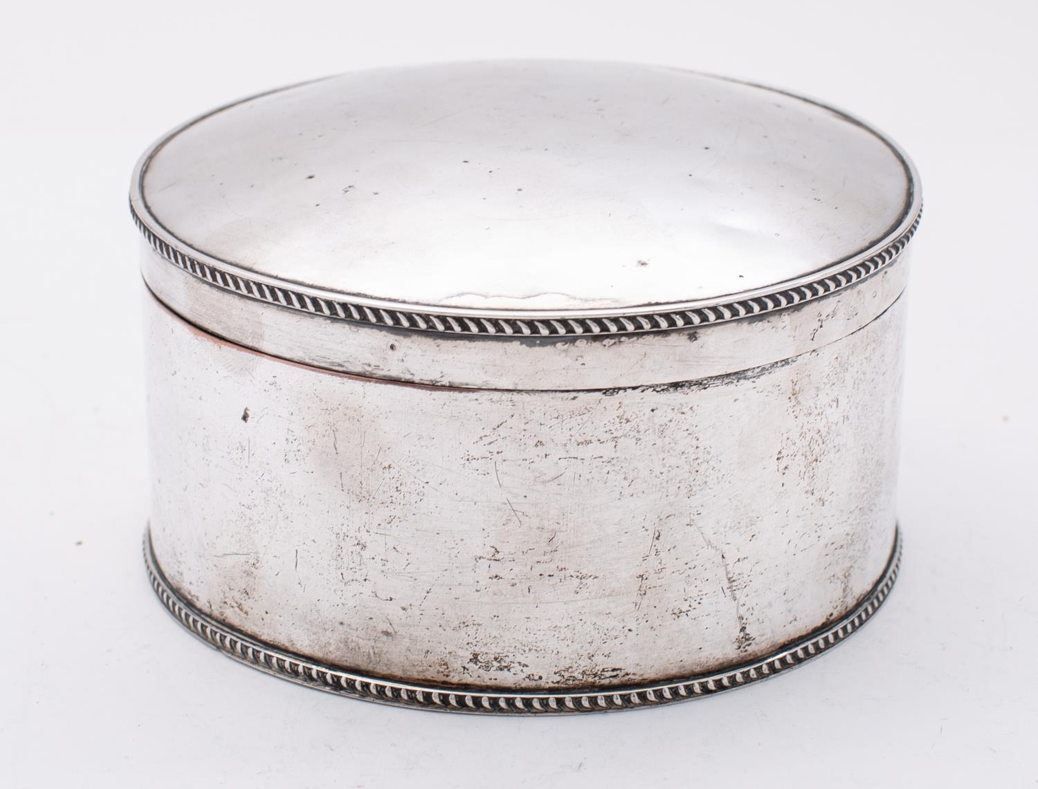 A 19th century Sheffield plate biscuit box, not marked, of circular form, domed hinge lid, gadrooned rim, 7.5x14cm, (2.9x5.5ins)