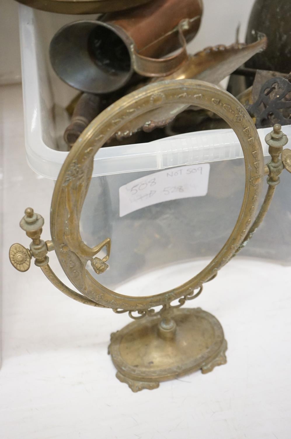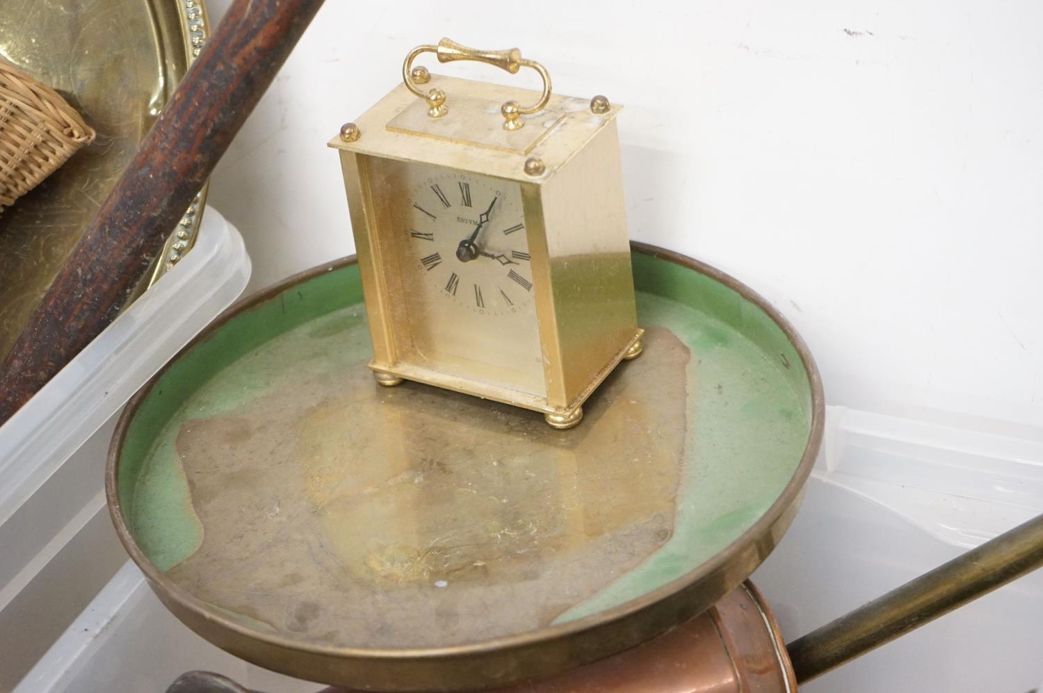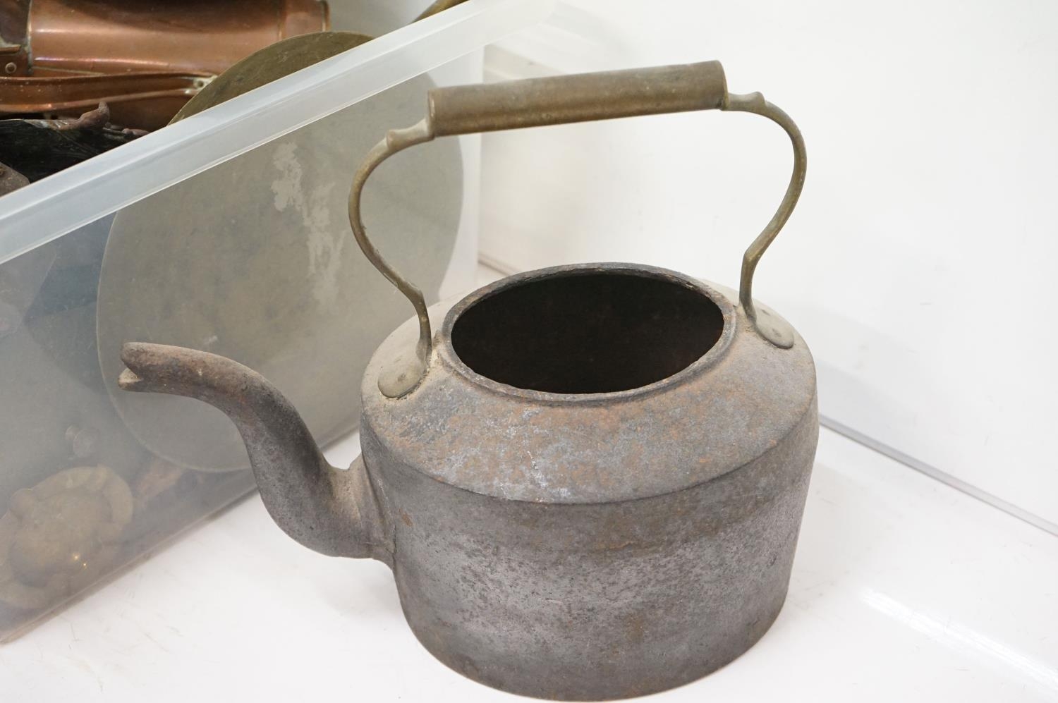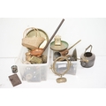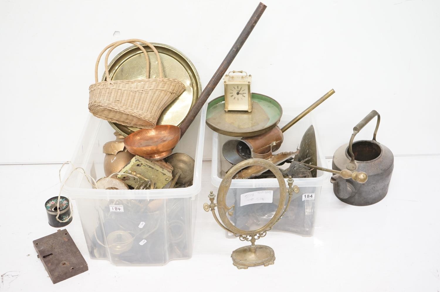 Mixed metal ware to include a cast iron kettle, Derverley footed copper dish, Art Nouveau style brass dressing table mirror frame, brass circular tray, copper jug, silver plated chamberstick, flat iron, trivet, fireside tools, manual mincer, Estyma carriage clock, vintage heavy-duty locks, etc (2 boxes)