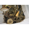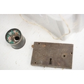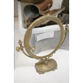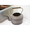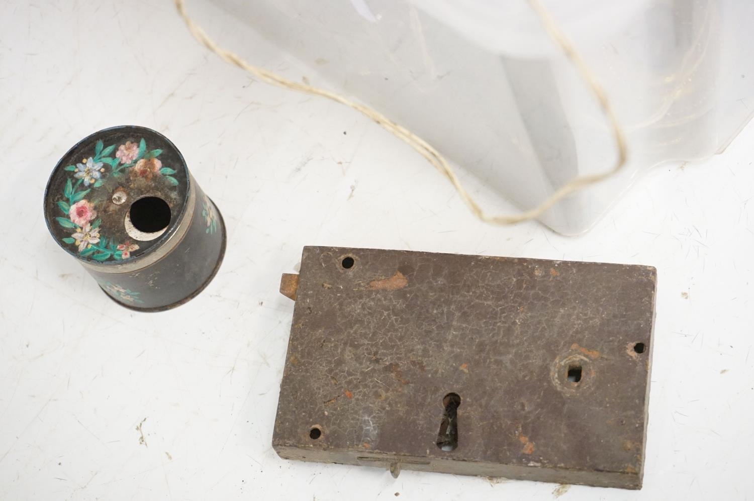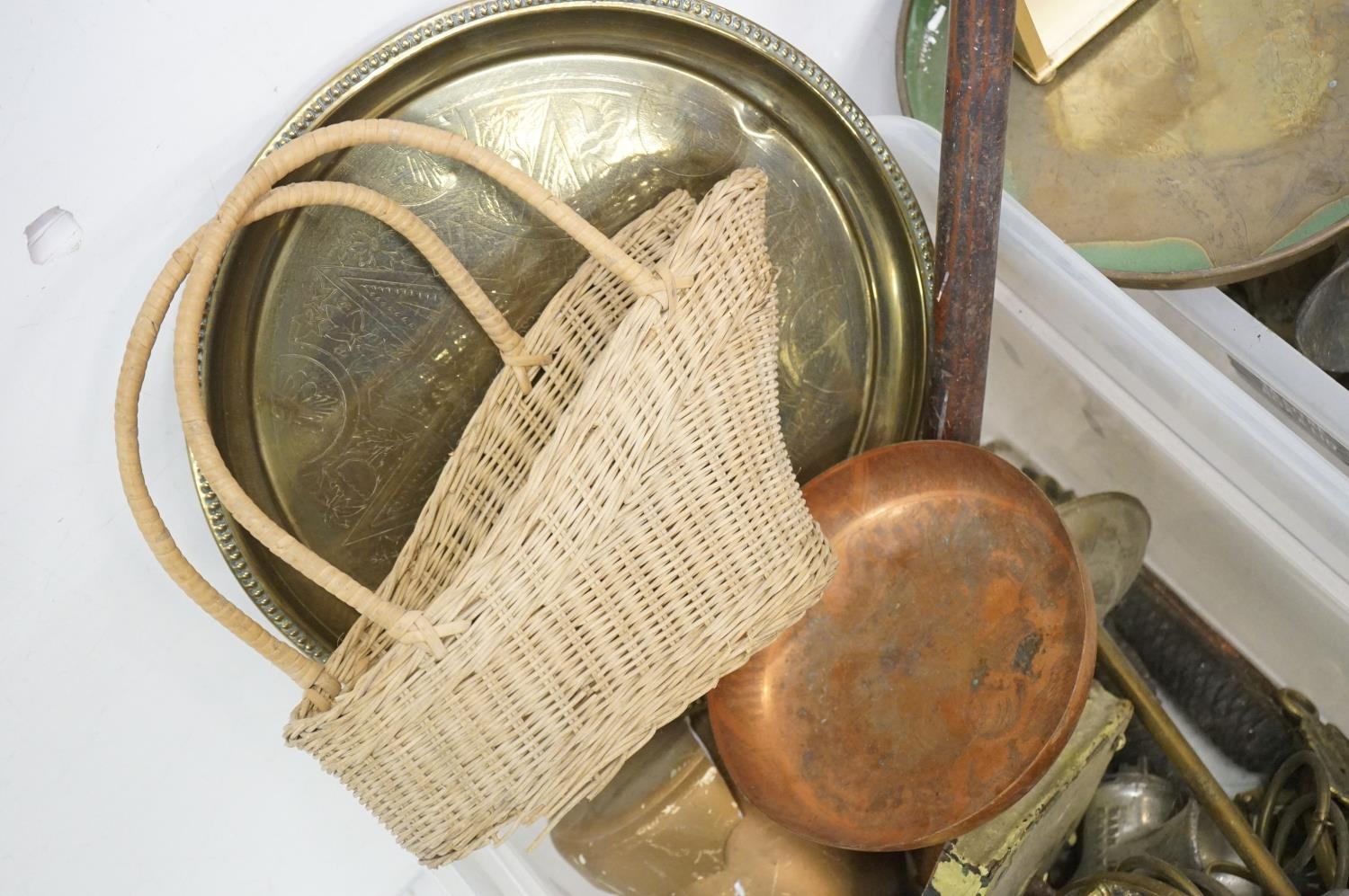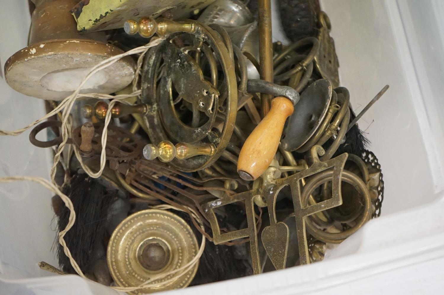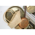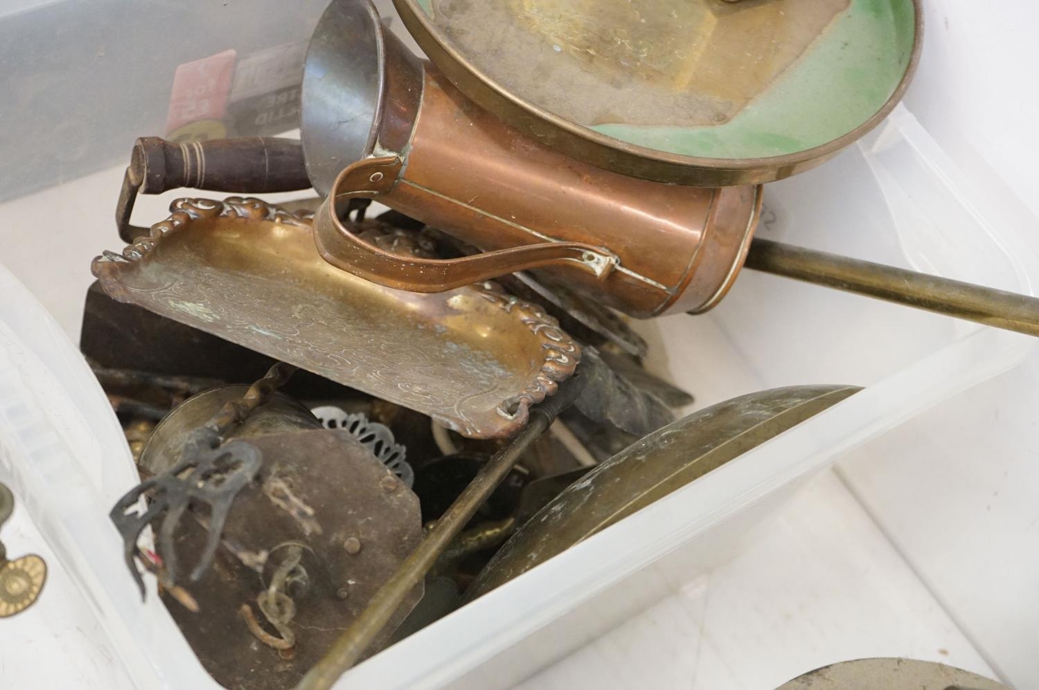 Mixed metal ware to include a cast iron kettle, Derverley footed copper dish, Art Nouveau style brass dressing table mirror frame, brass circular tray, copper jug, silver plated chamberstick, flat iron, trivet, fireside tools, manual mincer, Estyma carriage clock, vintage heavy-duty locks, etc (2 boxes)
