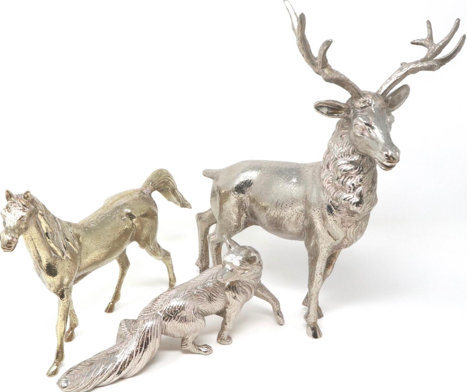 Silver plated horse, fox and stag, stag H: 30 cm. P&P Group 2 (£18+VAT for the first lot and £3+VAT for subsequent lots)