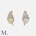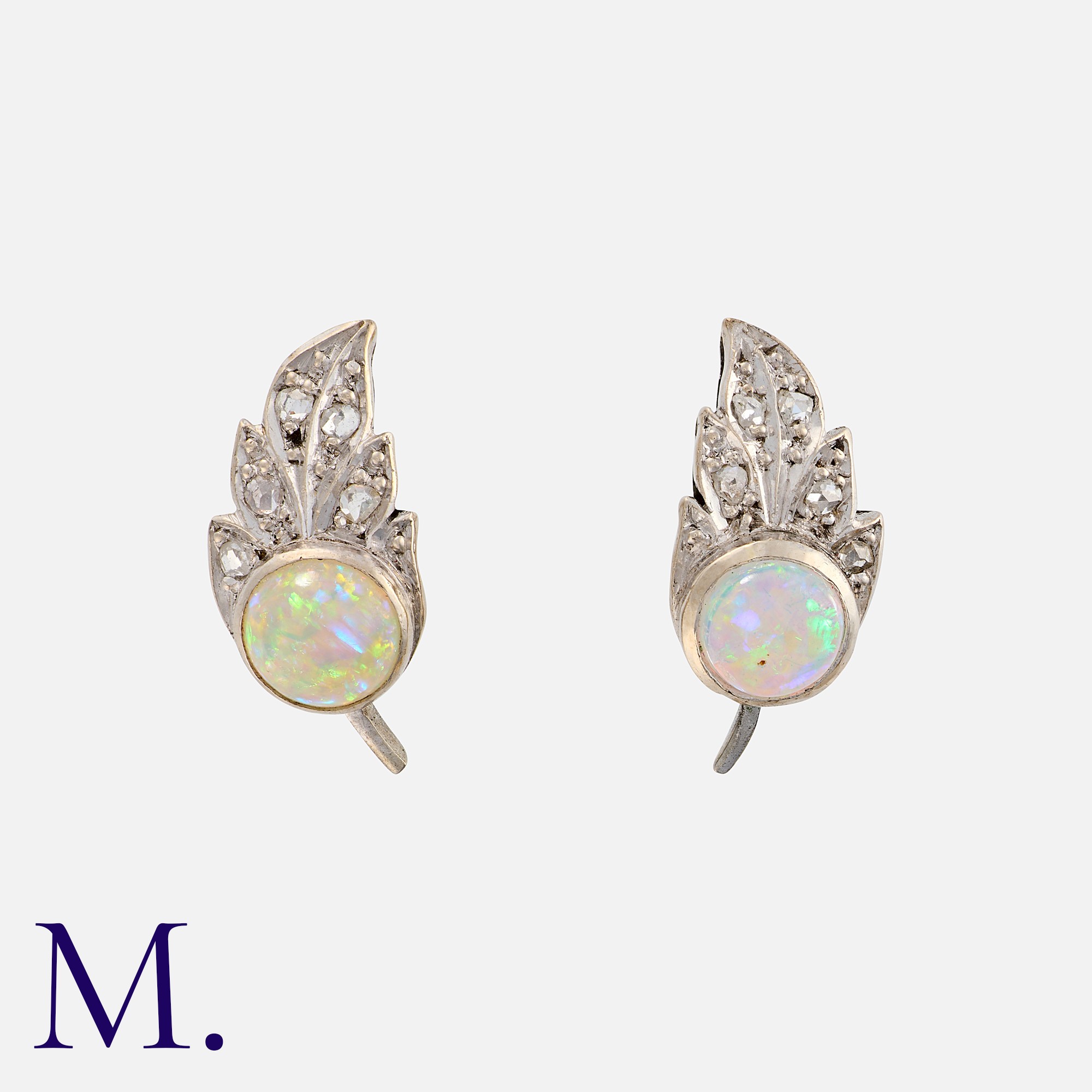 A Pair Of Opal And Diamond Earrings in white gold, of leaf design, set with a cabochon opal, accented by rose cut diamonds. Earrings Unmarked, tests indicate 14 carat gold. Earring backs marked 750 for 18 carat gold.
