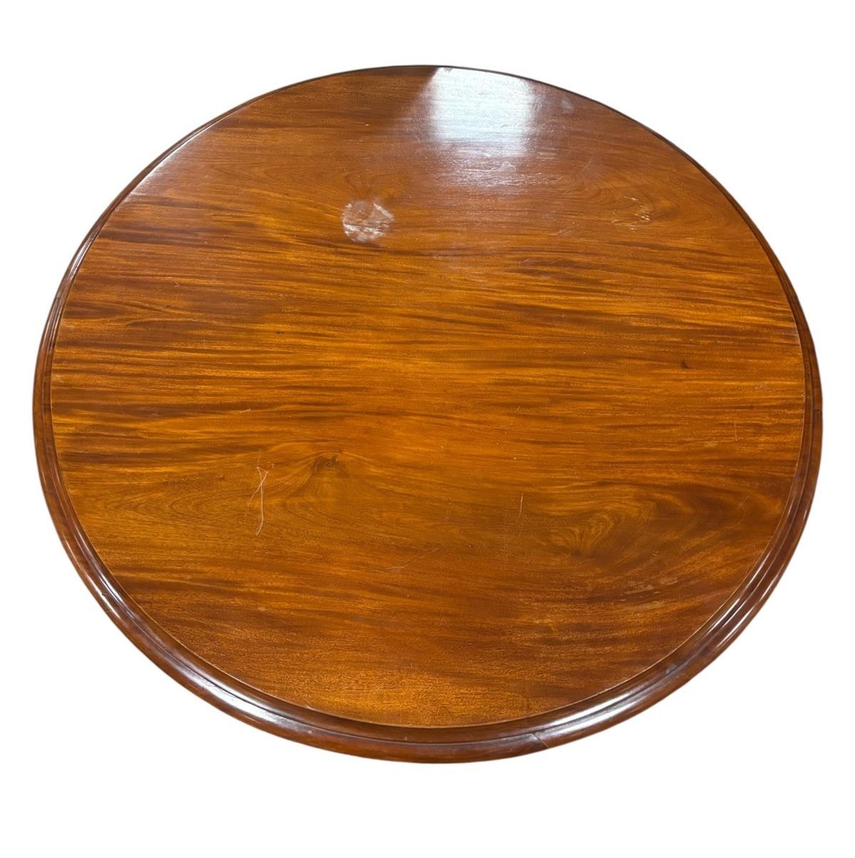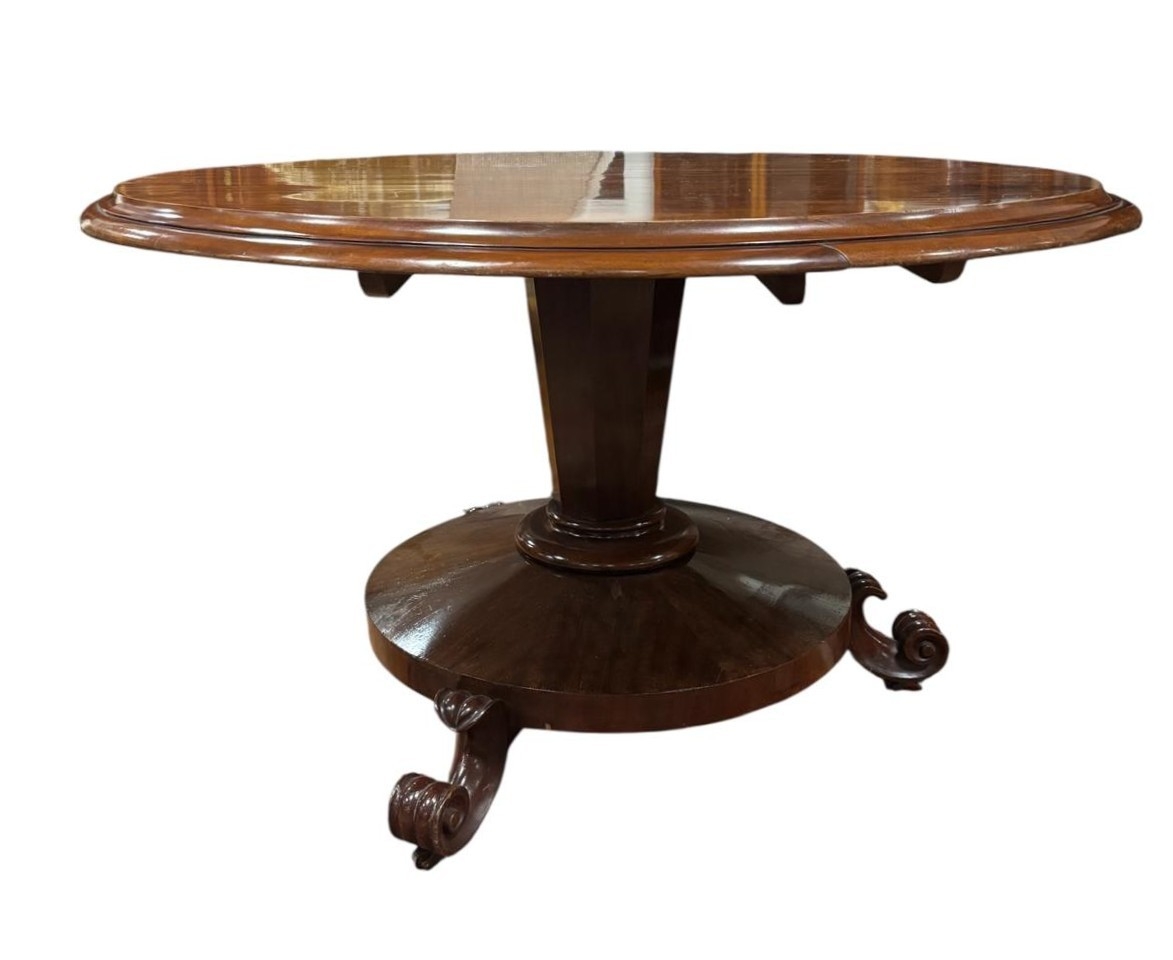 A 19TH CENTURY MAHOGANY SNAP TOP POD TABLE the circular moulded top above a faceted column on platform base with scroll toes 75cm (h) x 123cm (d)