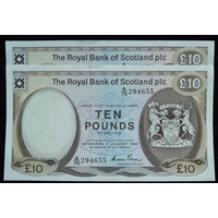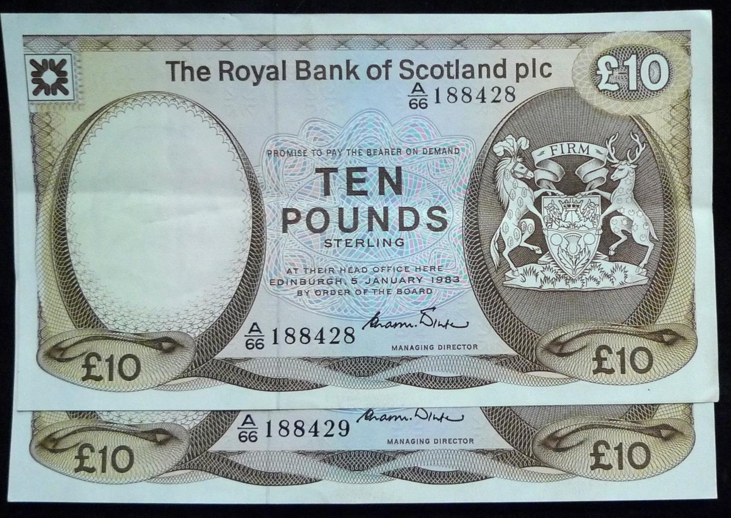 Royal Bank of Scotland plc. £10. (2) SC819 05.01.83. A/66 188428 - 429 consecutive. NEF.