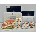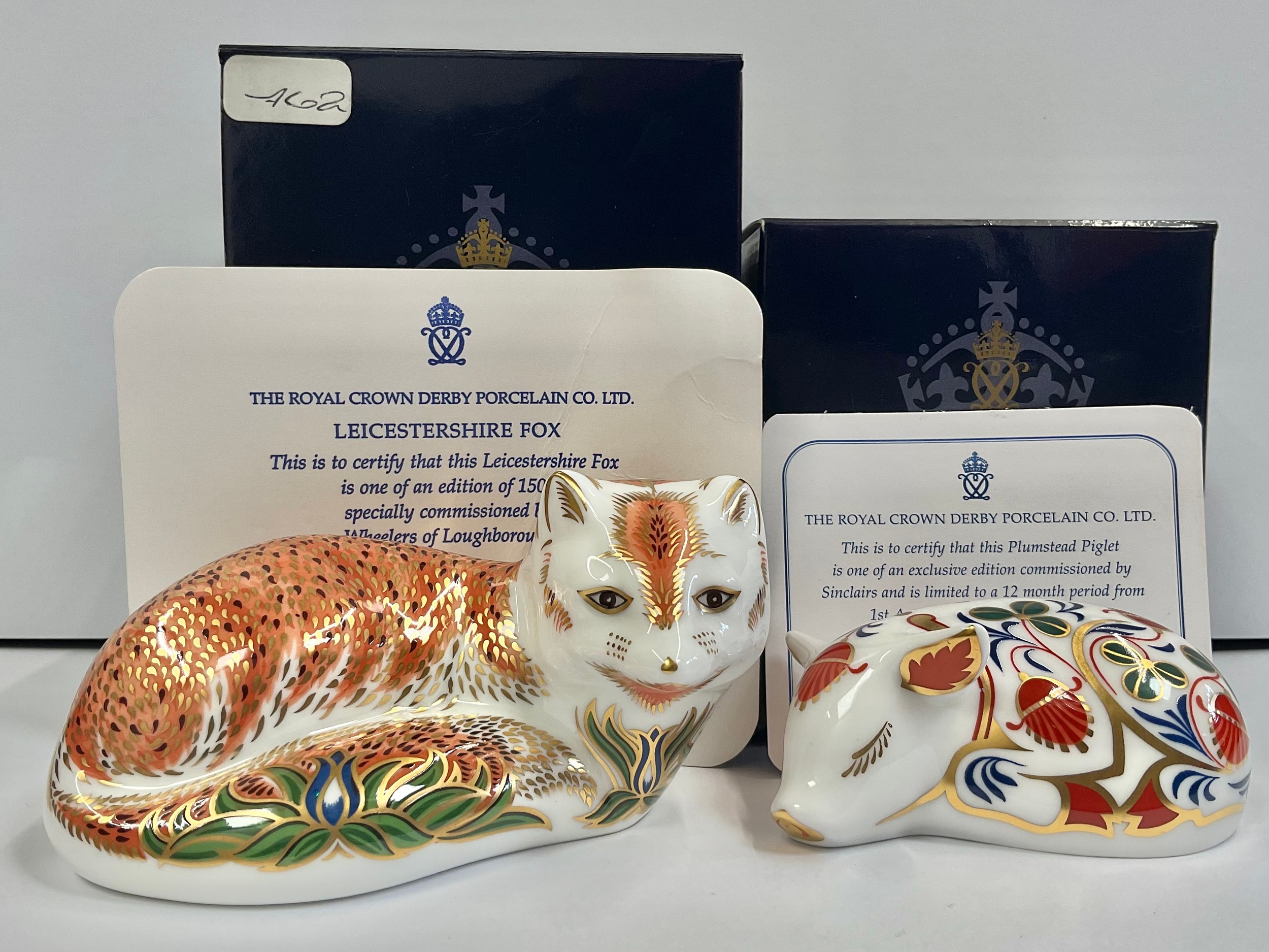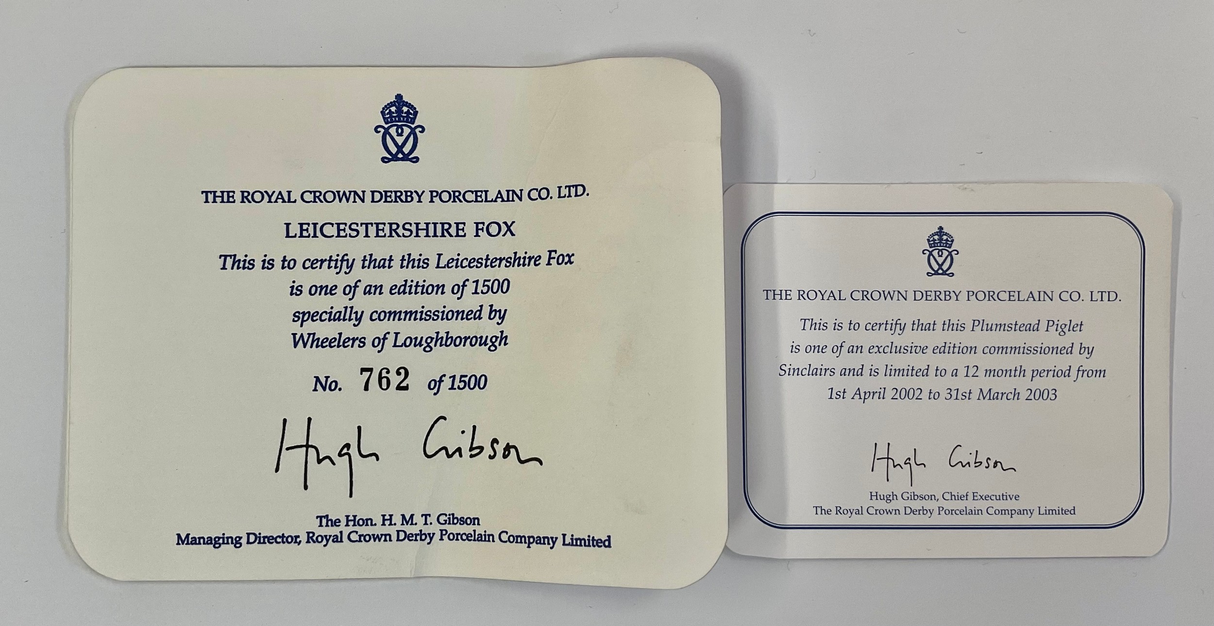A Royal Crown Derby paperweight, Leicestershire Fox, specially commissioned by Wheelers of Loughborough, limited edition 762/1,500, gold stopper, 10cm long, printed mark, signed in gold by Sue Rowe, certificate, boxed; another, Piglet, gold stopper, 8cm long, printed mark in red, associated certificate and box for another similar model the Plumstead Piglet (2)