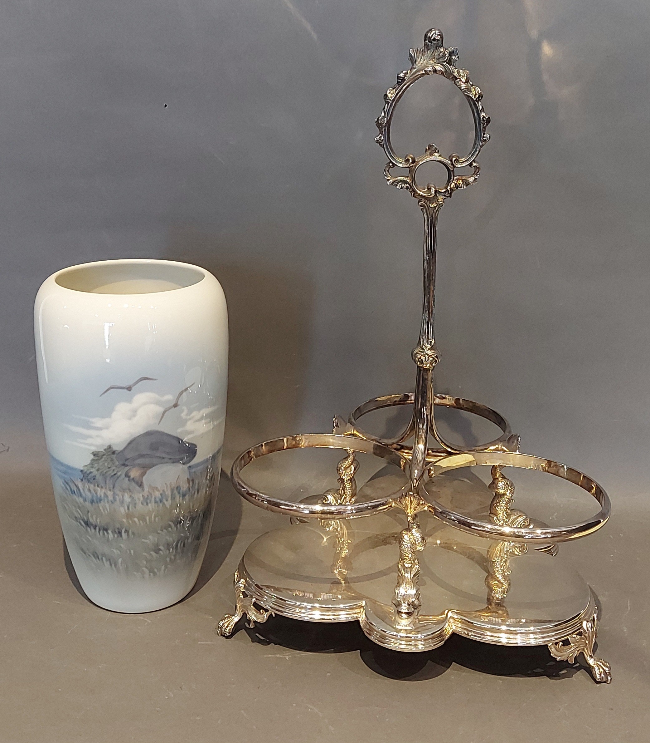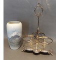 A silver plated decanter stand together with a Royal Copenhagen vase