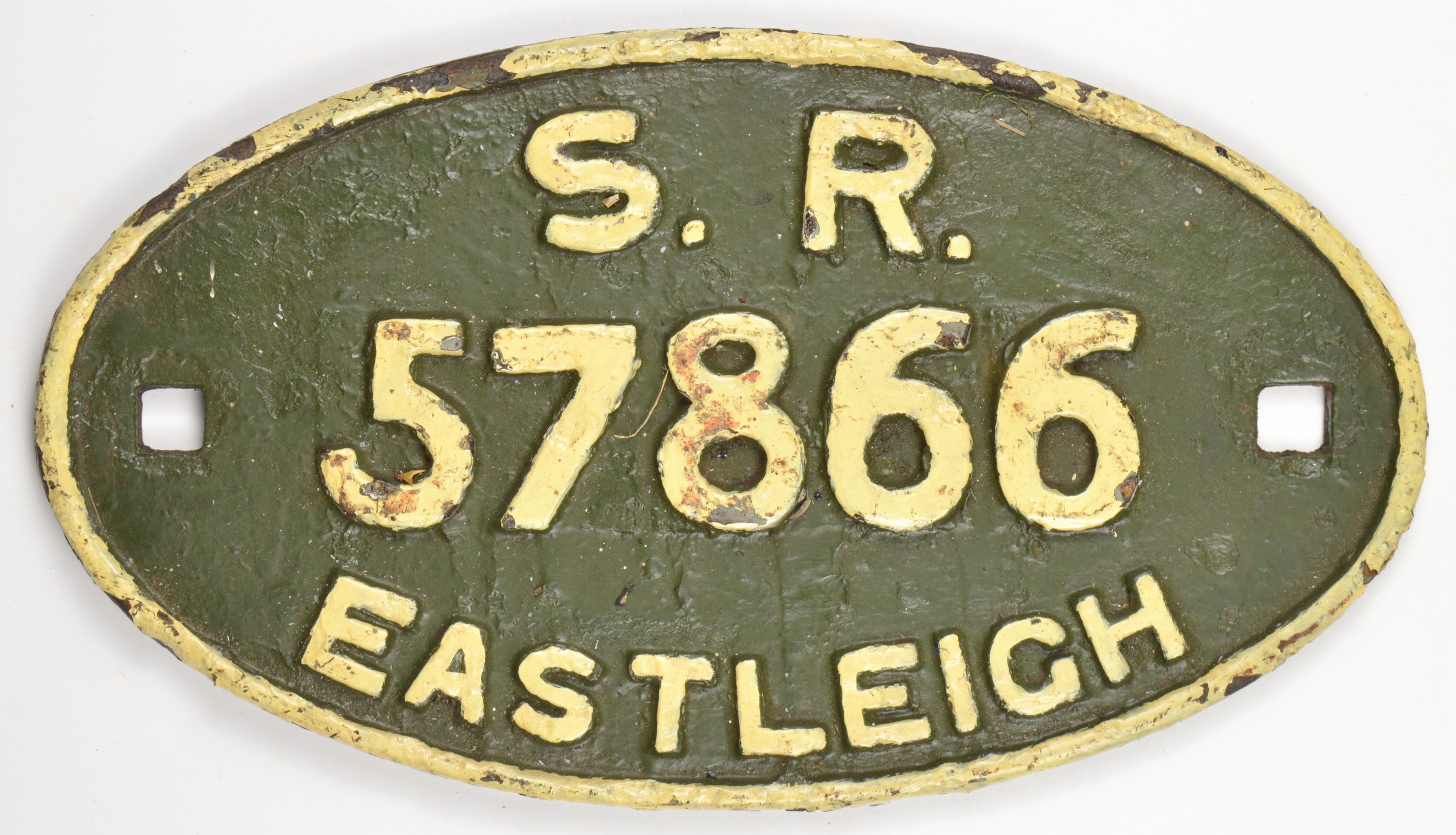 Wagon plate cast iron, SR Eastleigh 57866. this is from a 40t bogie bolster wagon, built to diagram 1598, built between April to September 1926. Repainted front. 13 1/2 x 7 1/2 inches. Shipping band - C.
