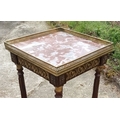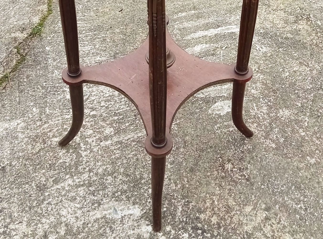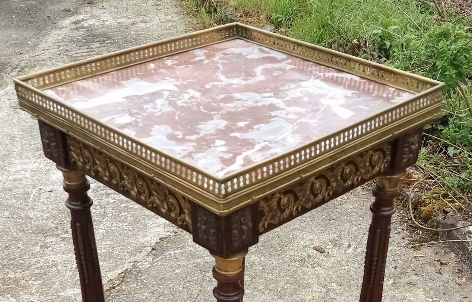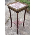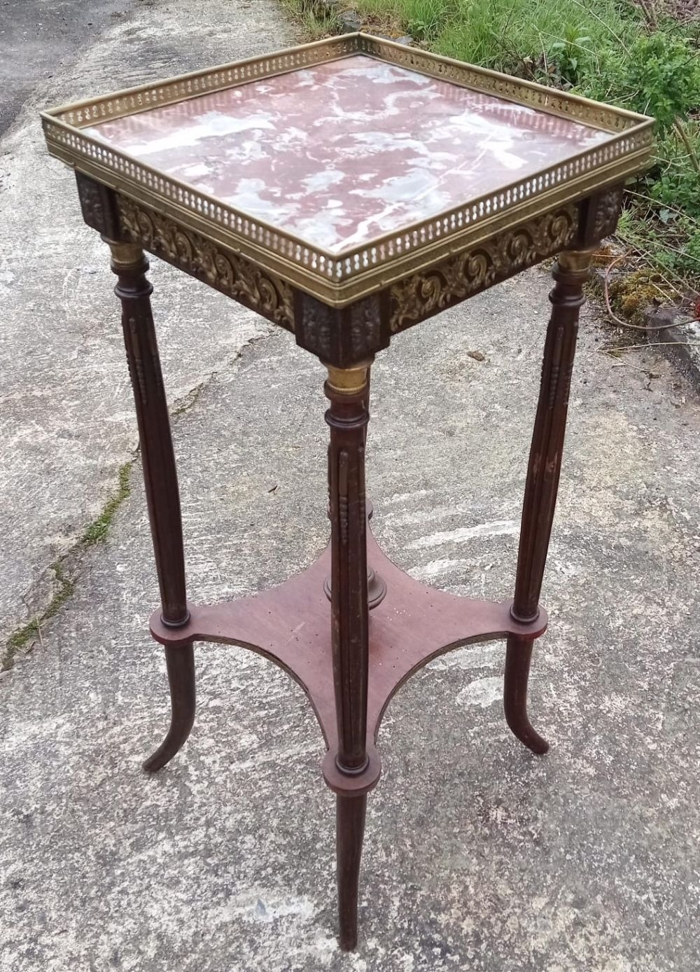 A FRENCH LATE 19TH CENTURY MARBLE TOPPED PEDESTAL TABLE, circa 1890, with raised brass gallery edge, decorated to the frieze with ormolu mounts, raised on fluted splayed legs united by a wide stretcher panel. Some wood restoration required - see photos. Dimensions: 75 x 41cm (H x W)