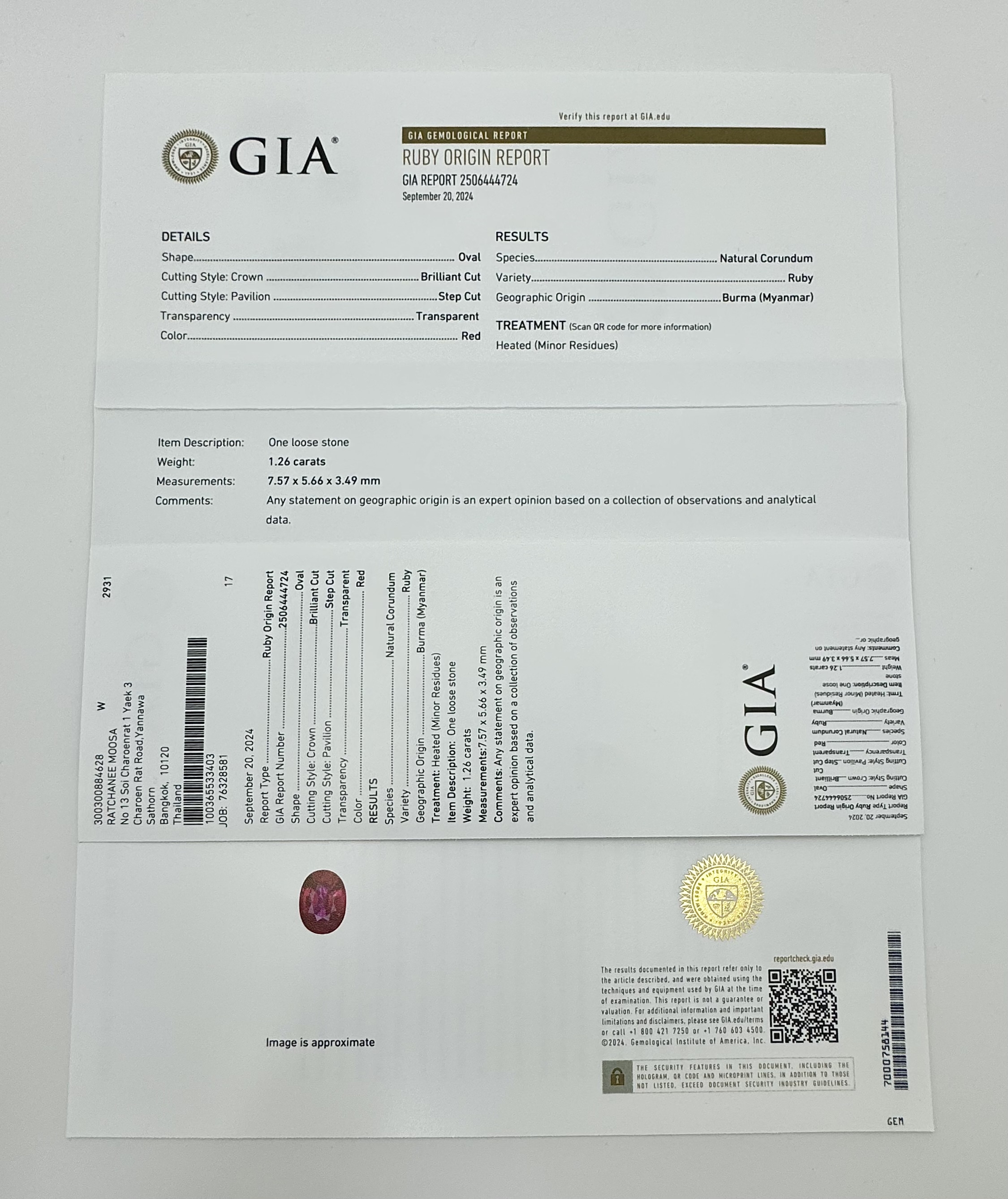 A 1.26ct Oval Natural Ruby Gemstone. Burma (Myanmar) origin. Heated (minor residues). Gemological Institute of America (GIA) certified under report no. 2506444724. A rare collector’s gem.
