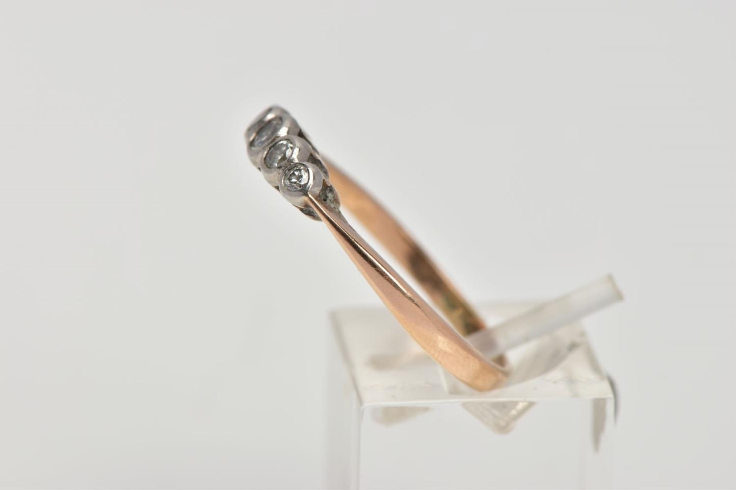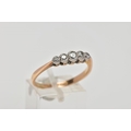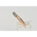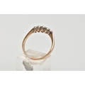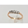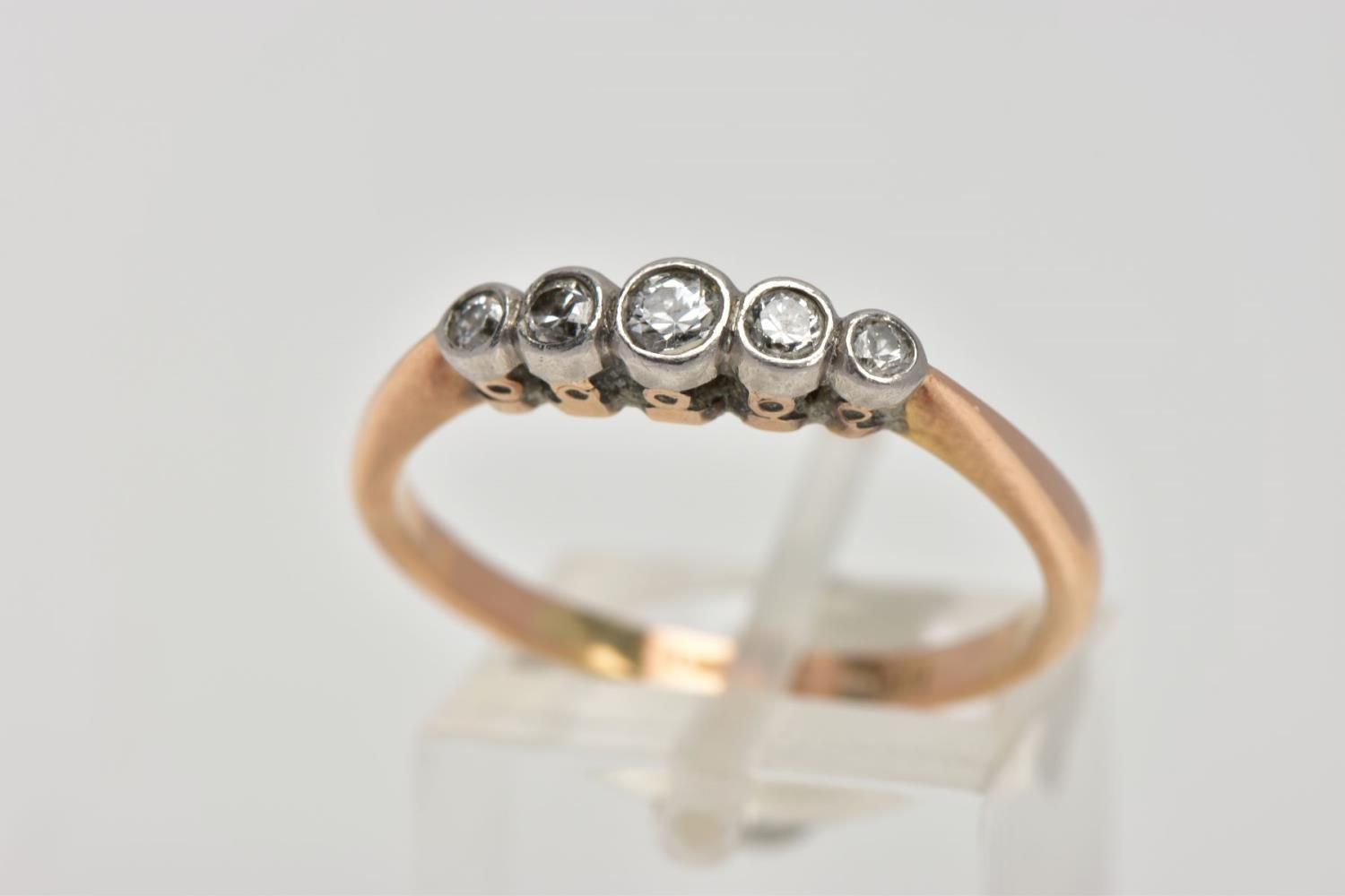 A YELLOW METAL FIVE STONE DIAMOND RING, designed with five graduated round brilliant cut diamonds, estimated total diamond weight 0.28cts, collet mounted, tapered shoulders, plain polished band stamped 'Plat 18ct', ring size U 1/2, approximate gross weight 3.0 grams (condition report: diamonds in good condition, would benefit from a gentle clean, general light)