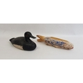 Painted wooden decoy duck with glass eyes, with paper label to base inscribed 'Little Broad Bill, Date and Maker Unknown, Eastern Lake, Ontario', 29cm long and a painted carved wooden fish, 34cm long (2)