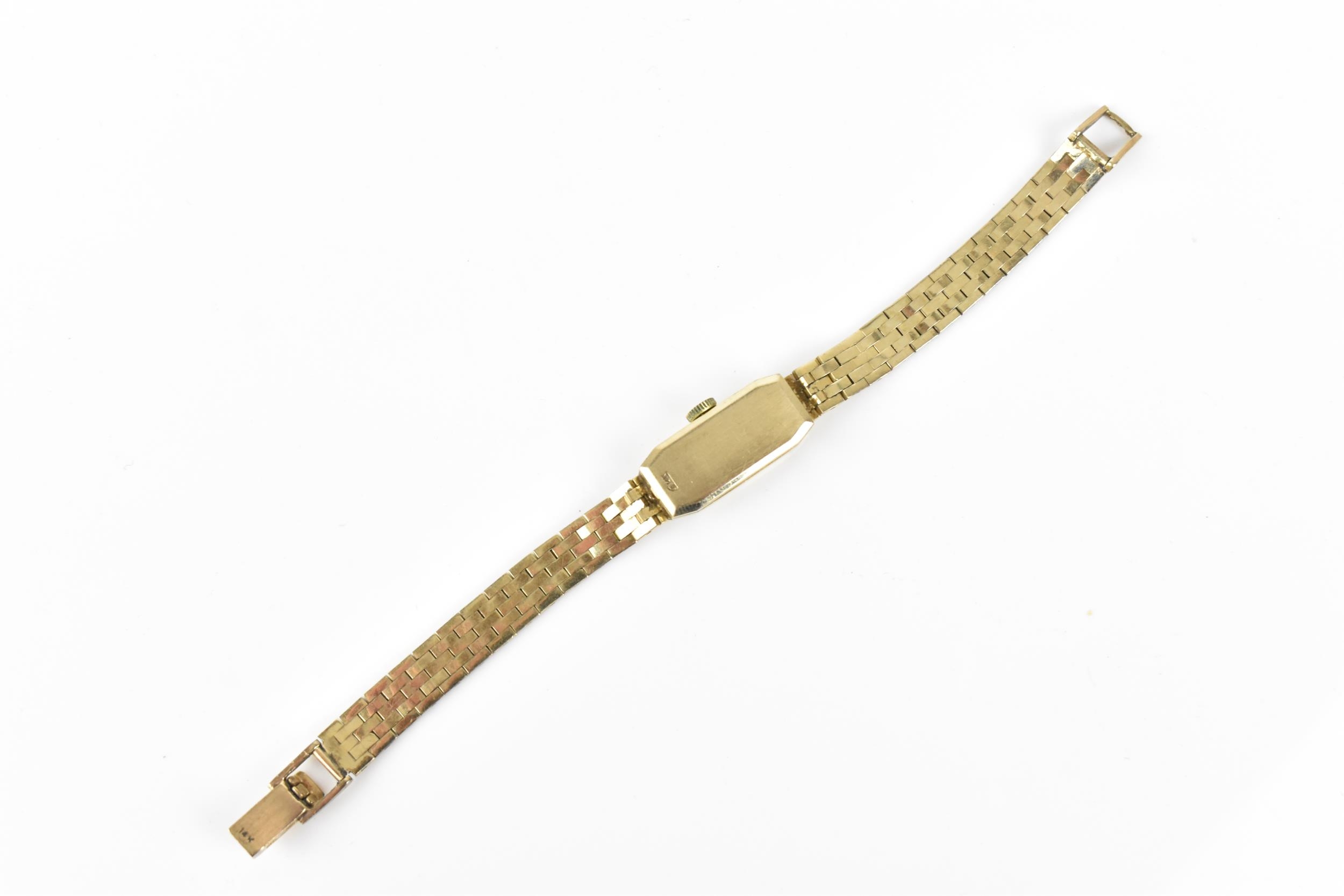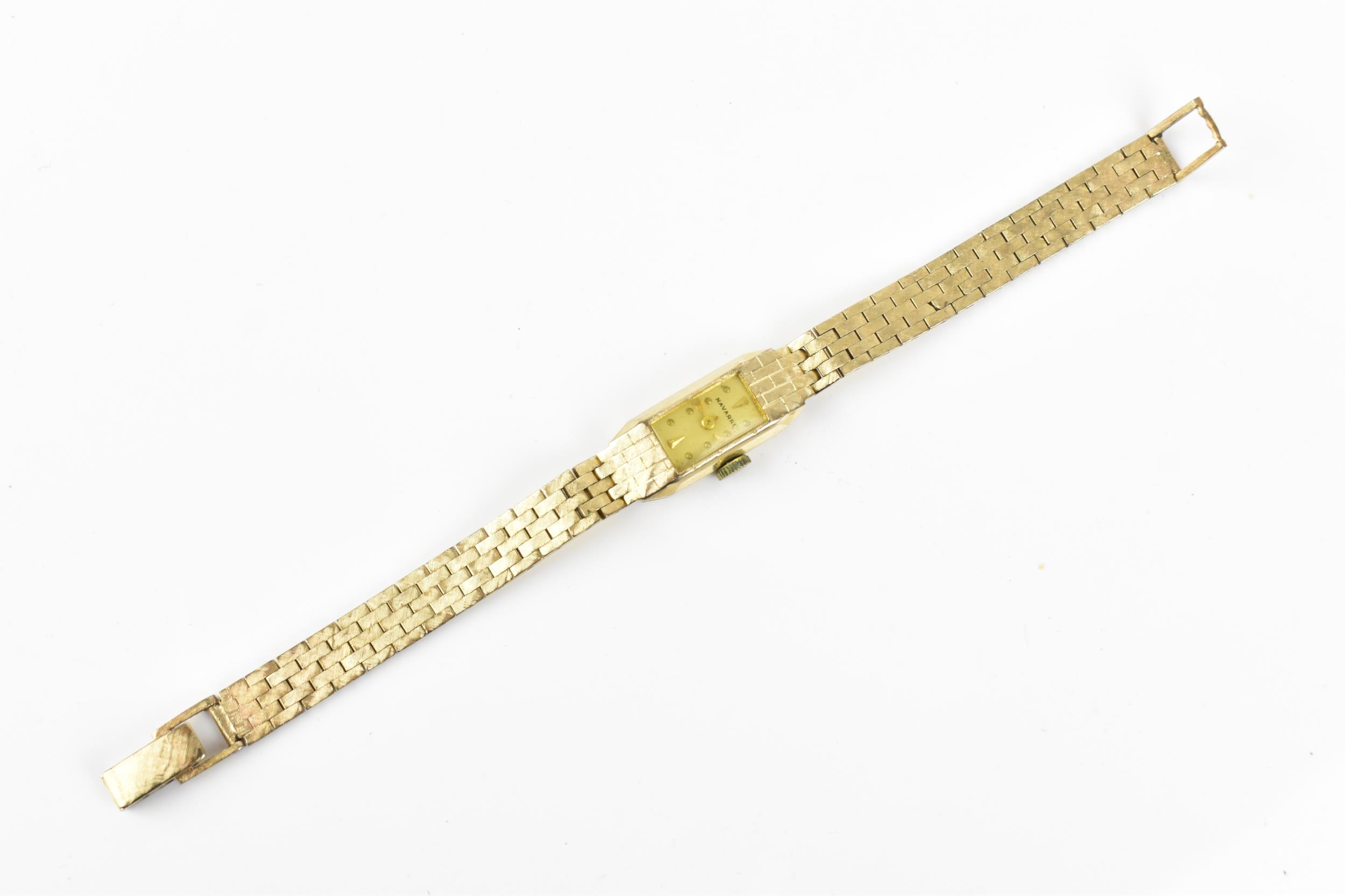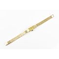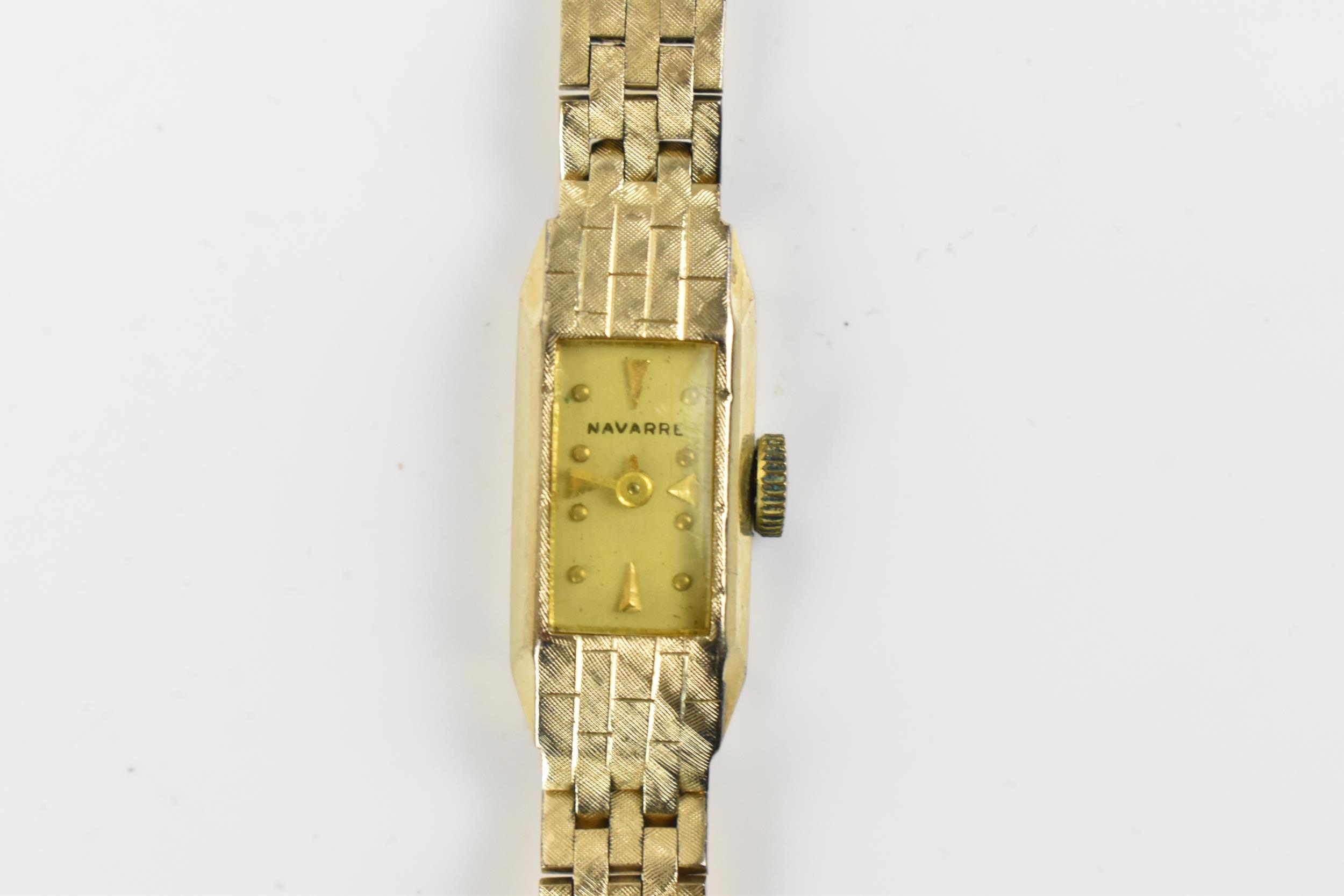 A Navarre, manual wind, ladies, 14ct gold wristwatch, having a signed gilt dial, integral textured 14ct gold bracelet, 10.5mm x 22.5mm, 18.25 grams