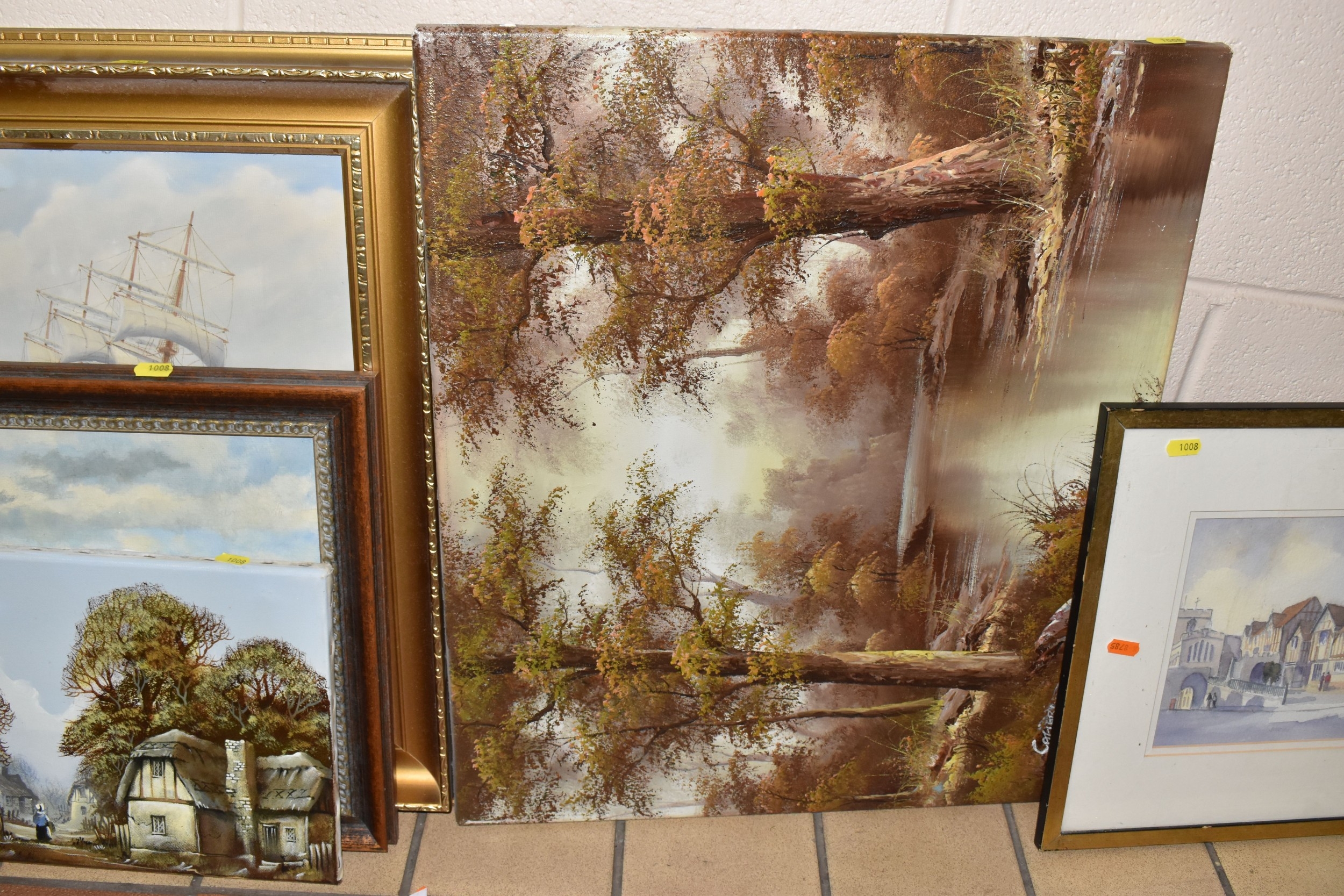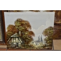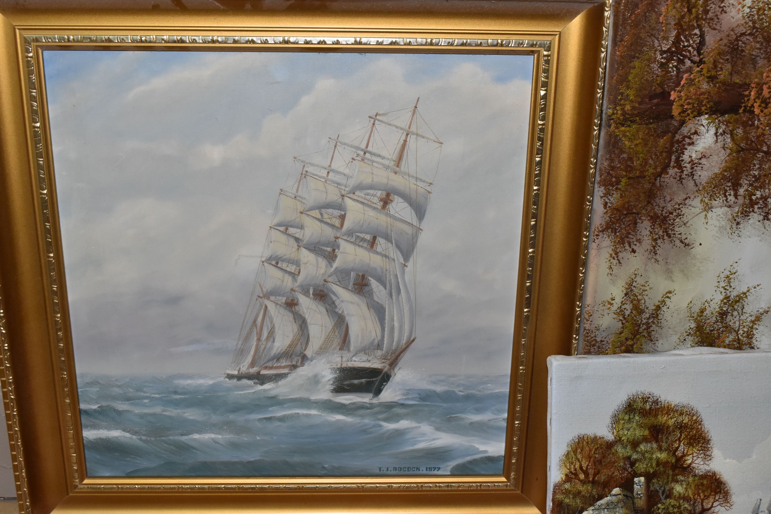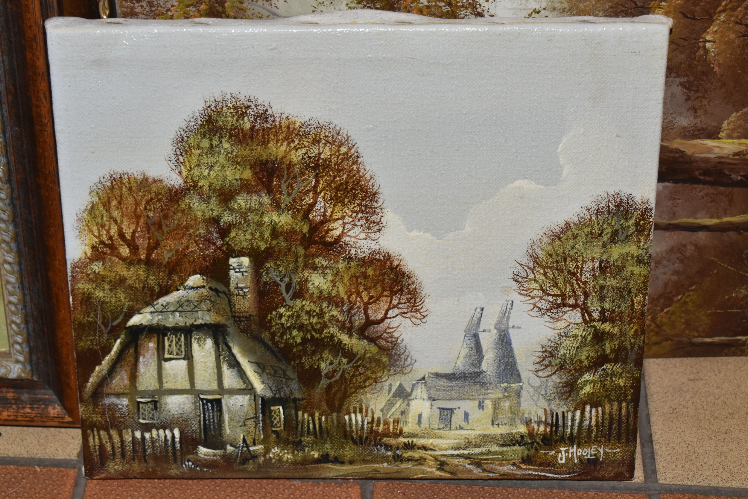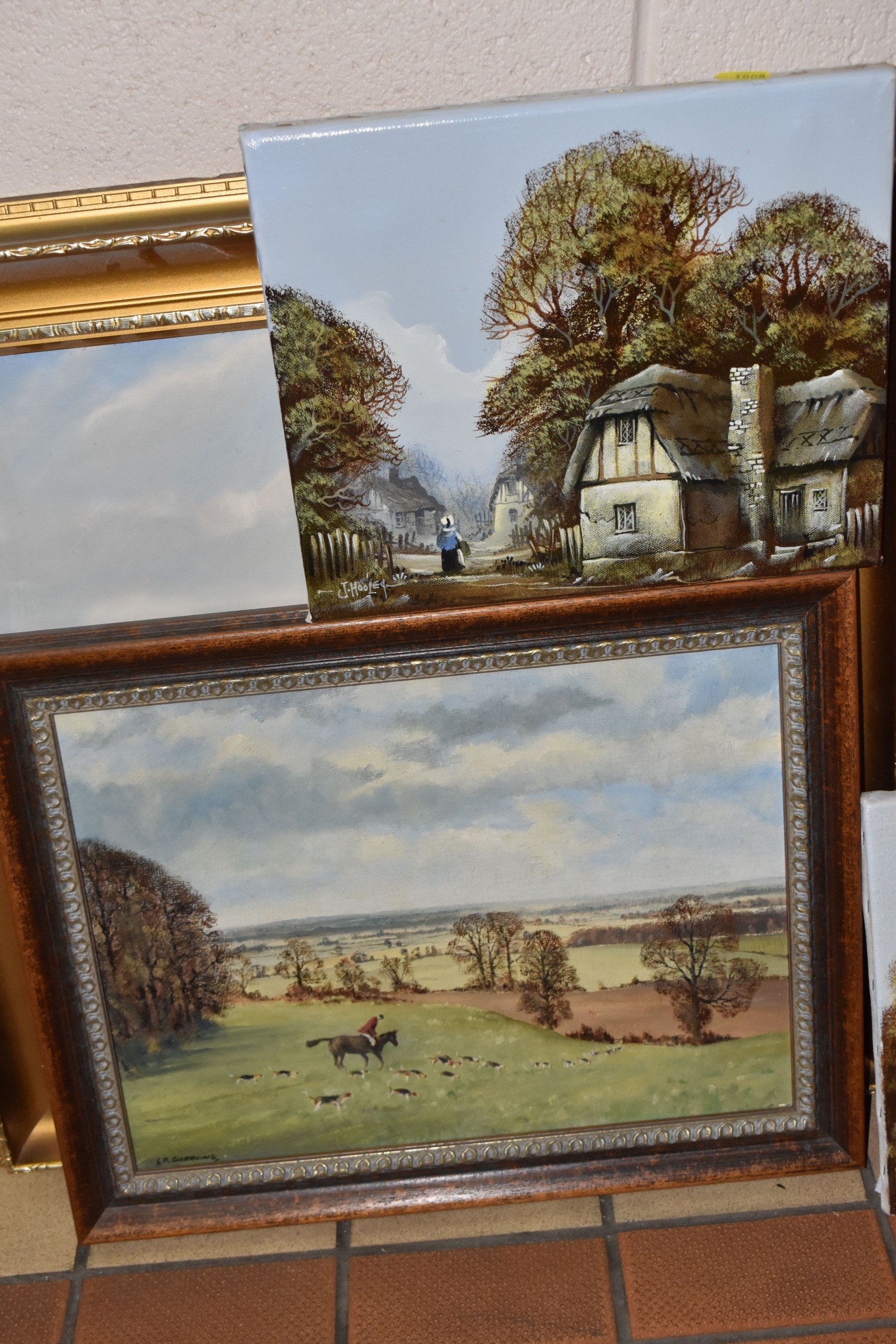 A COLLECTION OF 20TH CENTURY PAINTINGS, comprising a T.J. Adcock maritime scene of a ship under sail, signed and dated 1977, oil on board, approximate size 45cm x 45cm, two unframed 19th century stye village views with thatched cottages signed J. Hooley, oil on canvas approximate size 25cm x 30cm, an oil on board hunting scene across open fields signed L.R. Greening, an unframed oil on canvas landscape with river signed Cafieri, a watercolour of Lord Leycester's Hospital signed J. Bennett, a watercolour of The Four Points Inn - Aldworth signed R.C. Brown, an indistinctly signed watercolour of a continental village and an indistinctly signed oil on canvas landscape with river - needs a clean