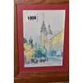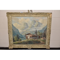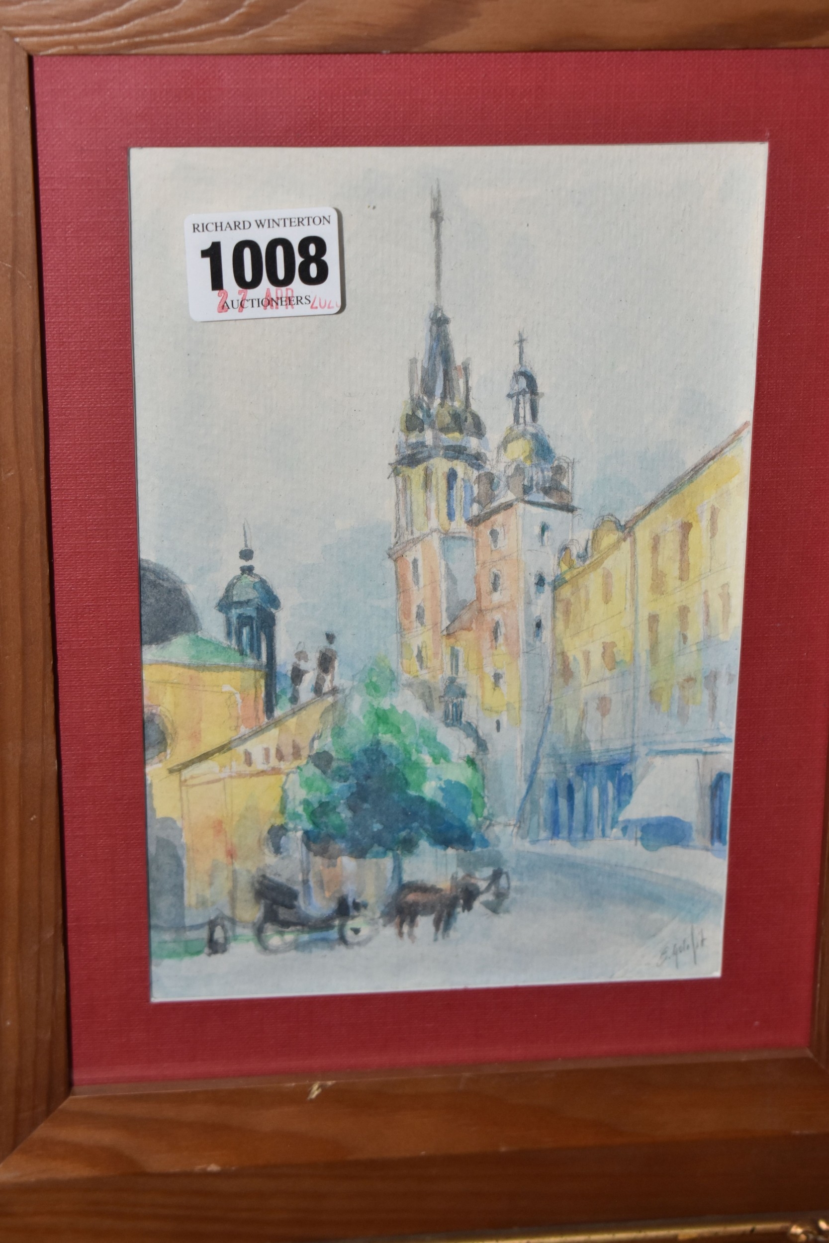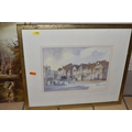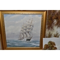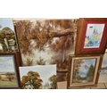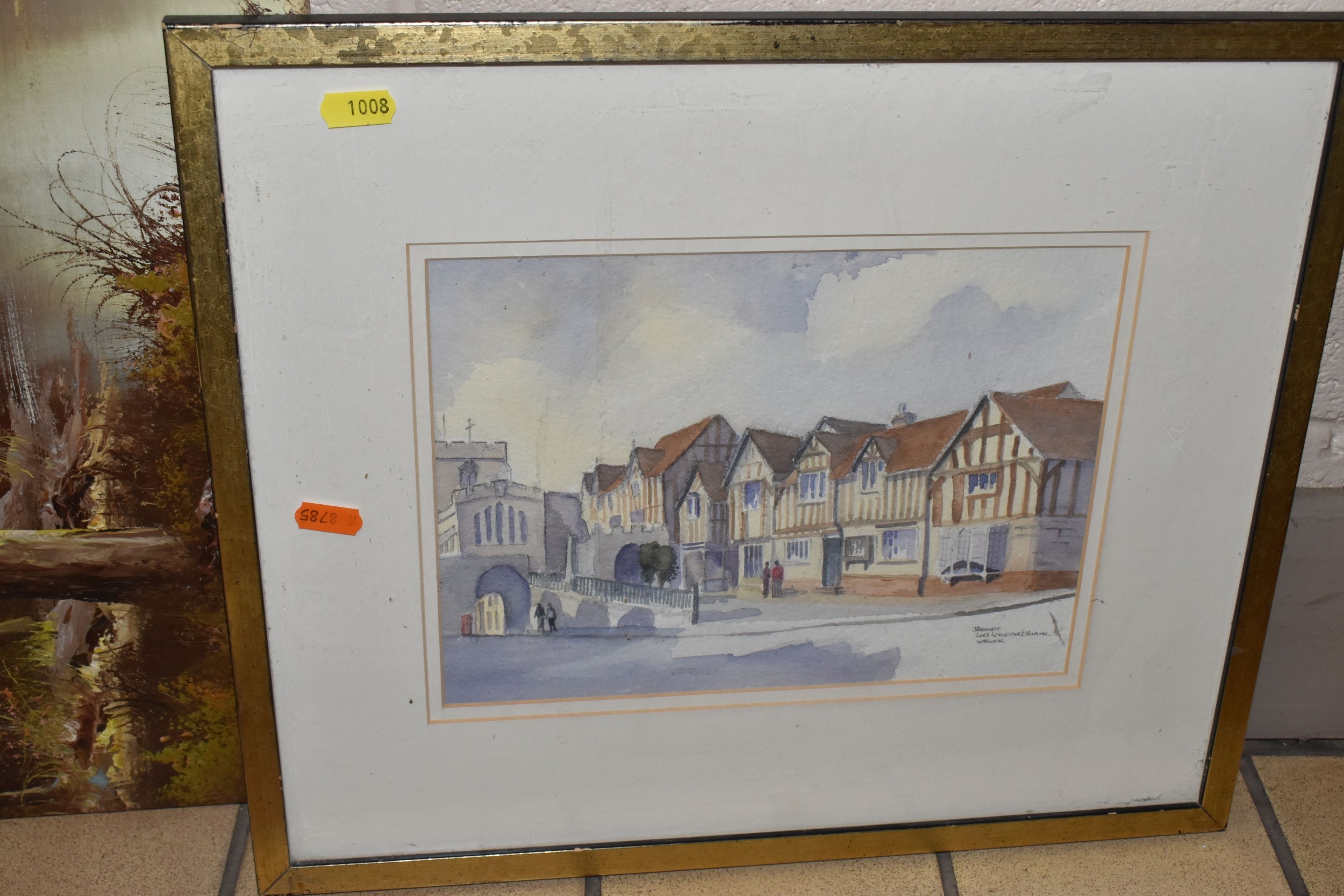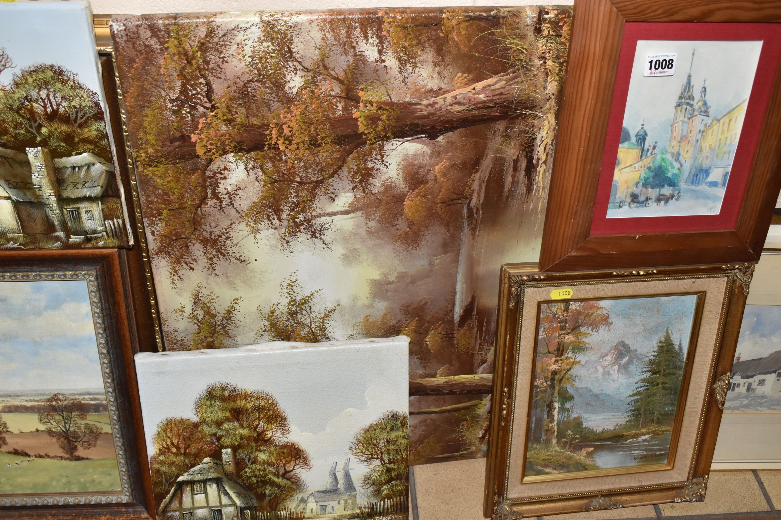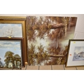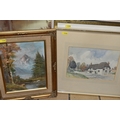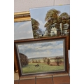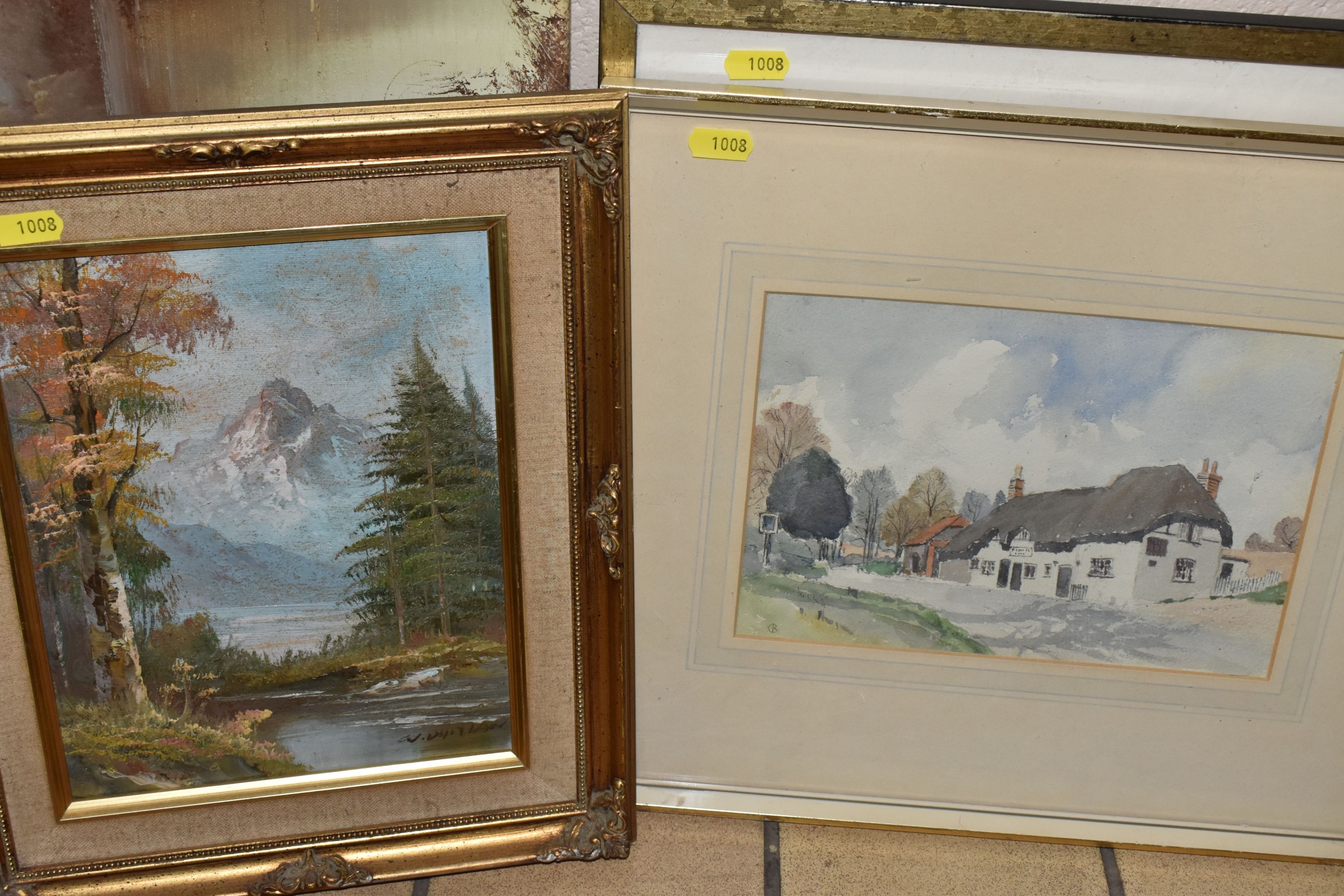 A COLLECTION OF 20TH CENTURY PAINTINGS, comprising a T.J. Adcock maritime scene of a ship under sail, signed and dated 1977, oil on board, approximate size 45cm x 45cm, two unframed 19th century stye village views with thatched cottages signed J. Hooley, oil on canvas approximate size 25cm x 30cm, an oil on board hunting scene across open fields signed L.R. Greening, an unframed oil on canvas landscape with river signed Cafieri, a watercolour of Lord Leycester's Hospital signed J. Bennett, a watercolour of The Four Points Inn - Aldworth signed R.C. Brown, an indistinctly signed watercolour of a continental village and an indistinctly signed oil on canvas landscape with river - needs a clean