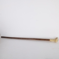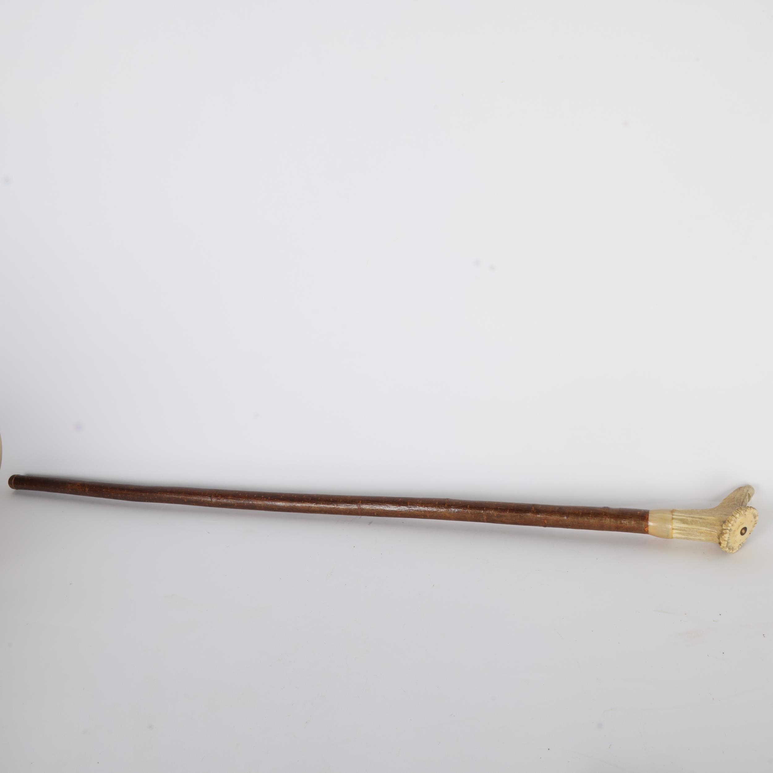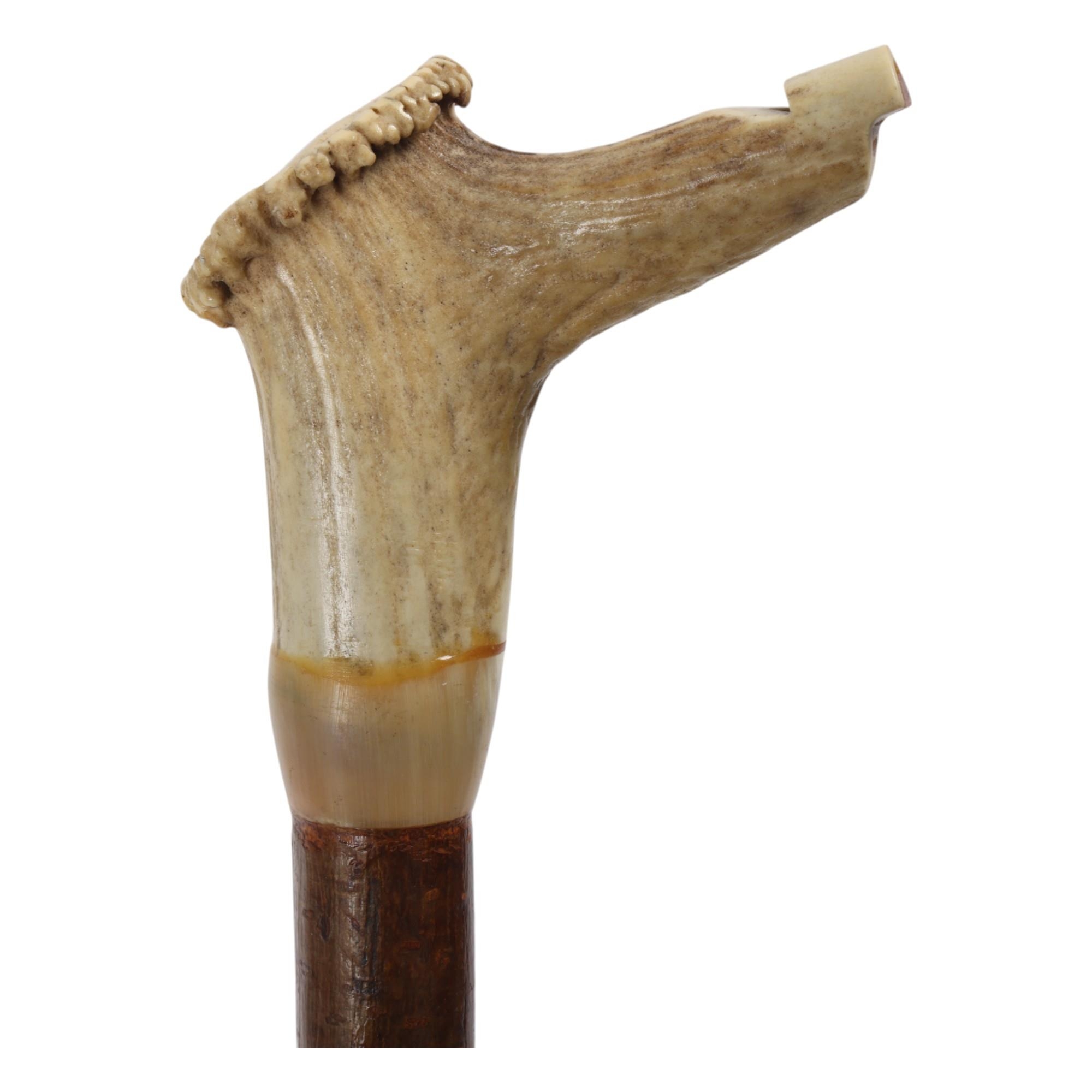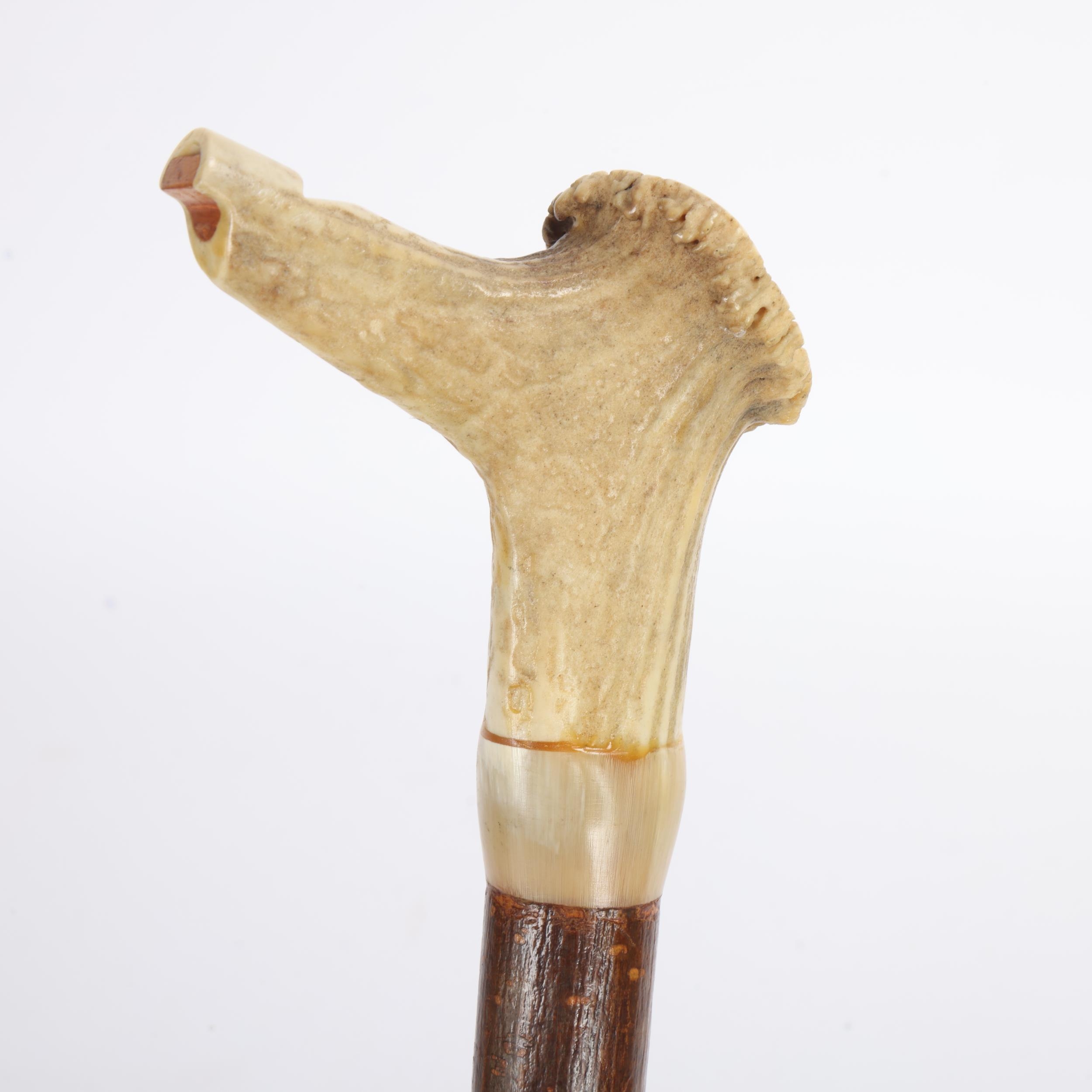 A Hunting cane with stag antler handle carved with a whistle and inlaid with a polished cow horn disc, blonde cow horn washer, hazel wood shaft, copper ferrule, British, length 98cm