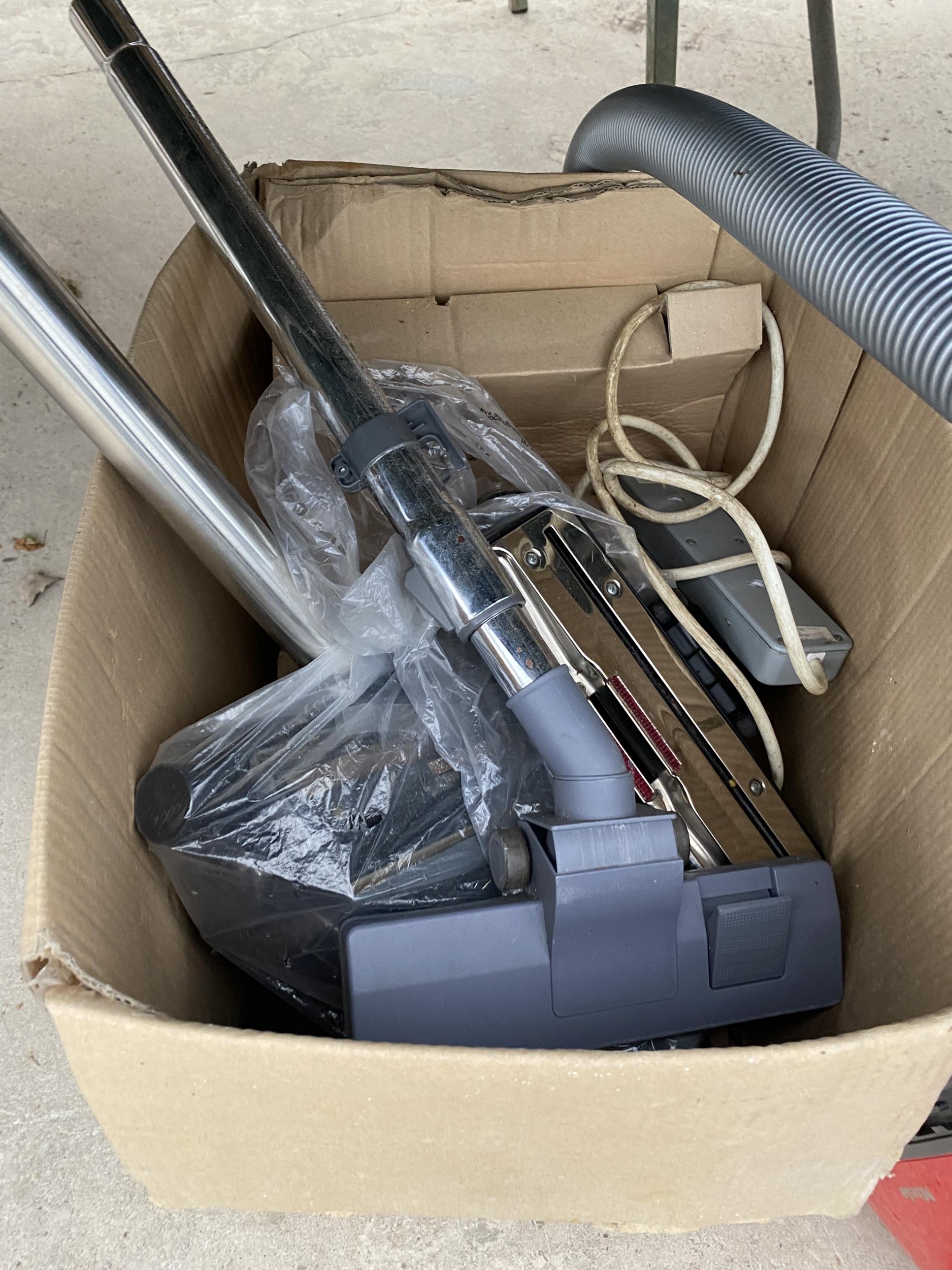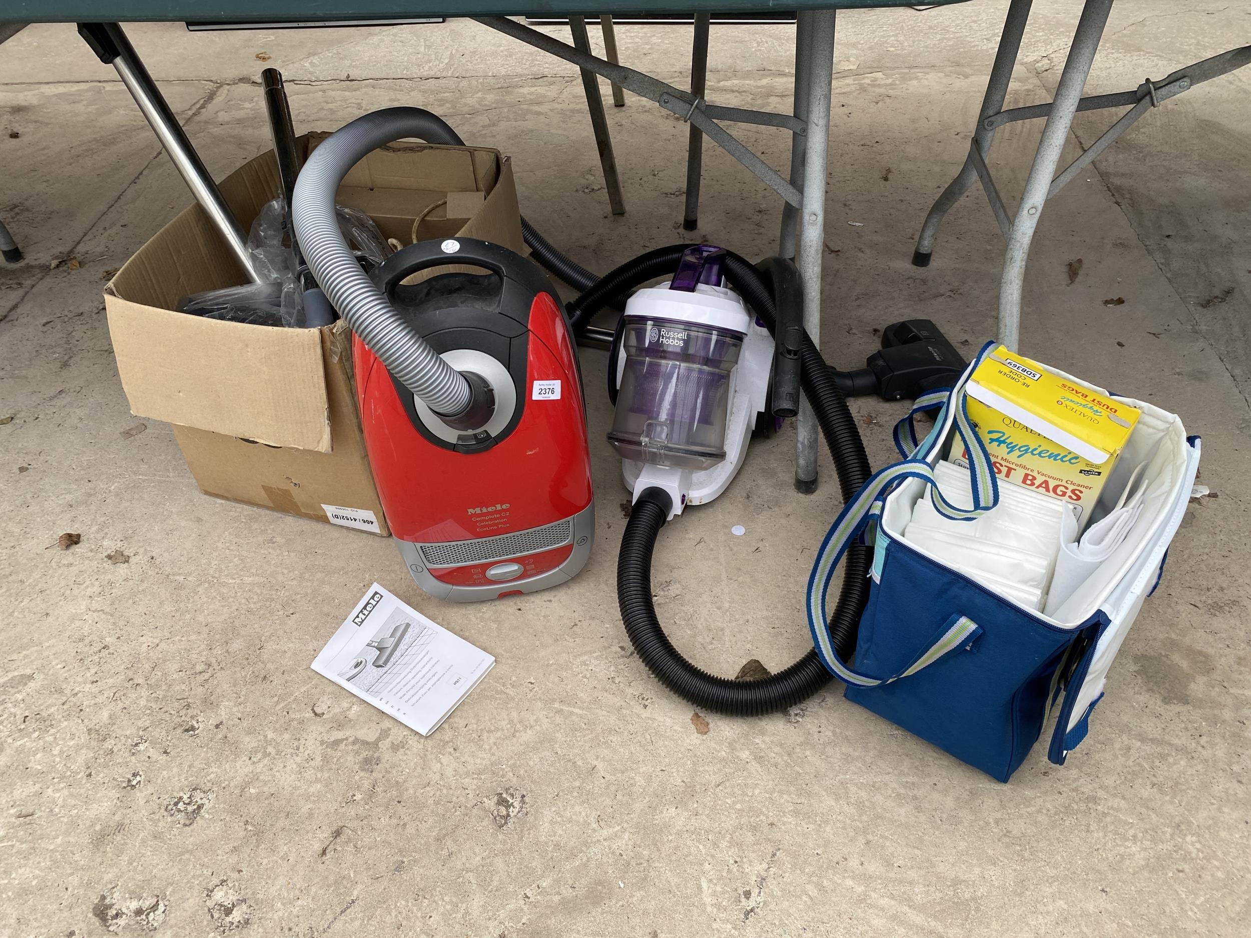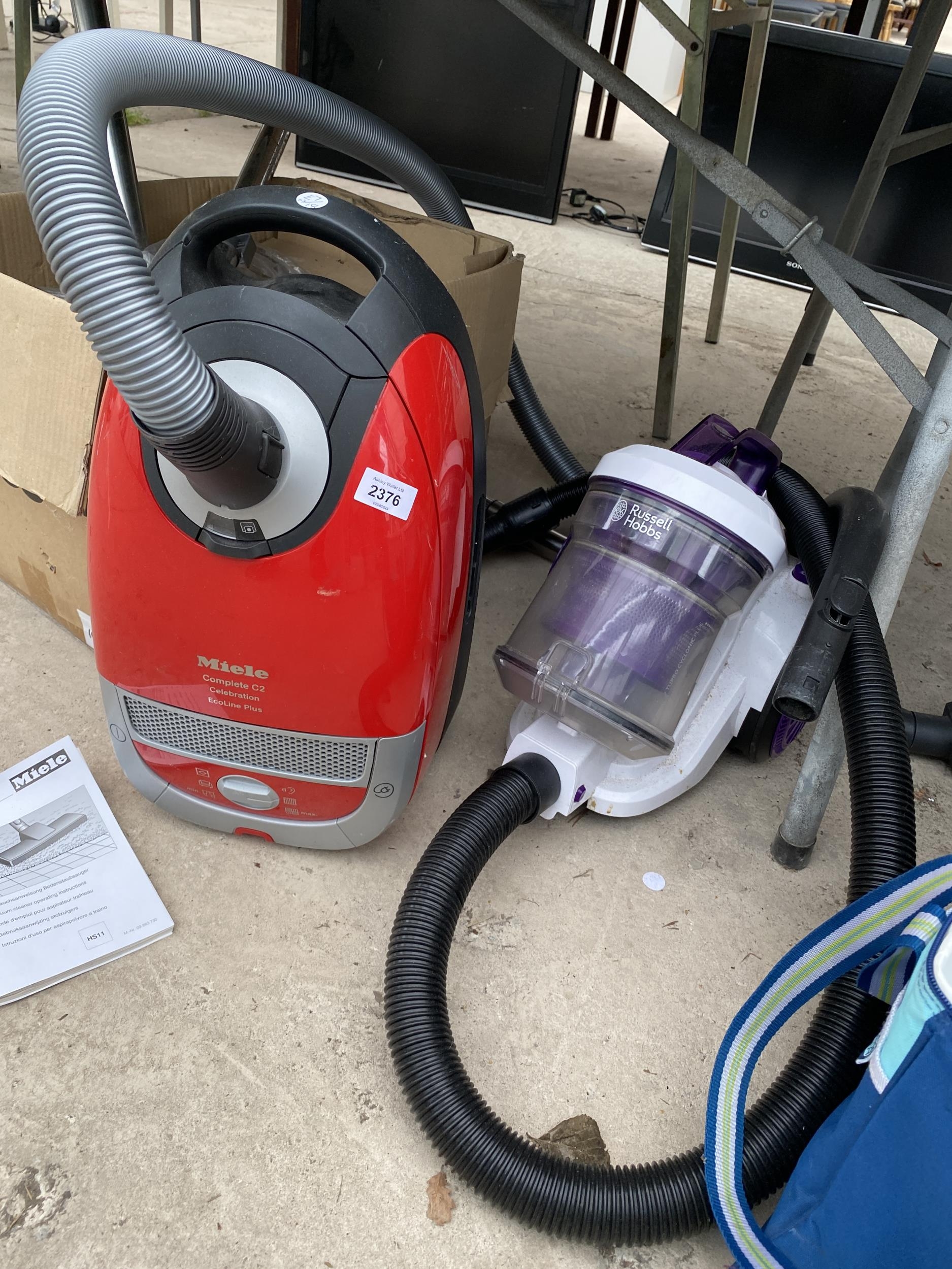 TWO VACUUM CLEANERS TO INCLUDE A MIELE AND A RUSSELL HOBBS AND AN ASSORTMENT OF ATTATCHMENTS