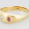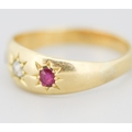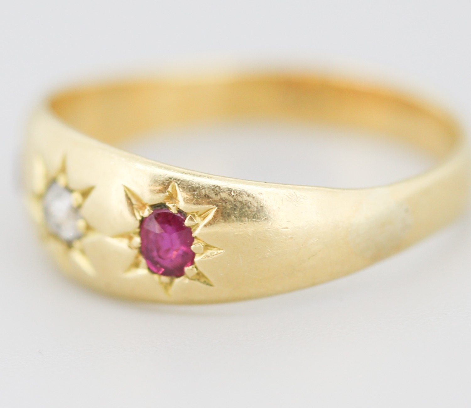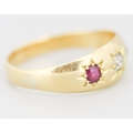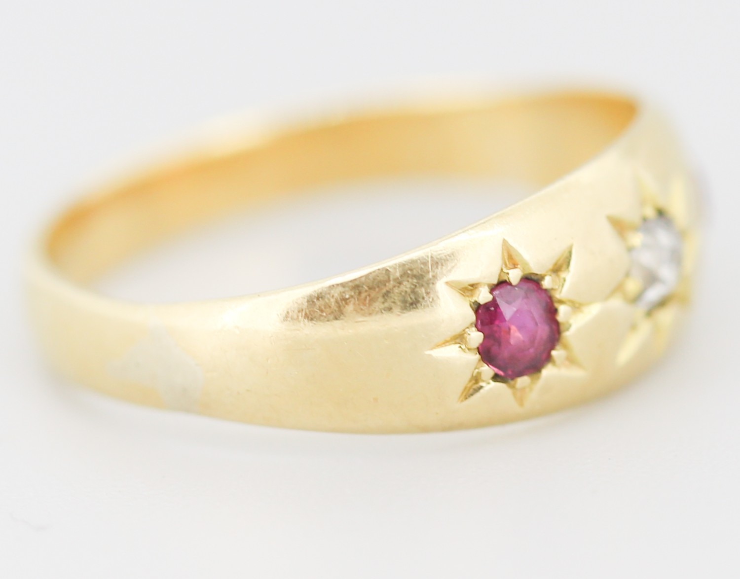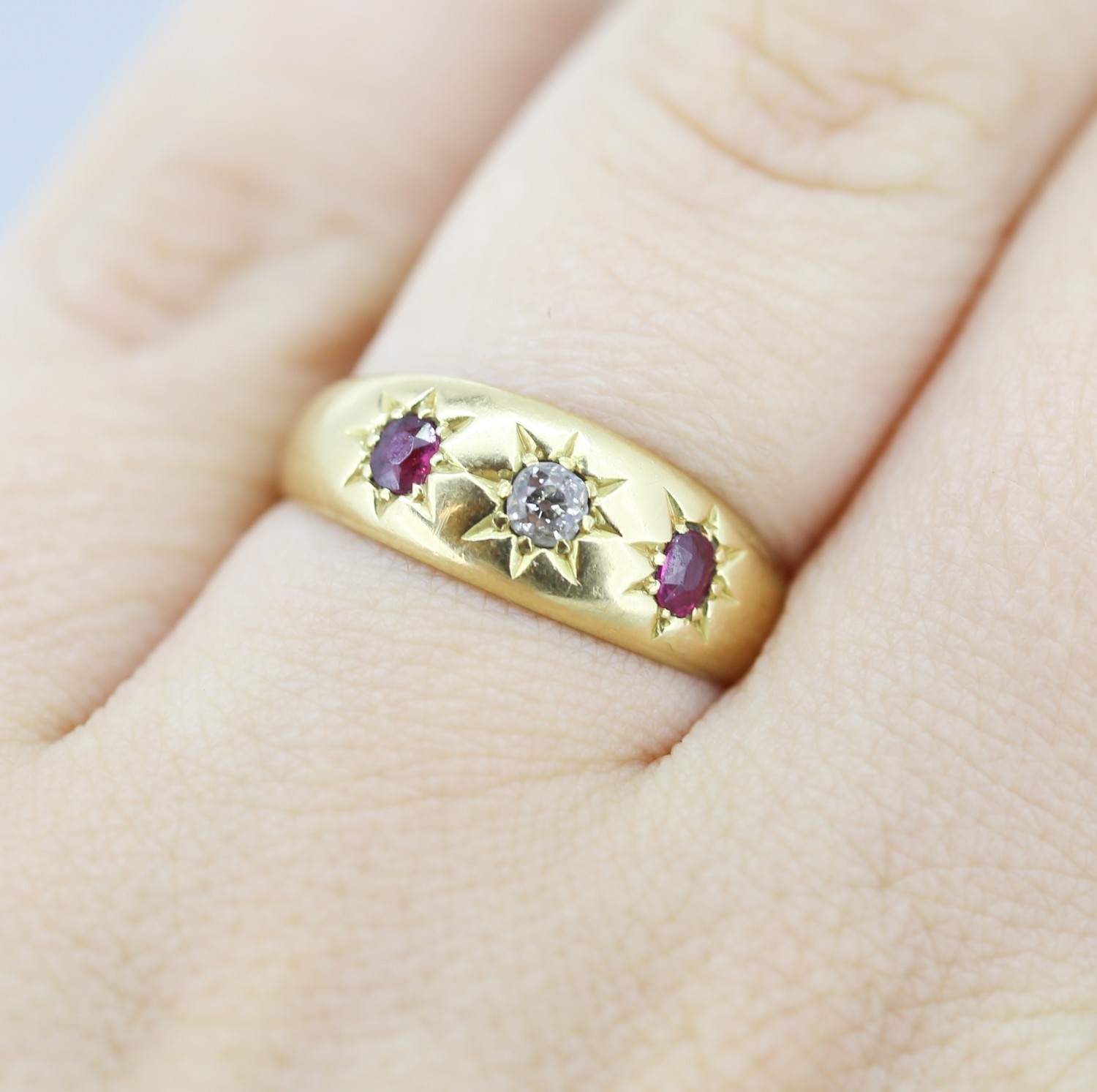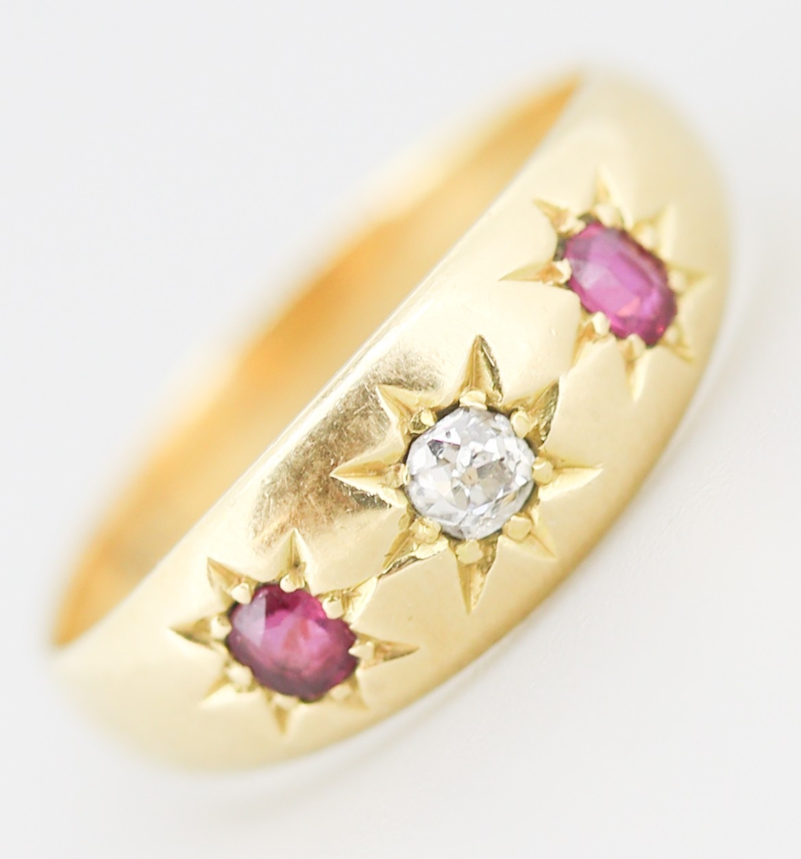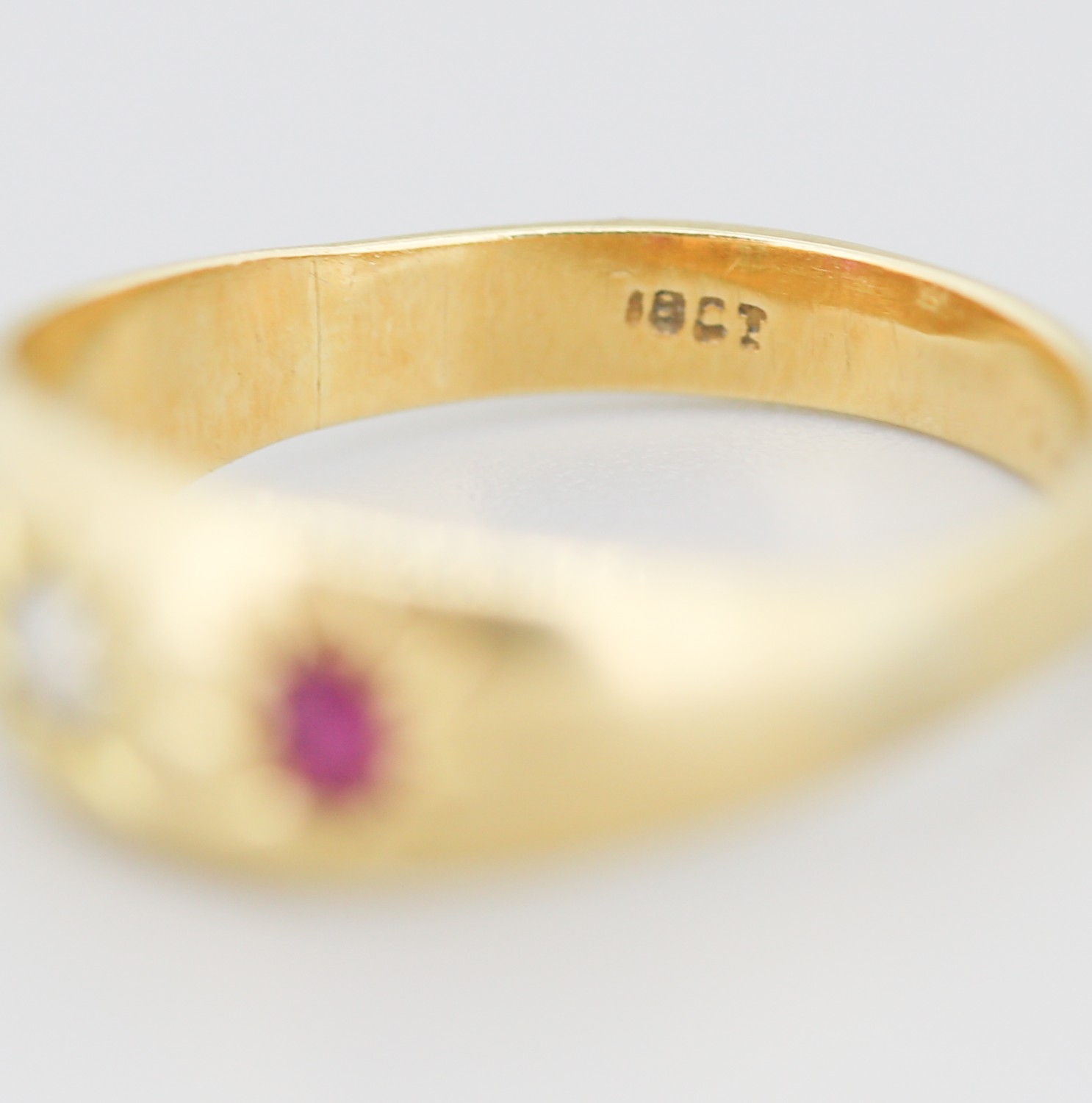 Attractively Detailed Ruby and Diamond Set Three Stone Ring Mounted in 18 Carat Yellow Gold Ring Size O