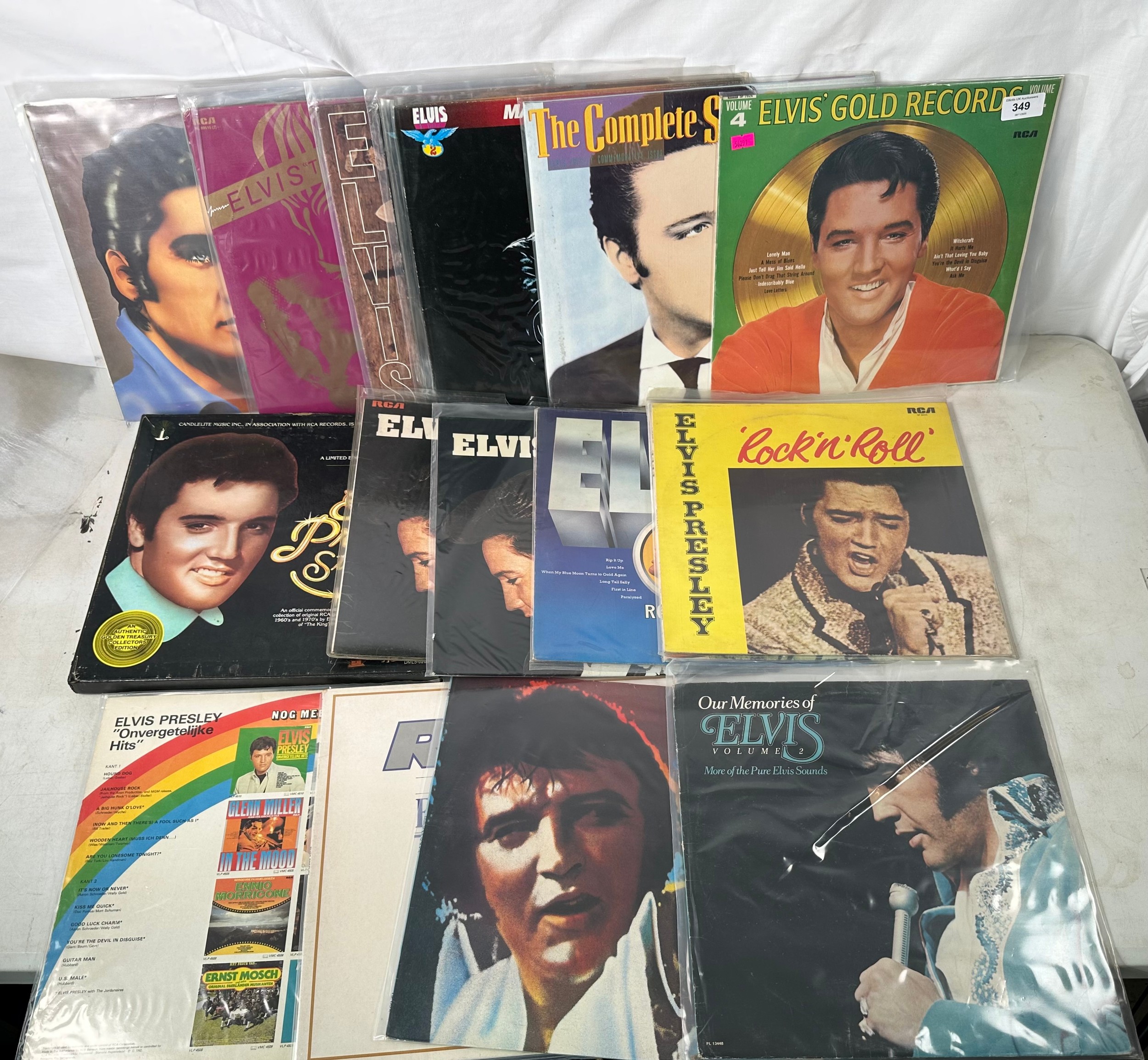 Selection of Elvis records to include Elvis Gold Records SF 7924 (LSP 3921), Maxi 45 Tours PC 8405, The Complete Sun Sessions PL86414(2), Guitar Man RCAK 5010, Elvis The Pelvis NL 89515(2), Flaming Star CDS 1185 etc