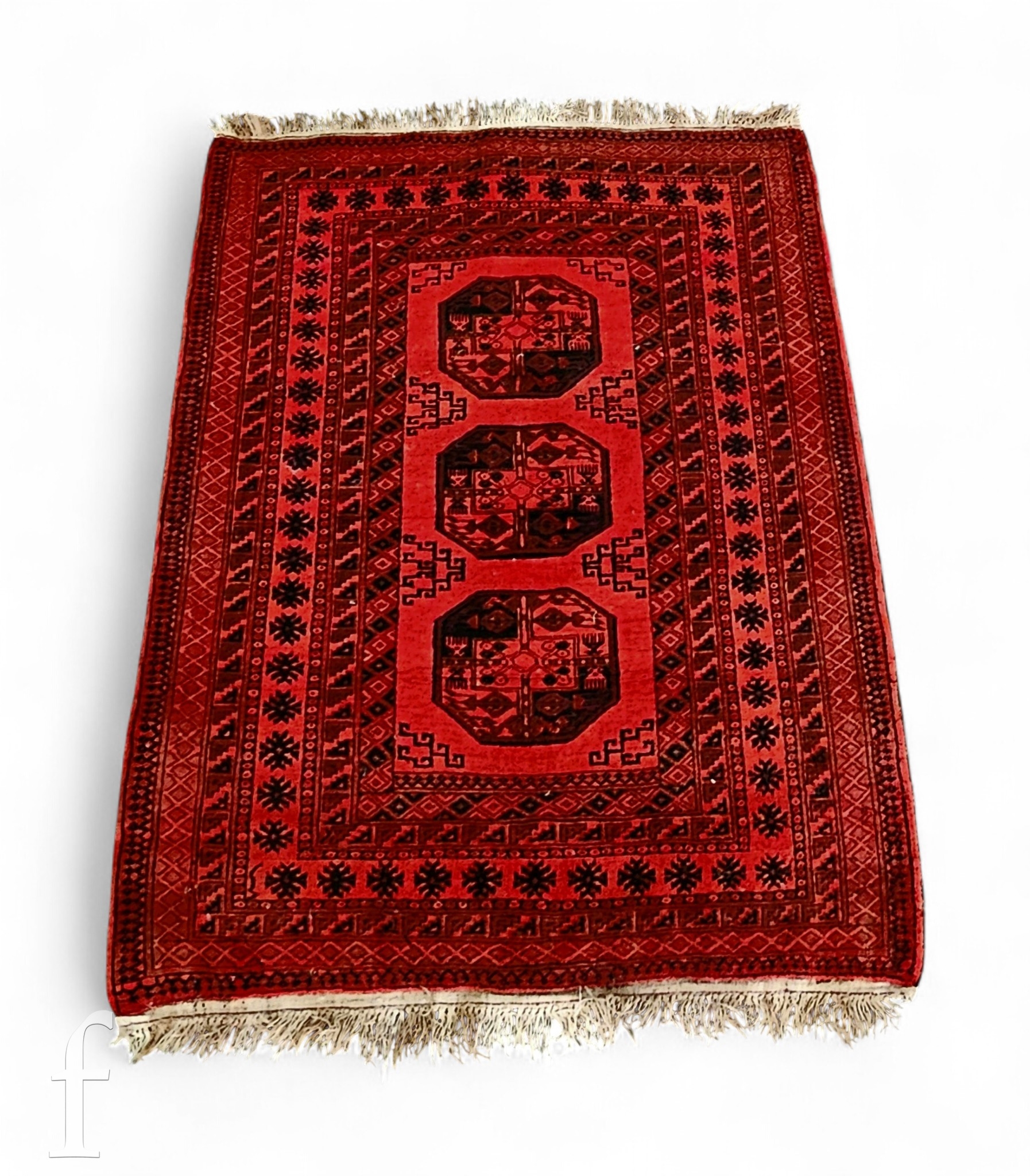 A 20th Century Afghan style rug, a row of three lozenges on a red ground, within multi border, 192cm x 140cm.