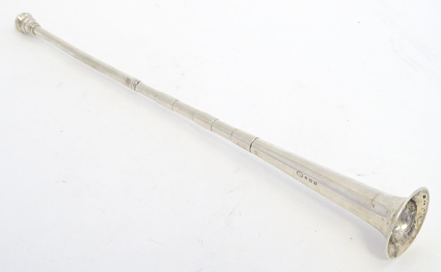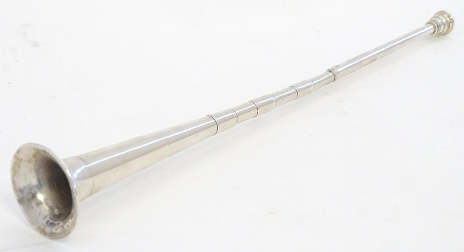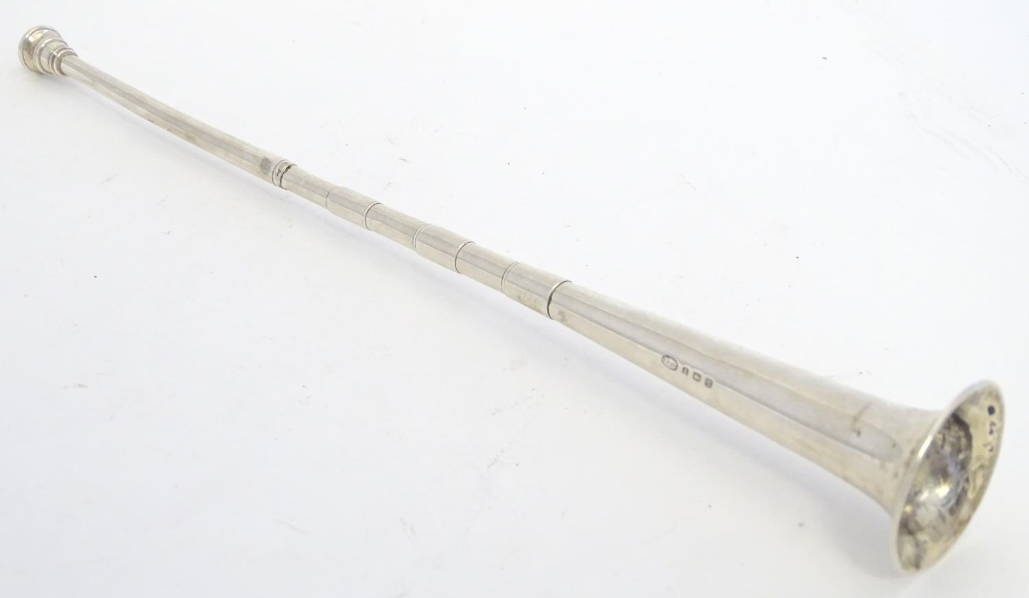 A silver hunting horn formed candlesnuffer. Hallmarked Birmingham 1915 maker E Baker & Son. Approx 11 1/2" long