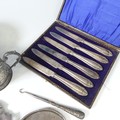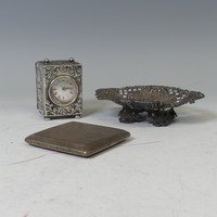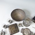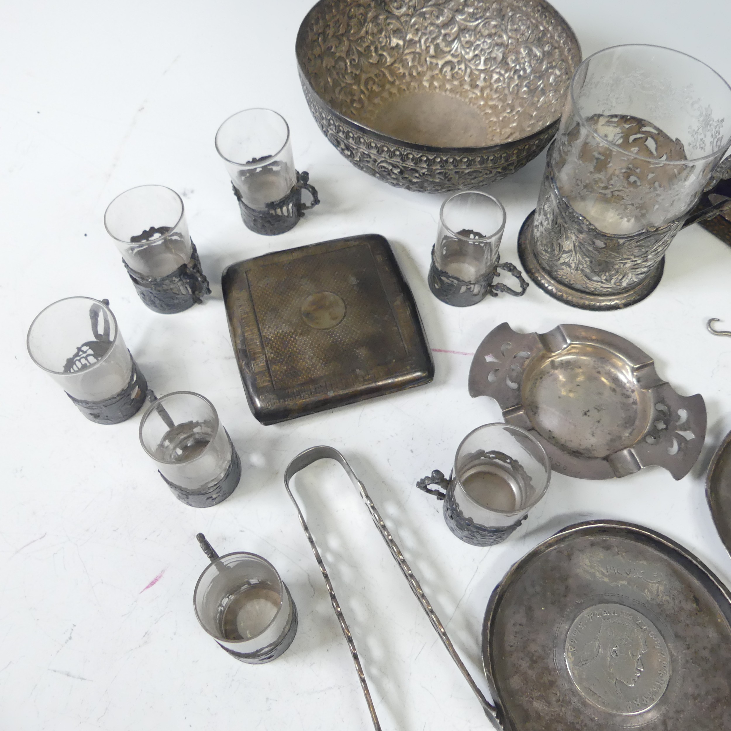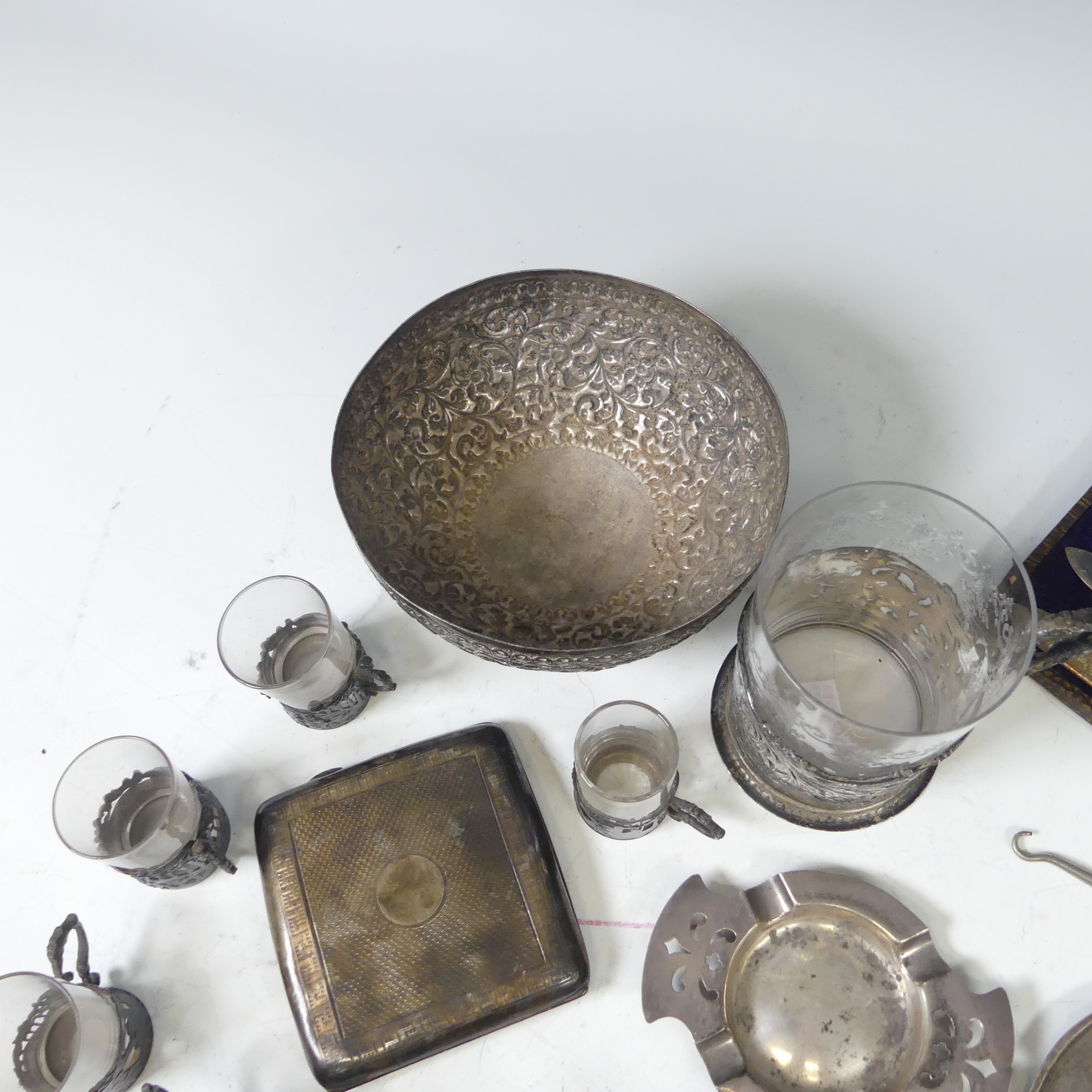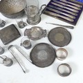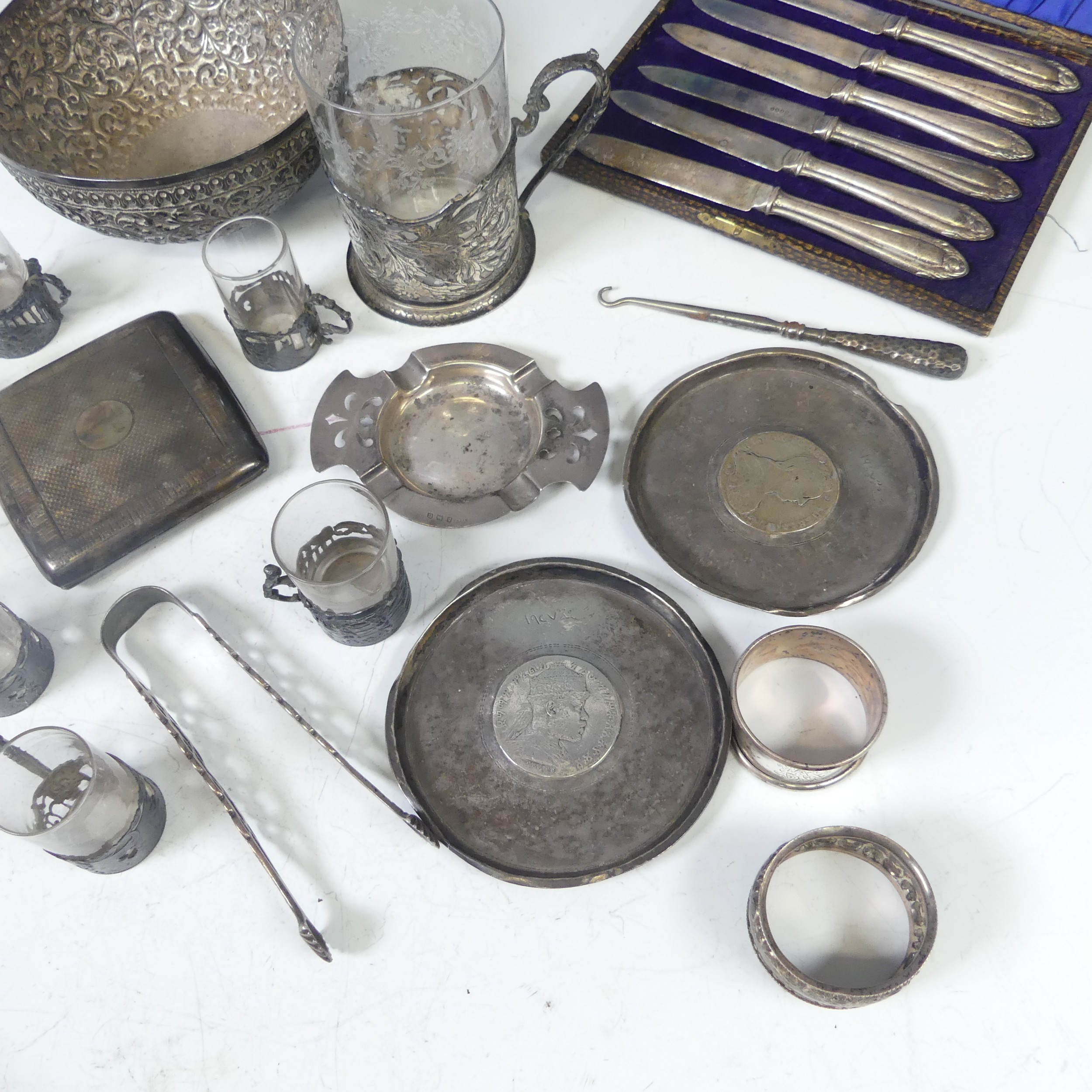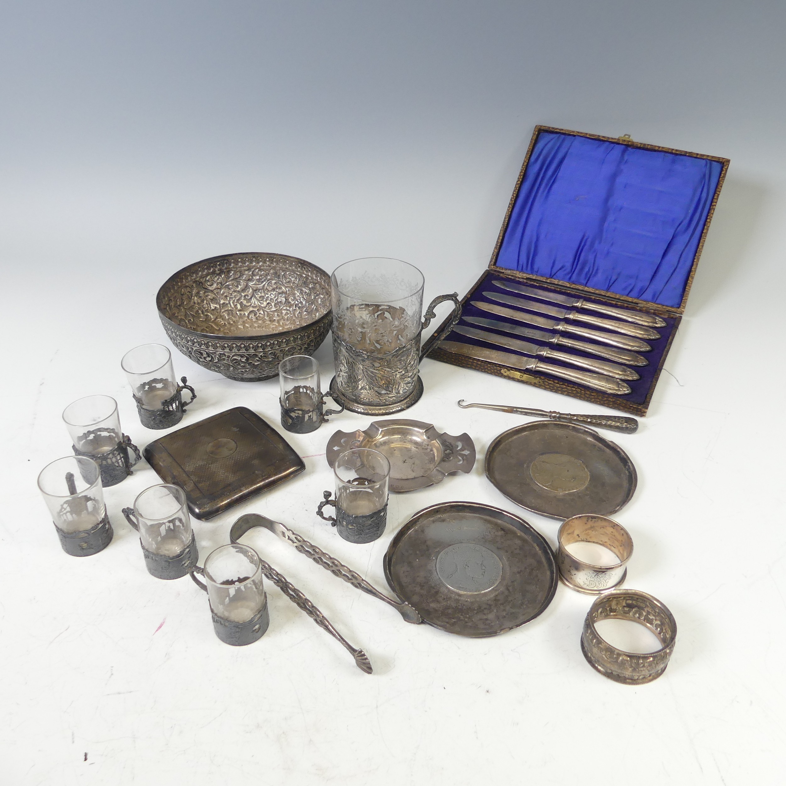 A pair of early George III silver Sugar Tongs, by William Cripps, c.1760's, together with two Eastern coin inset dishes, a silver cigarette case, two napkin rings, a cased set of six silver handled butter knives, etc., weighable 15ozt , and an Eastern bowl, the base marked 'Jaram Bachur'