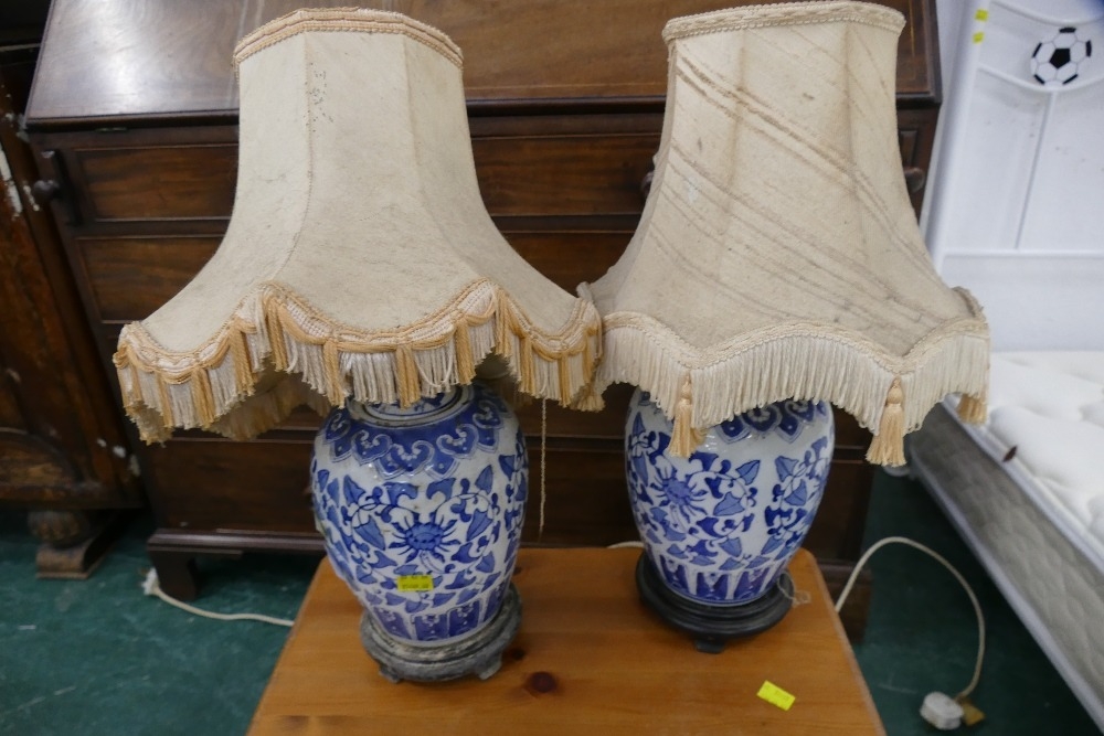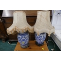 Pair of Asian style blue and white ceramic lamp bases, height 26 cm