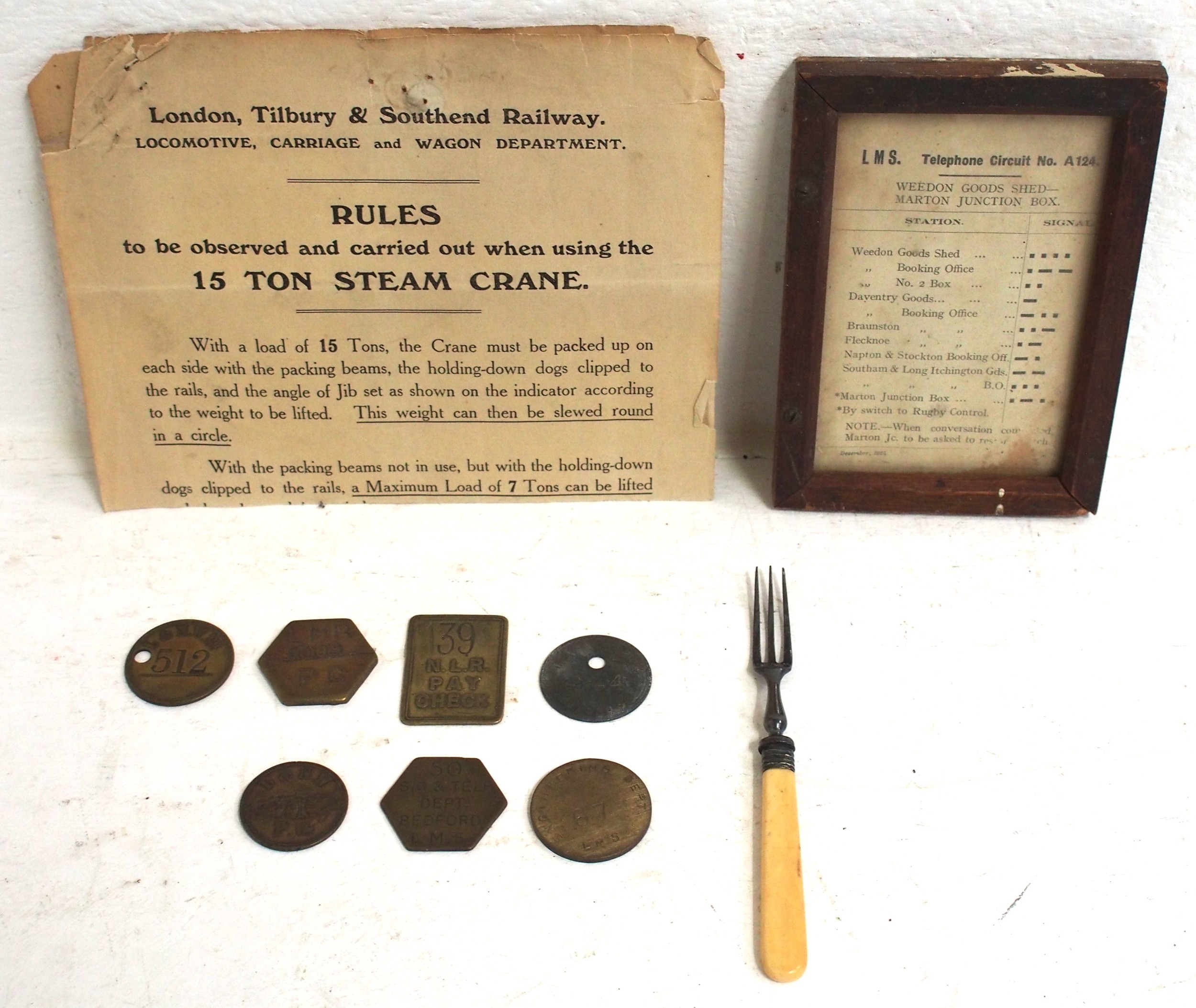 Miscellaneous small items - LMS Telephone Circuit card "WEEDON GOODS SHED - MARTON JNC BOX" dated 1924 in original glazed frame, small pickle fork "DINING CARS EUSTON". paychecks x 7, London Tilbury & Southend Rly paper notice regarding 15 Ton steam Crane dated 1906. (D1X) (Dispatch by Mailboxes/Collect from Banbury Depot)