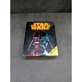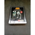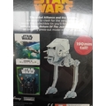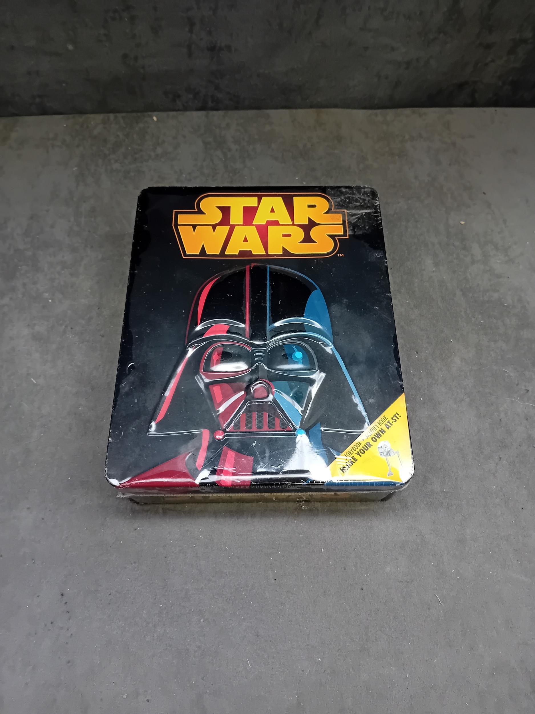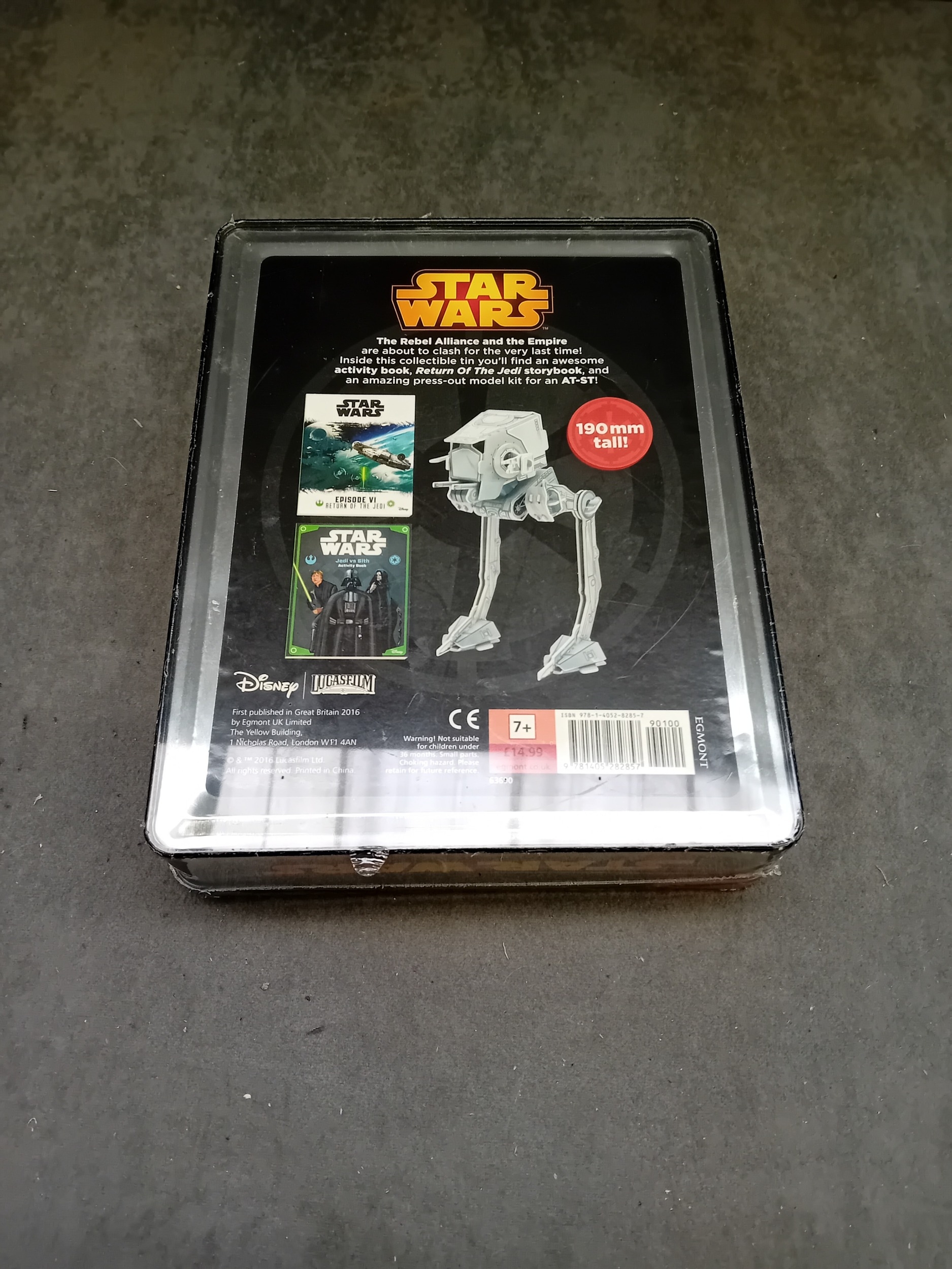 A Star Wars: Lucasfilm Ltd. collectible metal tin, published in Great Britain in 2016 by Egmont UK Limited. The tin features the iconic "STAR WARS" logo in yellow and orange above a stylized, split-color embossed image of Darth Vader's helmet. A yellow burst on the front states "BUILD YOUR OWN AT-ST!". The reverse details the contents: an activity book featuring "Return of the Jedi" and a press-out model kit for an AT-ST. The tin also displays Disney, Lucasfilm, and Egmont logos, a "CE 7+" age rating, and ISBN 978-1-4052-8433-7. The item remains new and sealed in its original clear plastic packaging.