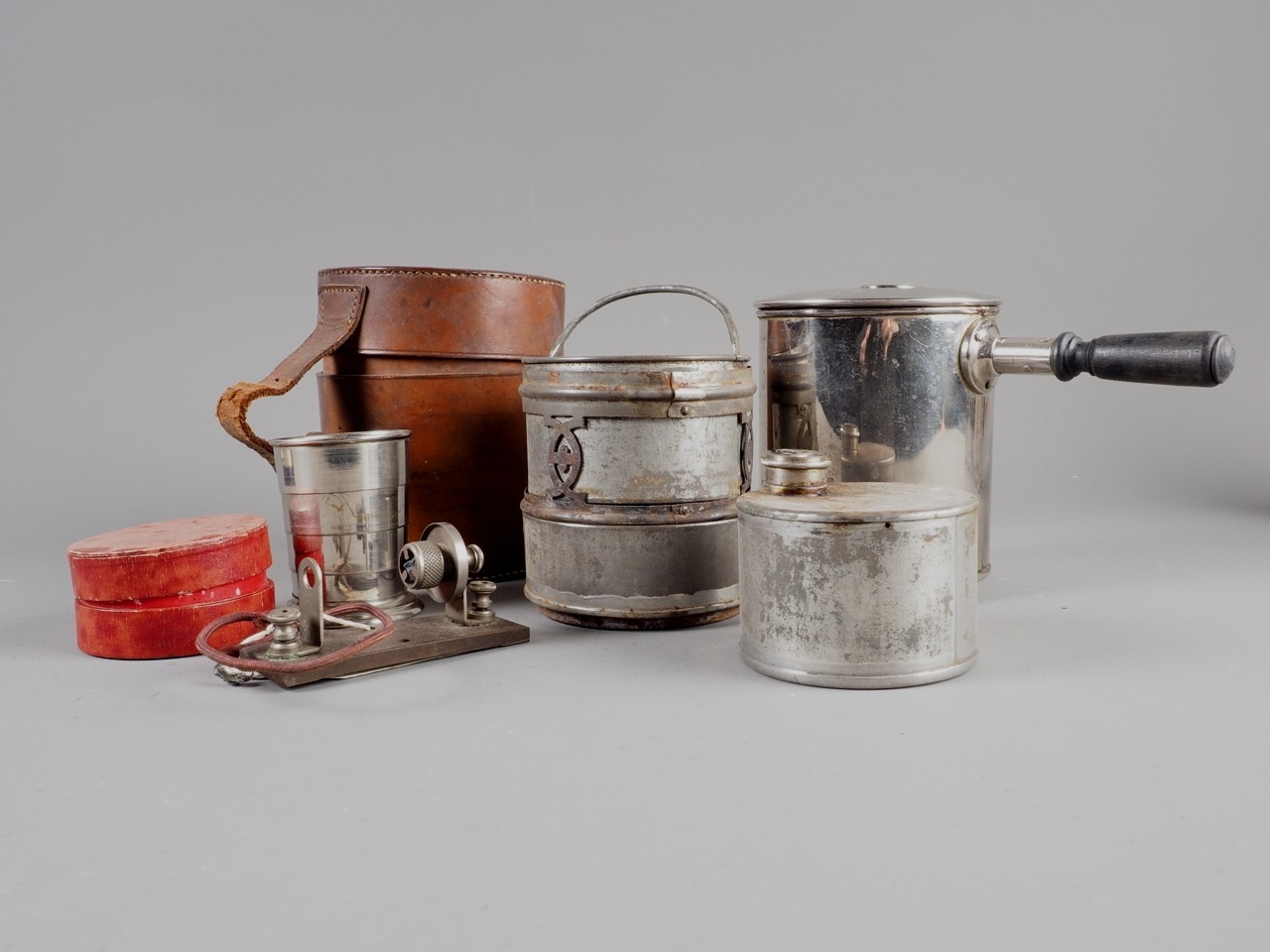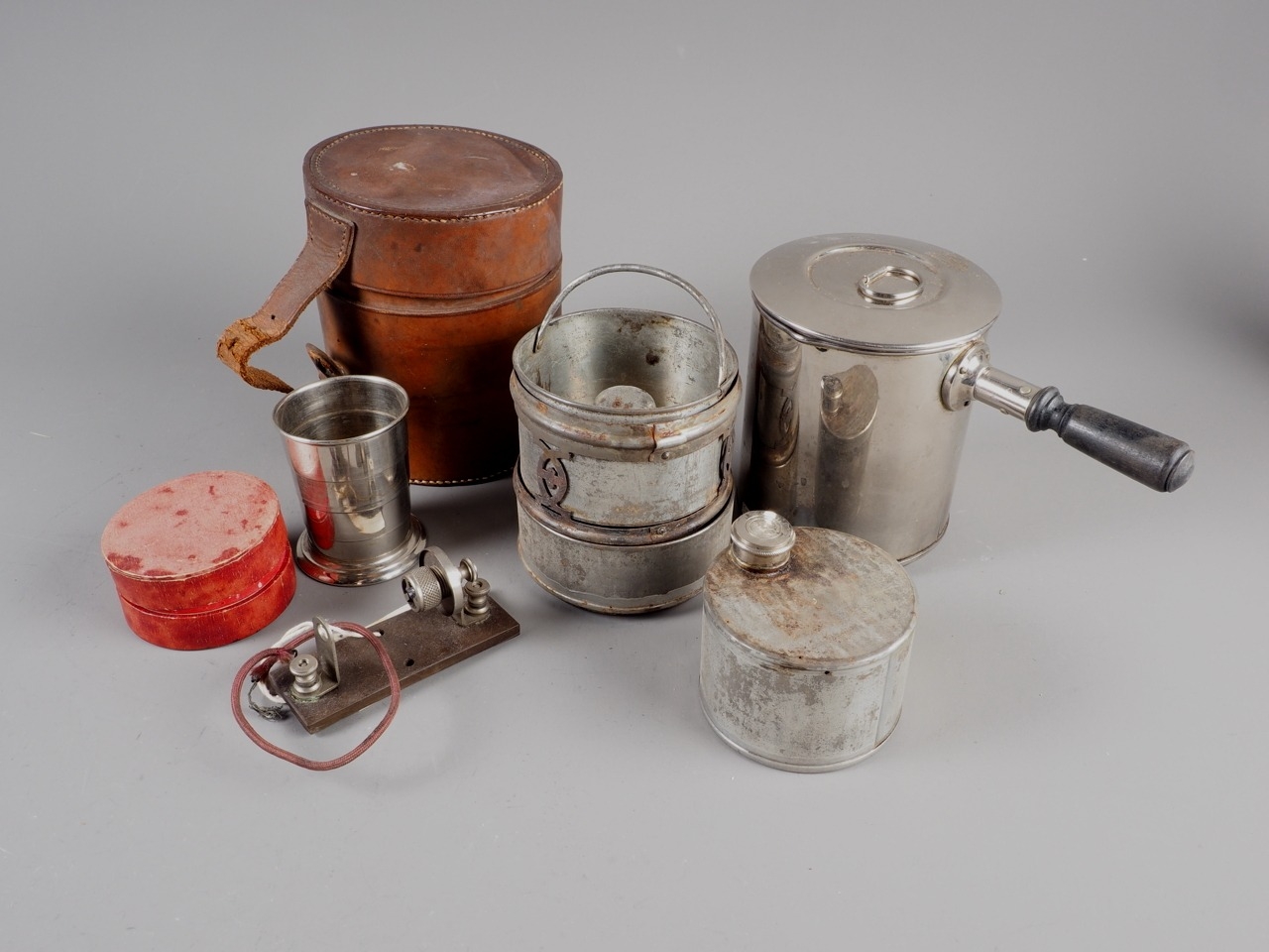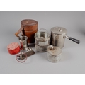 An early 20th century portable coffee percolator and burner, in leather case, a collapsible beaker, in case and a cats whisker radio