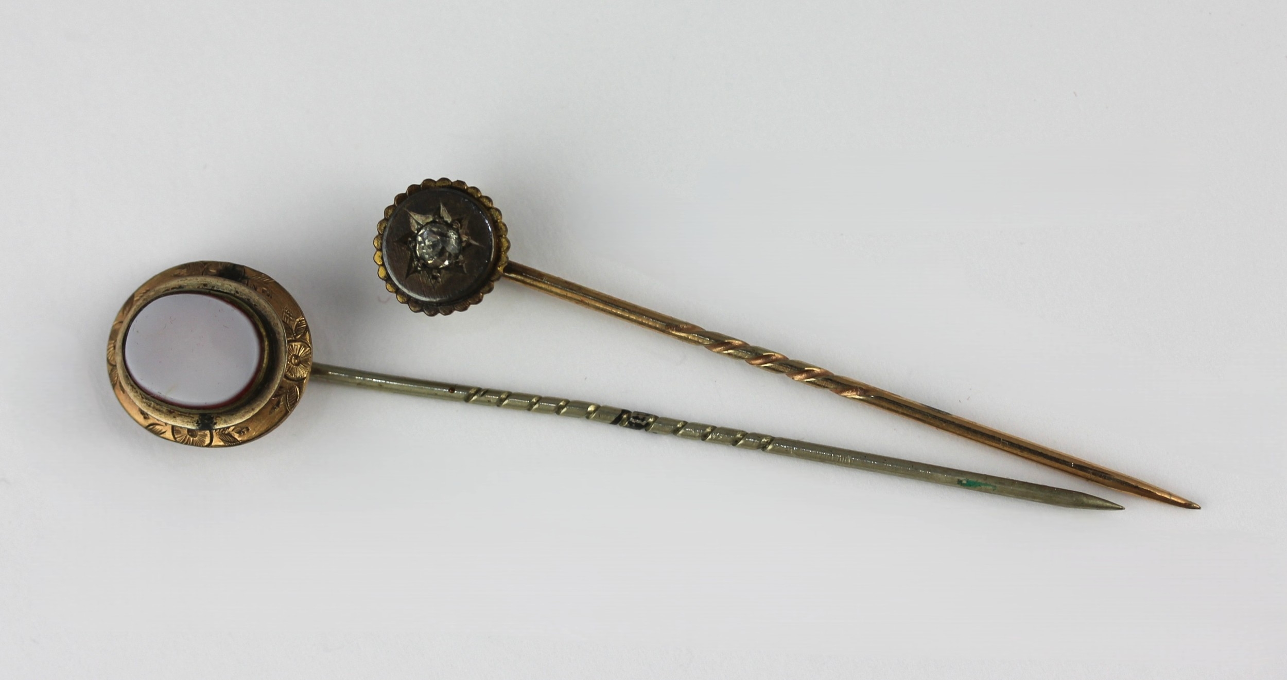 Two gilt metal stick pins to include one set with sardonyx, ...