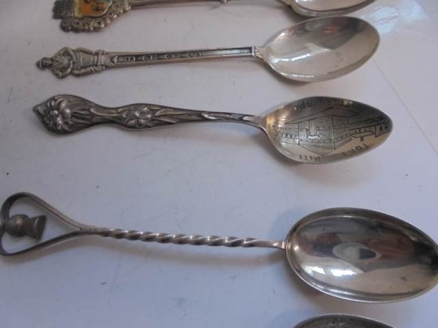 Seven silver spoons including souvenir examples, and 1 silver plate total weight 95 grams