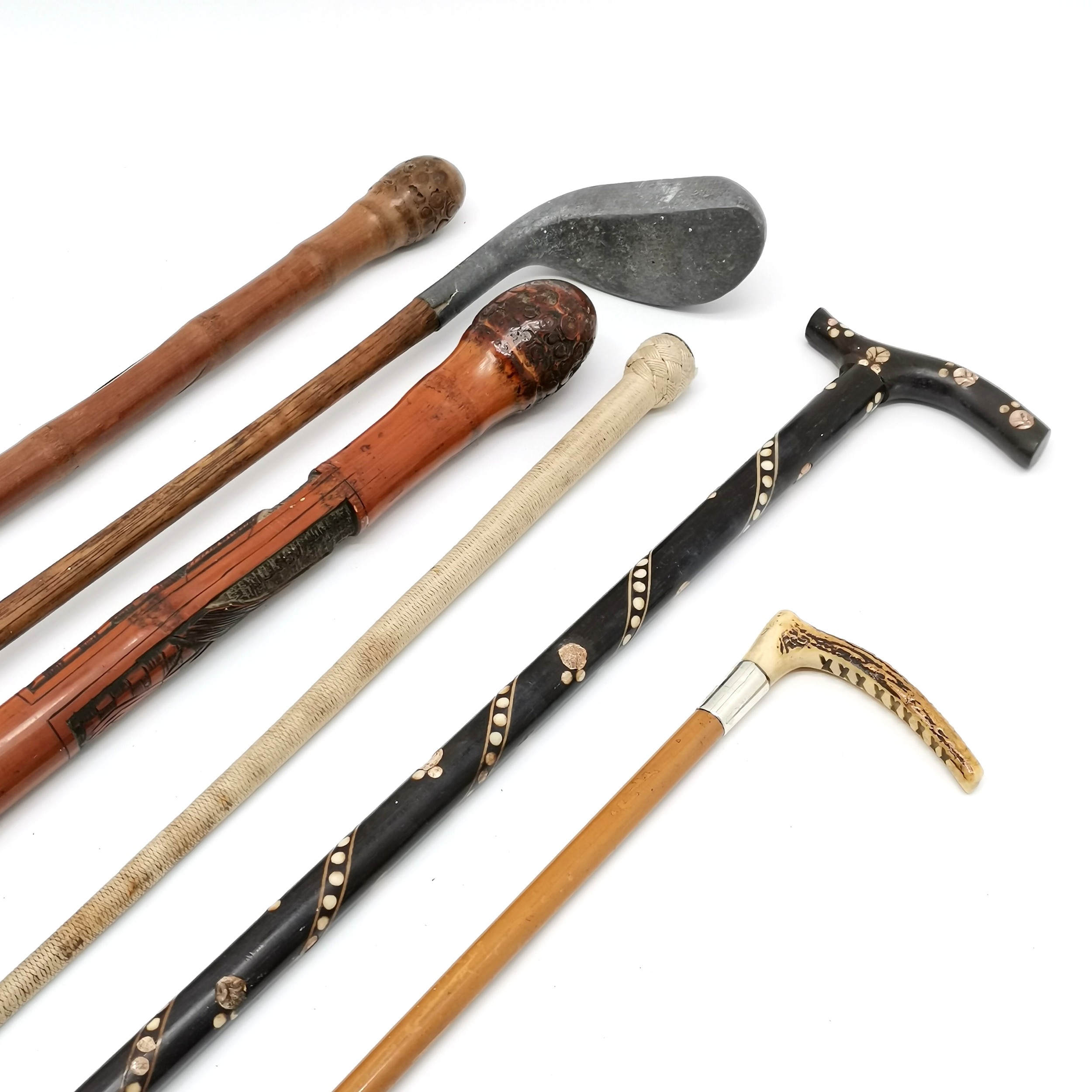 2 x Oriental hand carved walking sticks (longest 87cm), silver mounted riding crop stick (54cm), The Mills SS Model golf club etc - some a/f