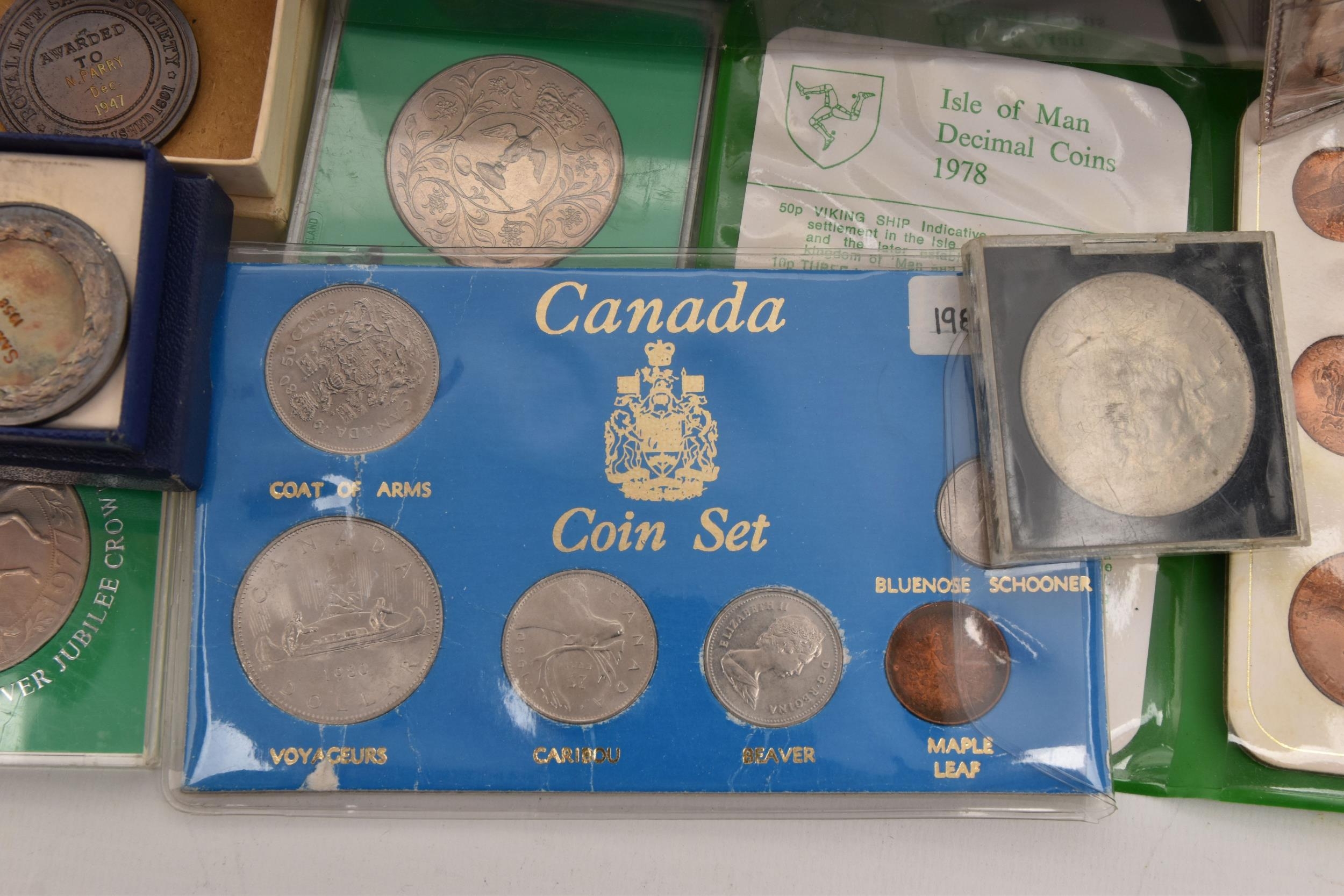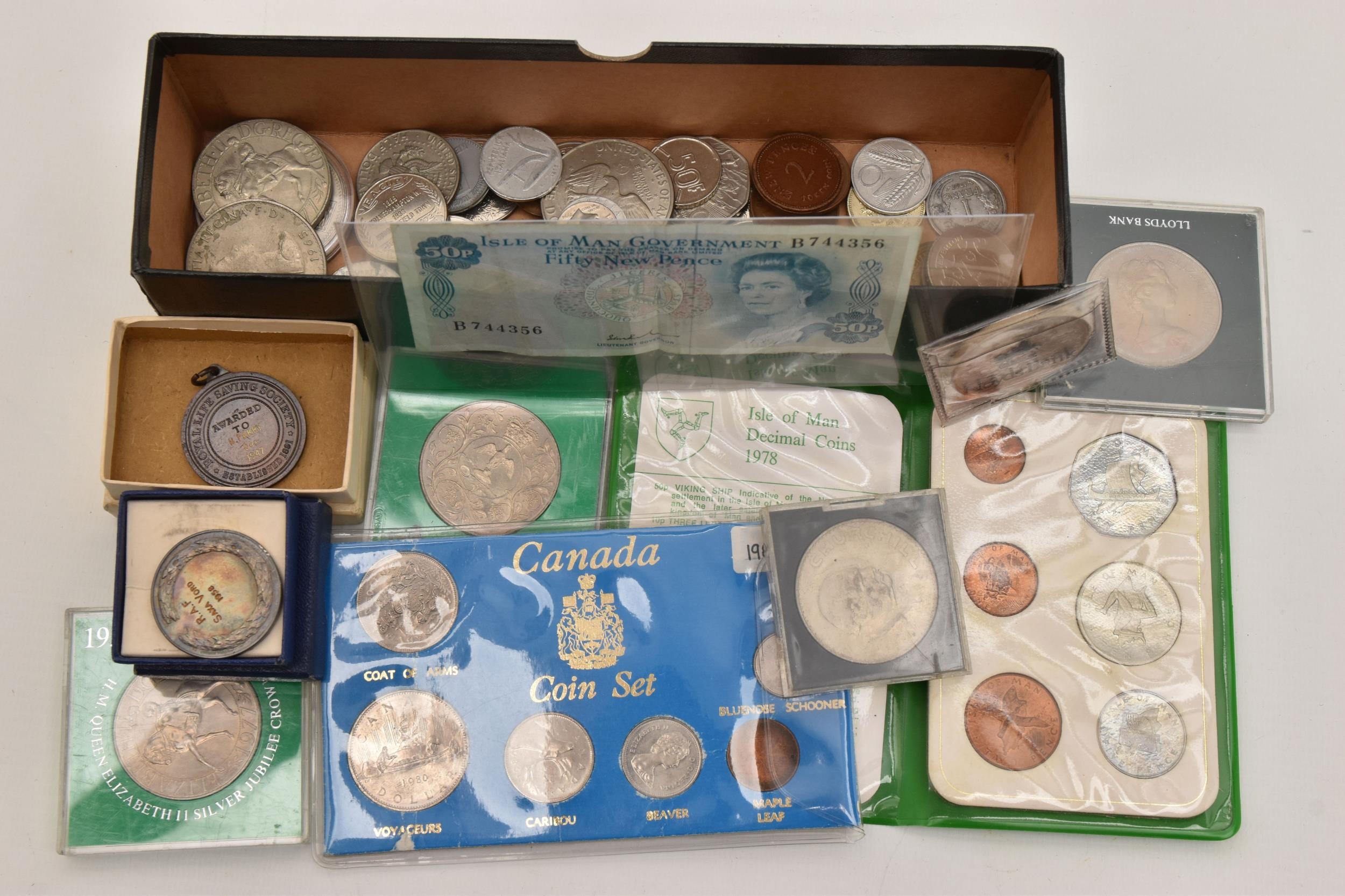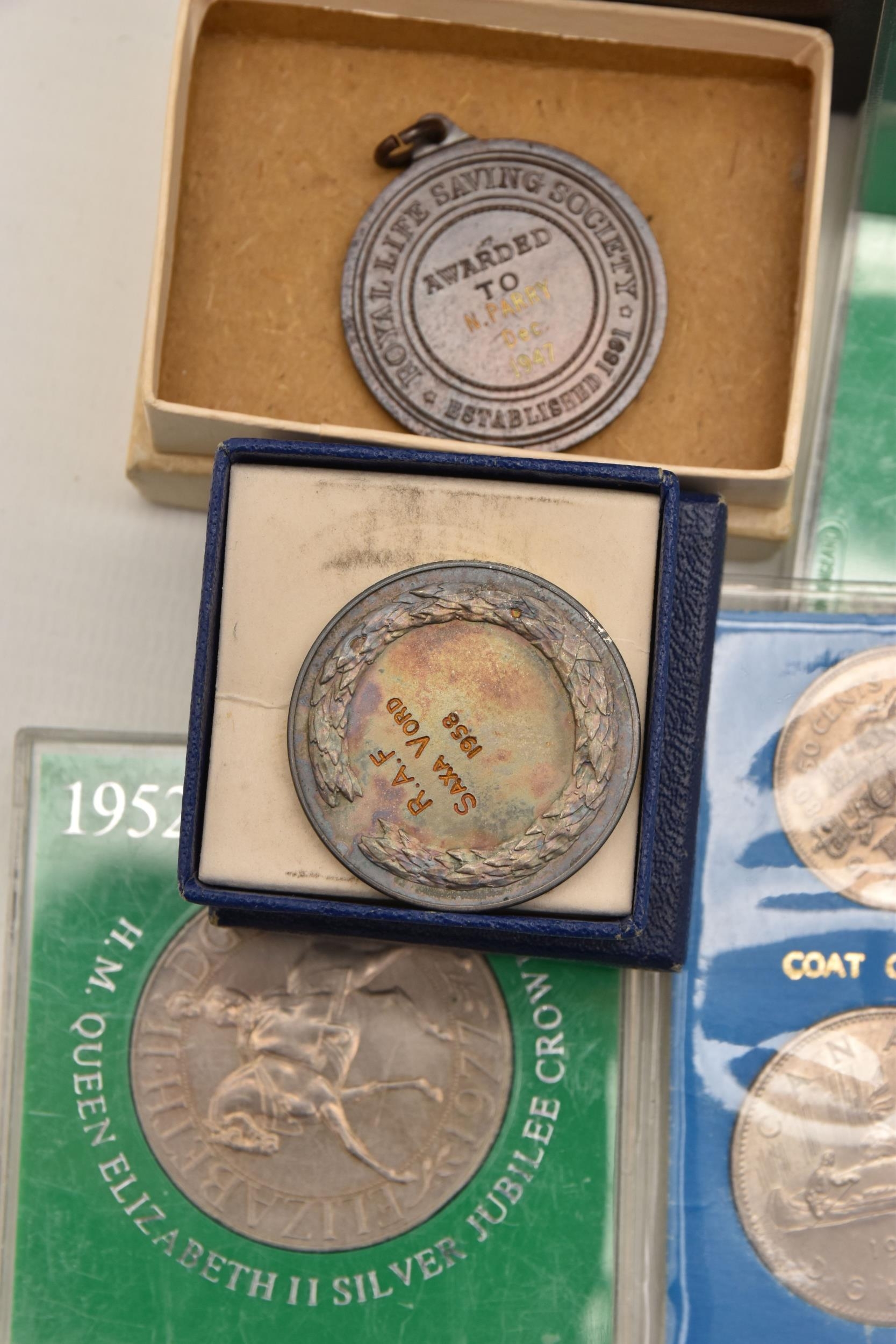 A SMALL CARDBOARD FILE TRAY, to include Isle of Man pocket 6-coin decimal set 1978, a Canada 1980 6-coin set, an RAF Silver Plated Relay Medal Saxa Vord 1958, a Royal Life Saving Society award to N Parry 1947 (written underneath the box is the name Nancy Parry) Isle of Man Fifty Pence Banknote commemoratives etc