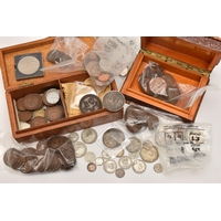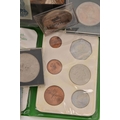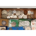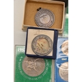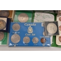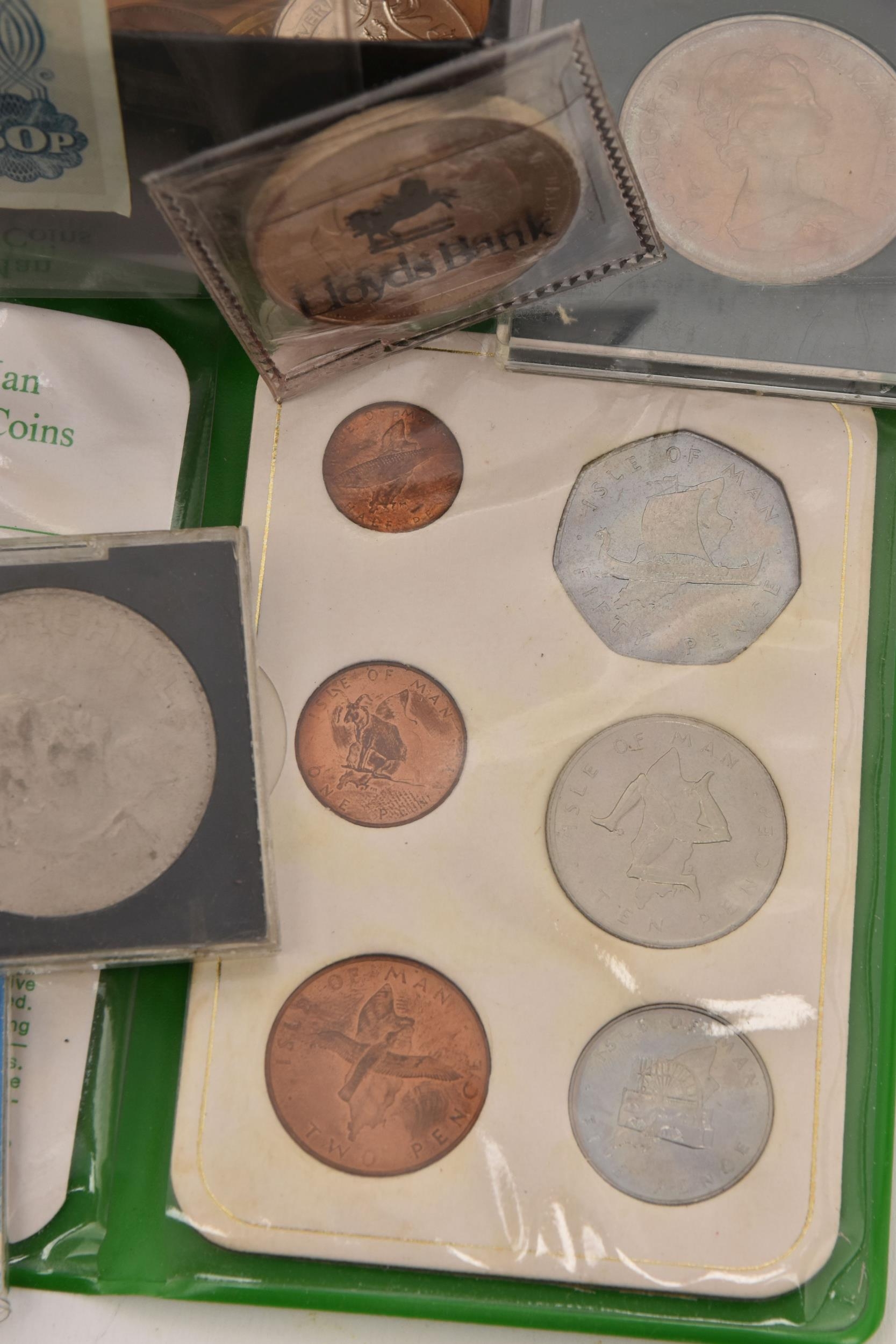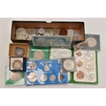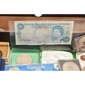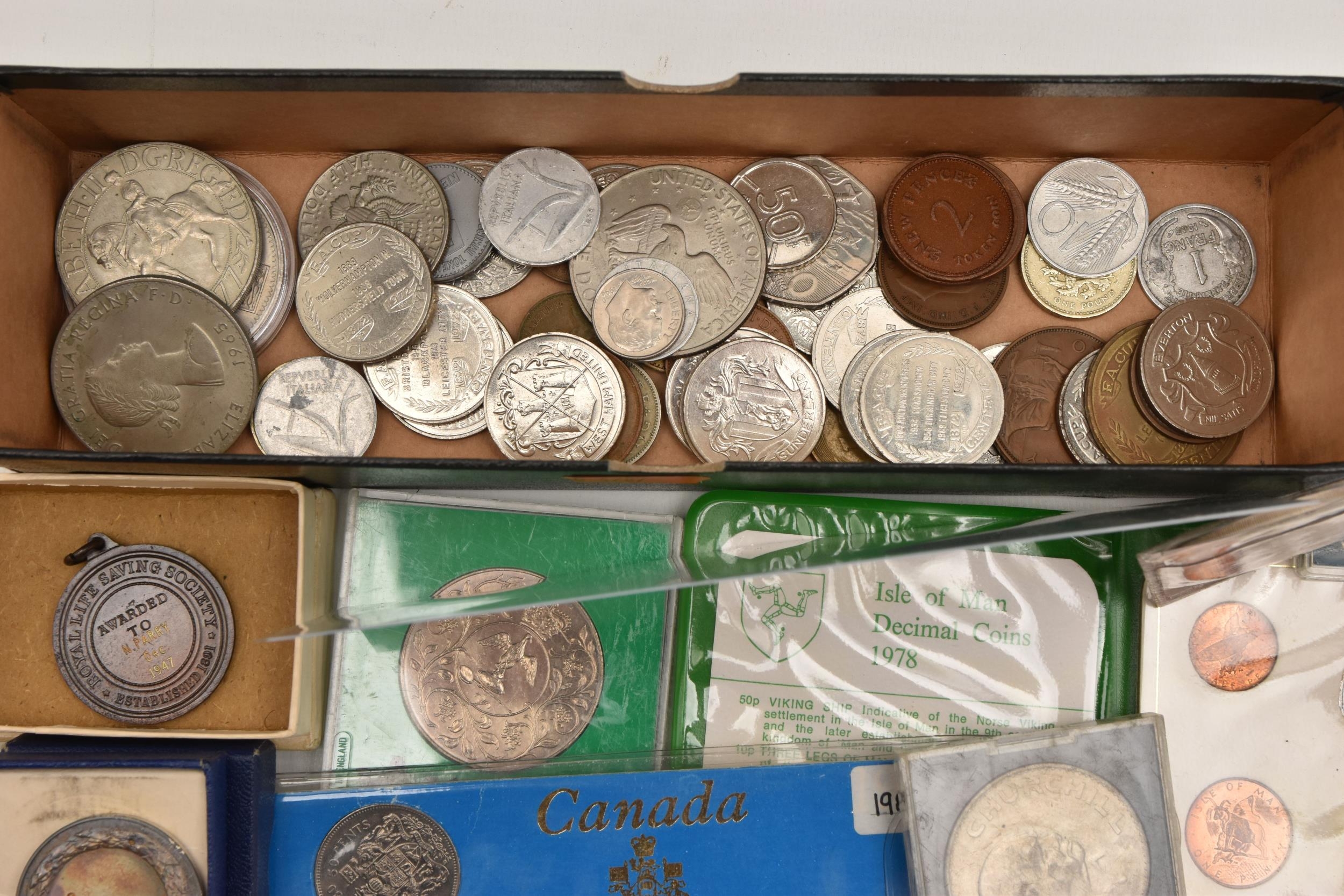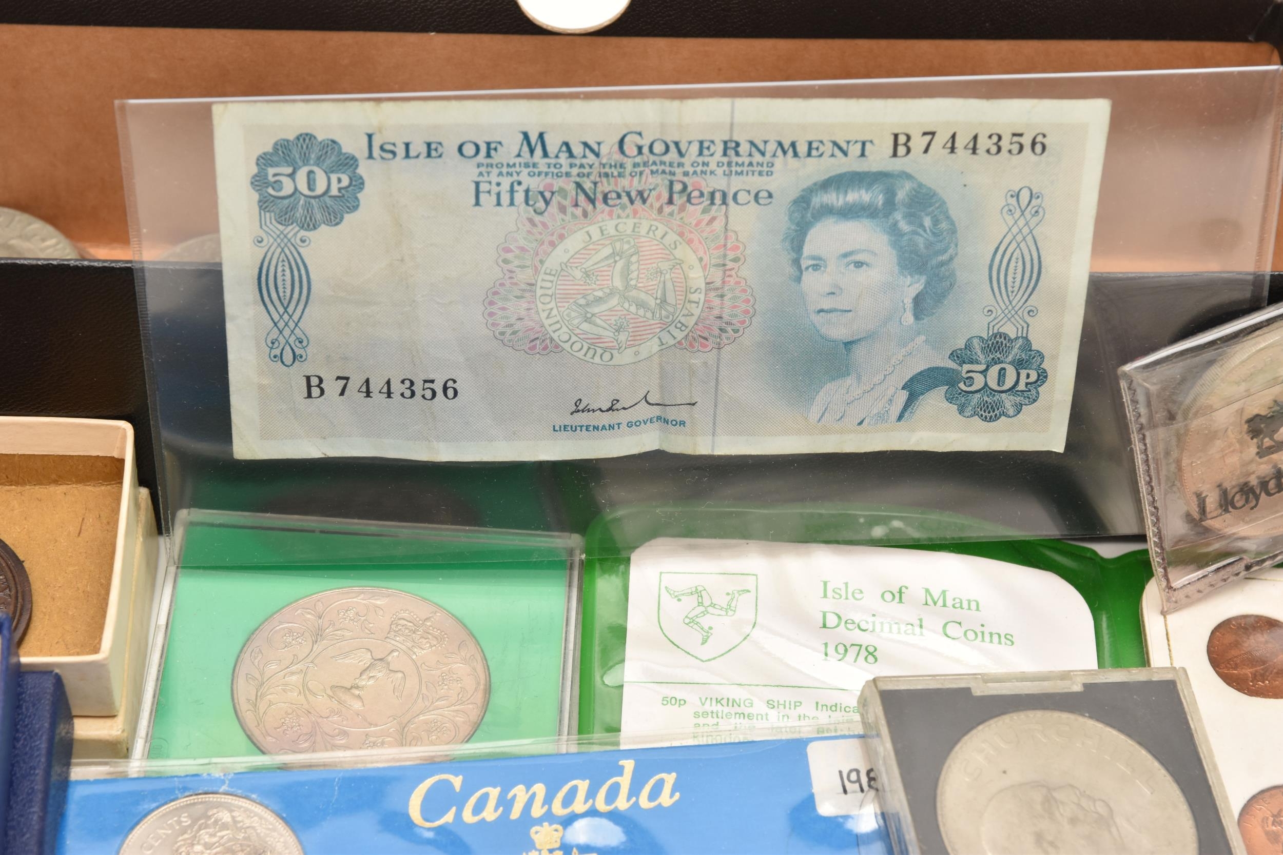 A SMALL CARDBOARD FILE TRAY, to include Isle of Man pocket 6-coin decimal set 1978, a Canada 1980 6-coin set, an RAF Silver Plated Relay Medal Saxa Vord 1958, a Royal Life Saving Society award to N Parry 1947 (written underneath the box is the name Nancy Parry) Isle of Man Fifty Pence Banknote commemoratives etc