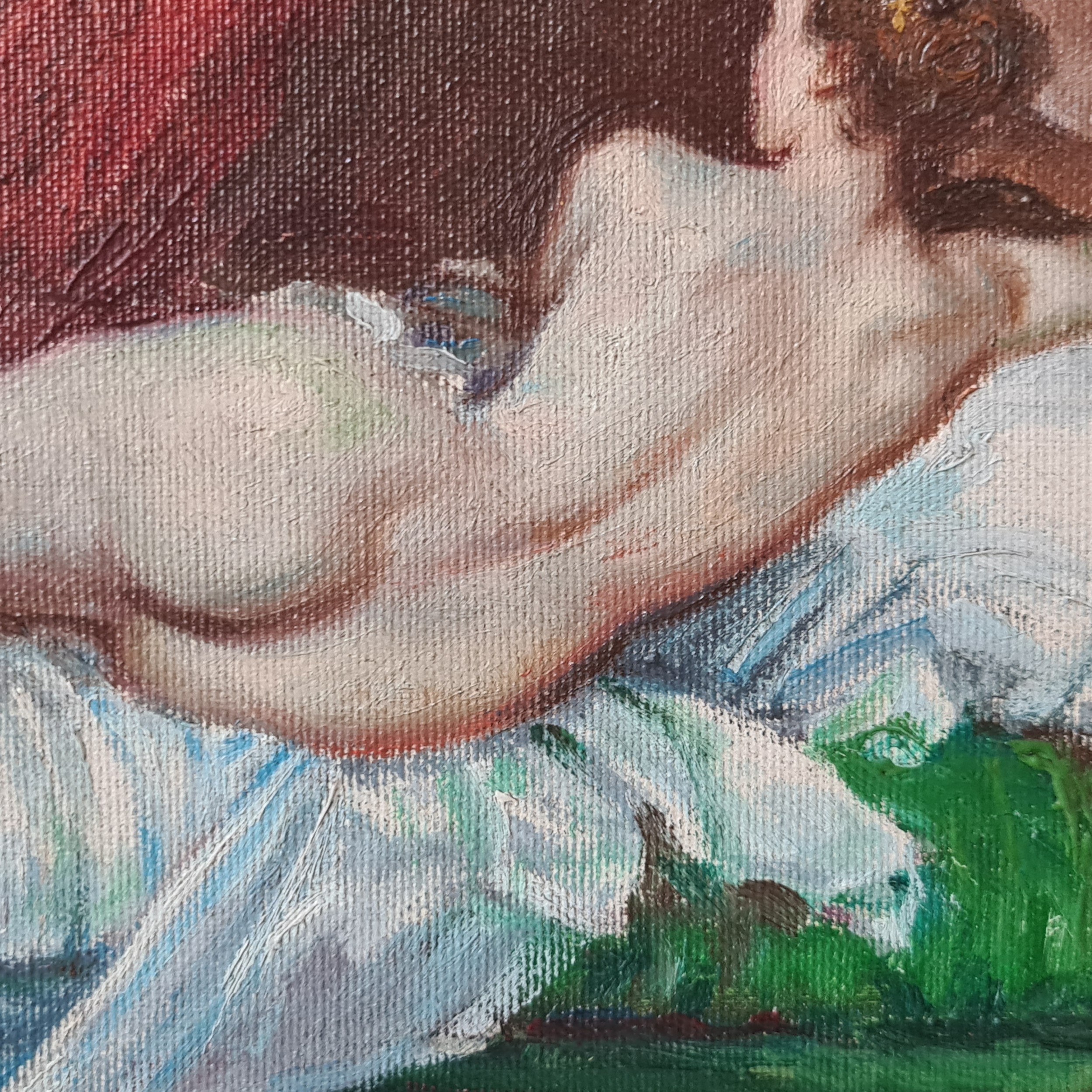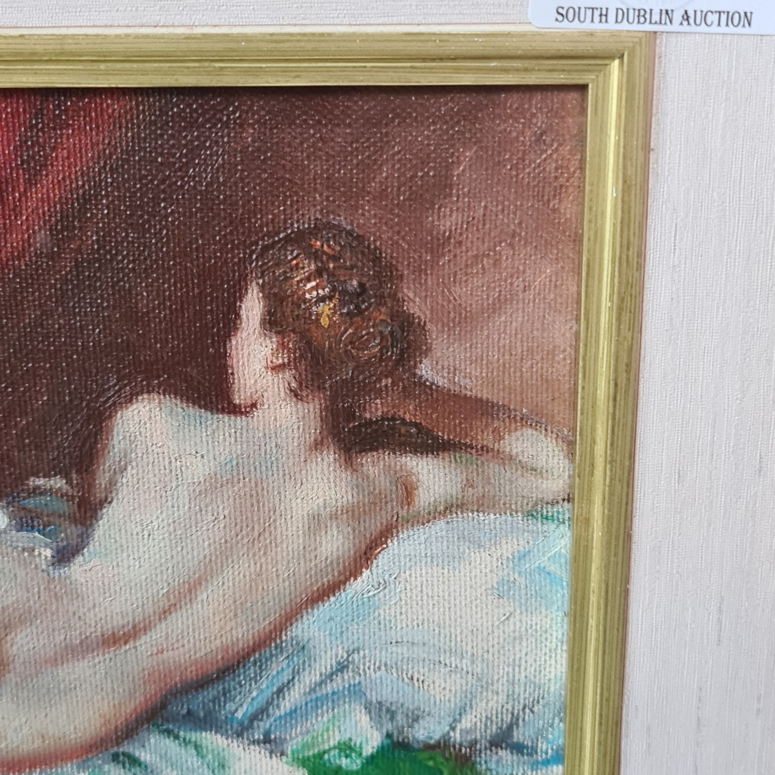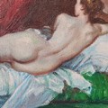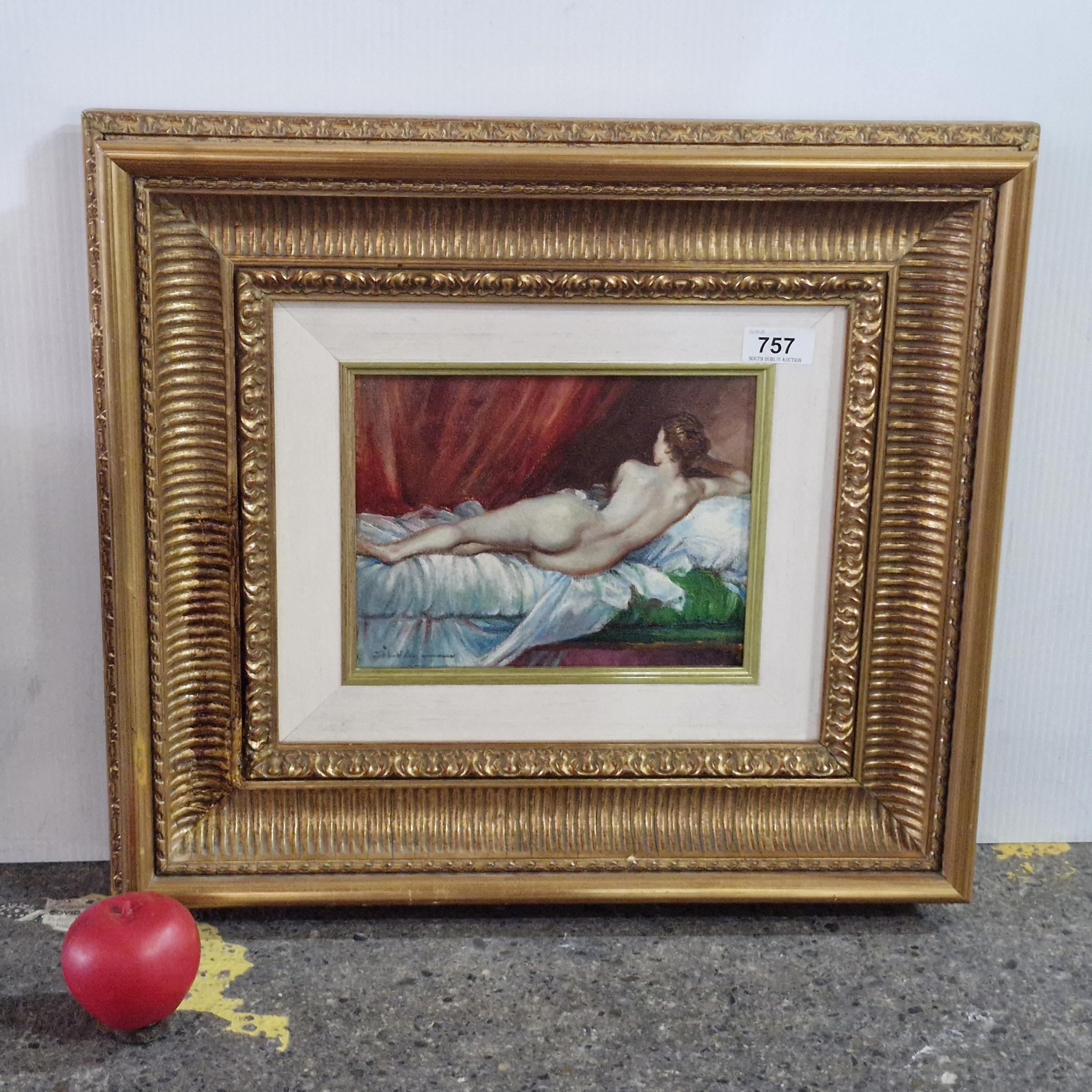 Star Lot: A very well achieved oil on canvas painting after a Diego Velázquez painting c.1650 titled 'The Rokeby Venus'. Features a reclined female nude lying on a bed. The figure is surrounded by sumptuous silk and velvet fabrics rendered in lively brushstrokes. Signed 'Silva' lower left and attractively housed in a deep molded gilt frame.