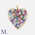 A Gem-Set Locket Pendant in yellow gold the heart shaped form set with various gemstones and diamonds. Unmarked, tests indicate 14 carat gold.