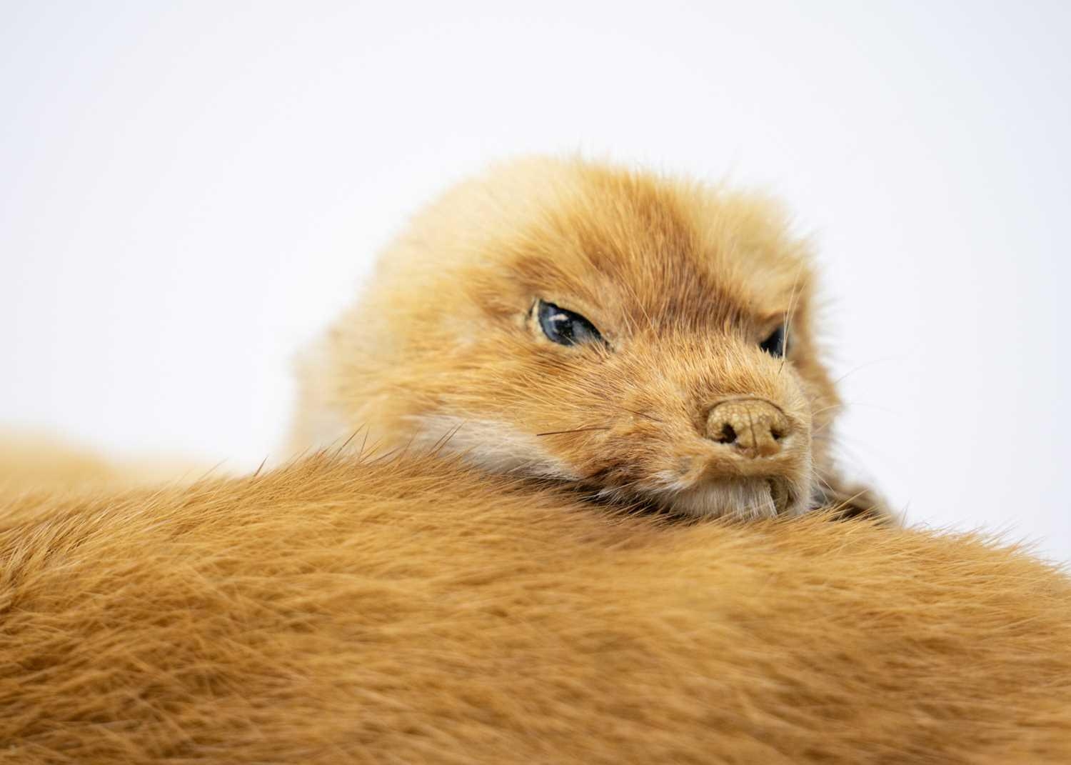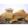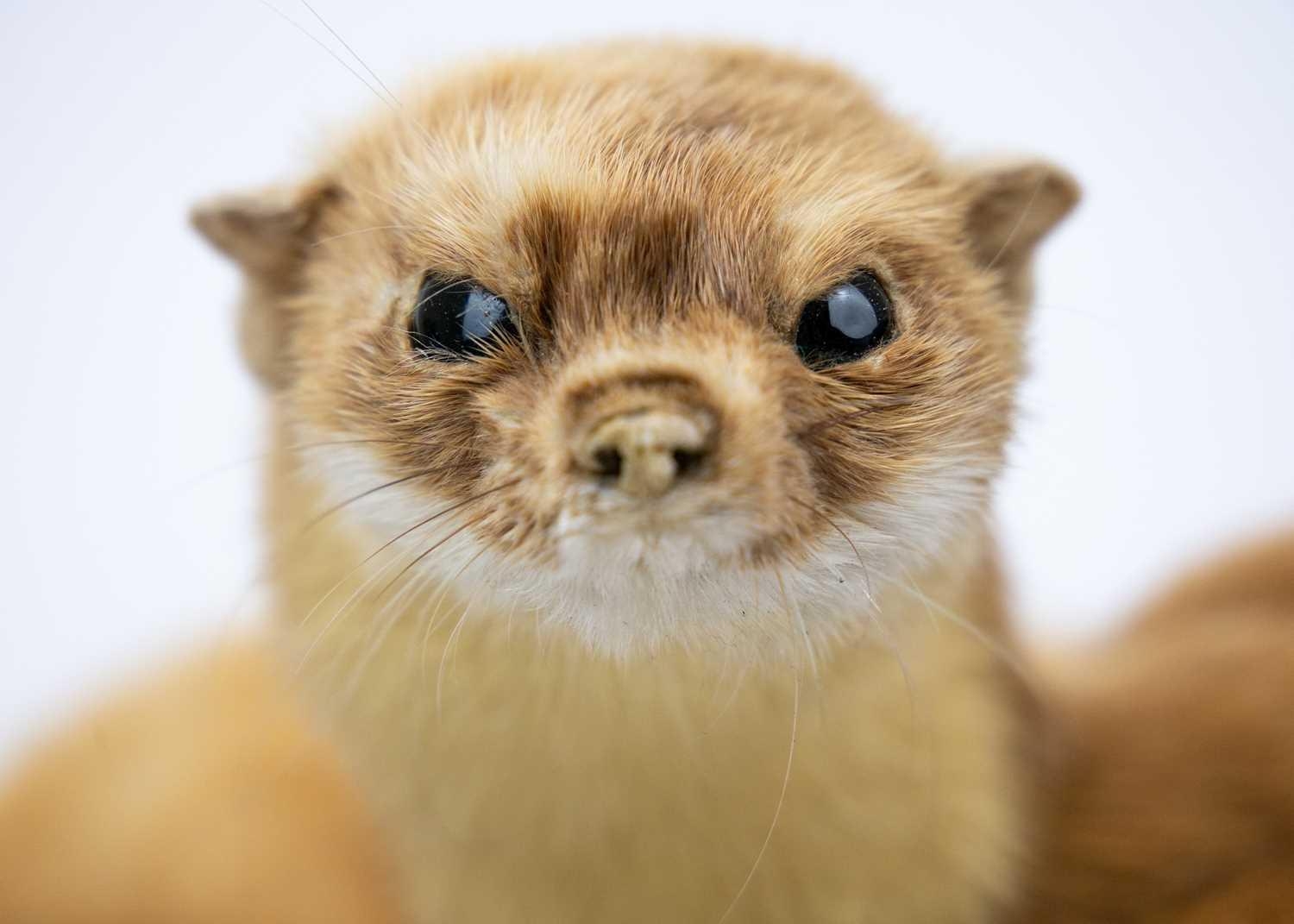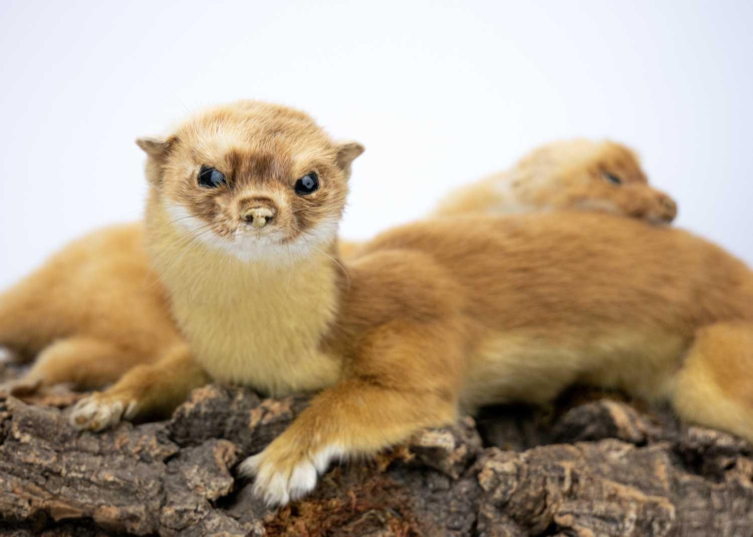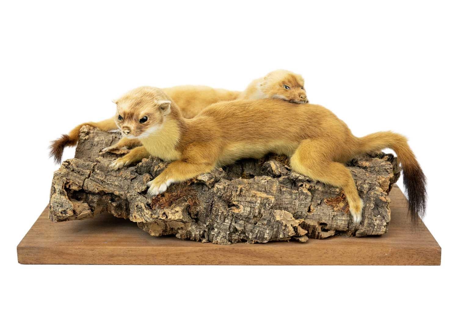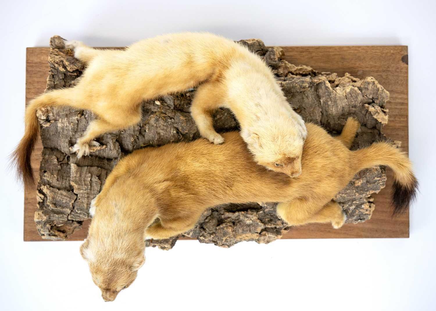 A pair of taxidermy stoats. Positioned on a natural bark base, 16cm tall including the base, purportedly by Kenny Everett, in a Wooden handled stow case measures 26cm high x 43cm wide x 36cm deep