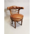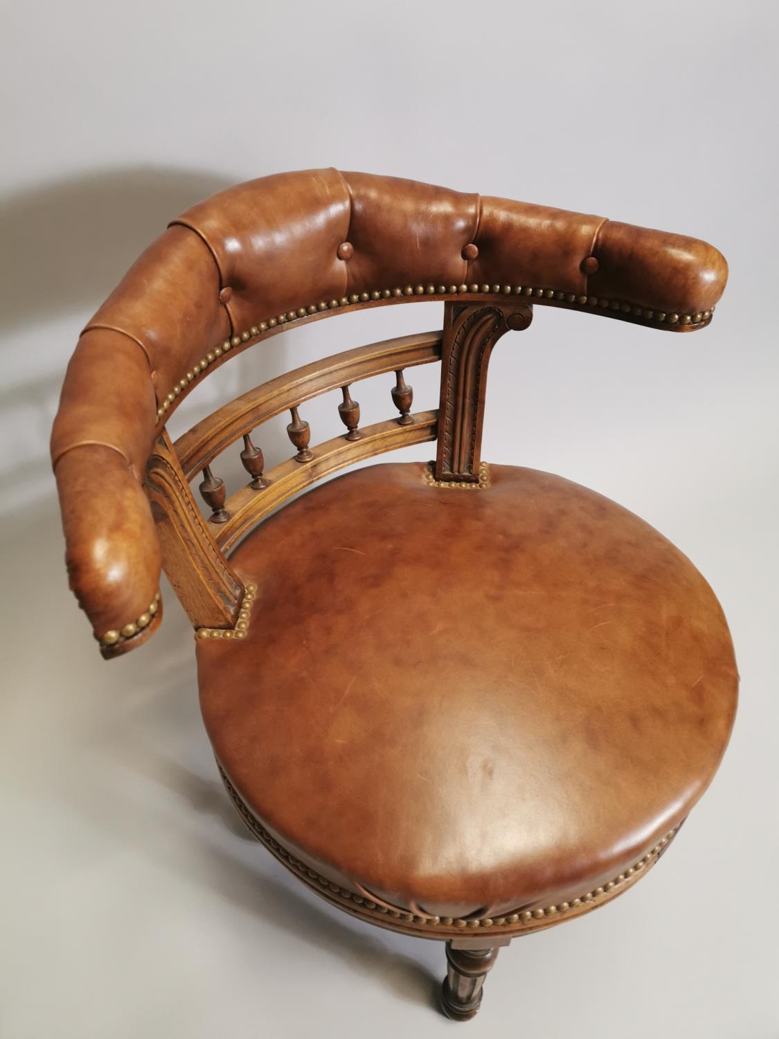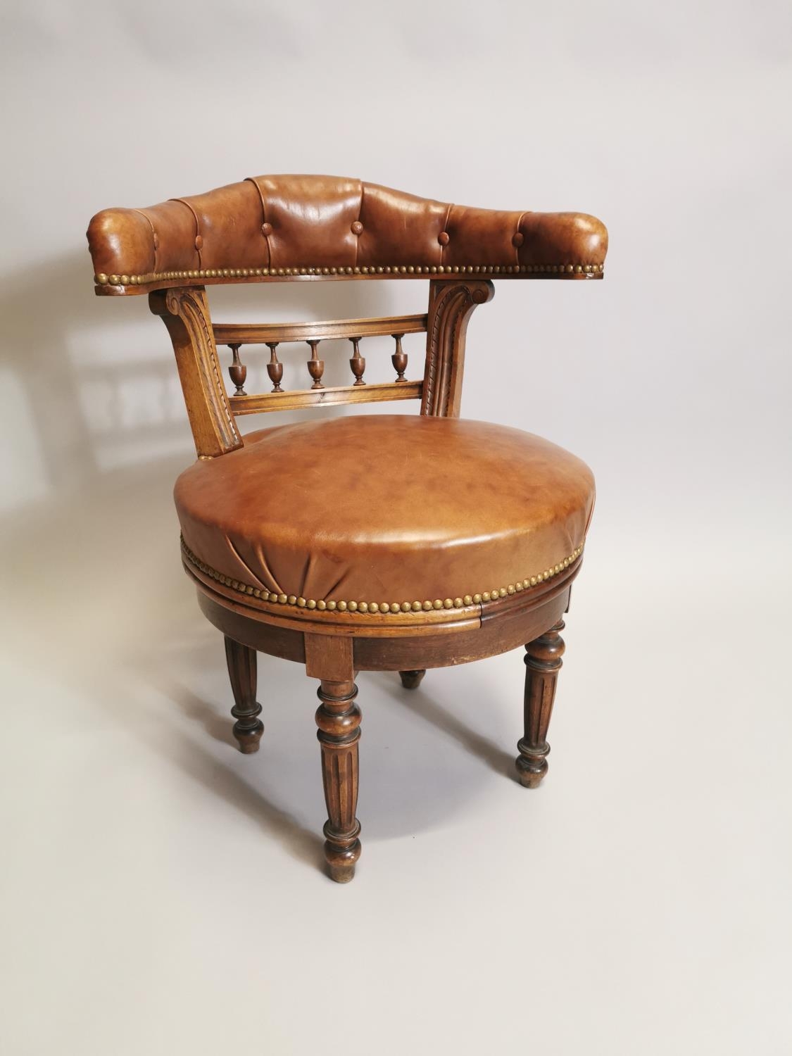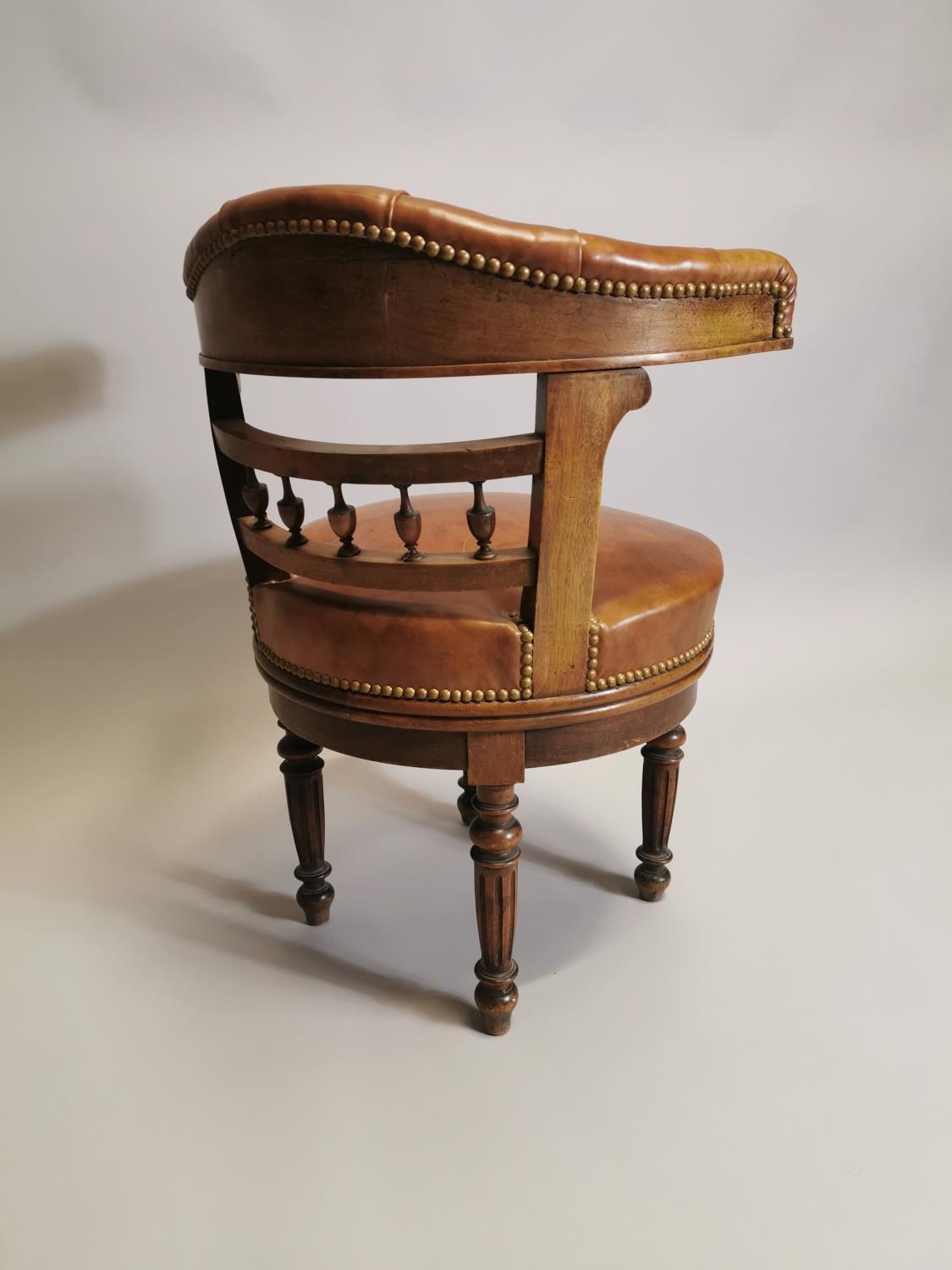 19th. C. leather upholstered mahogany desk chair , raised on turned and reeded legs. { 79cm H X 60cm W X 56cm D }.