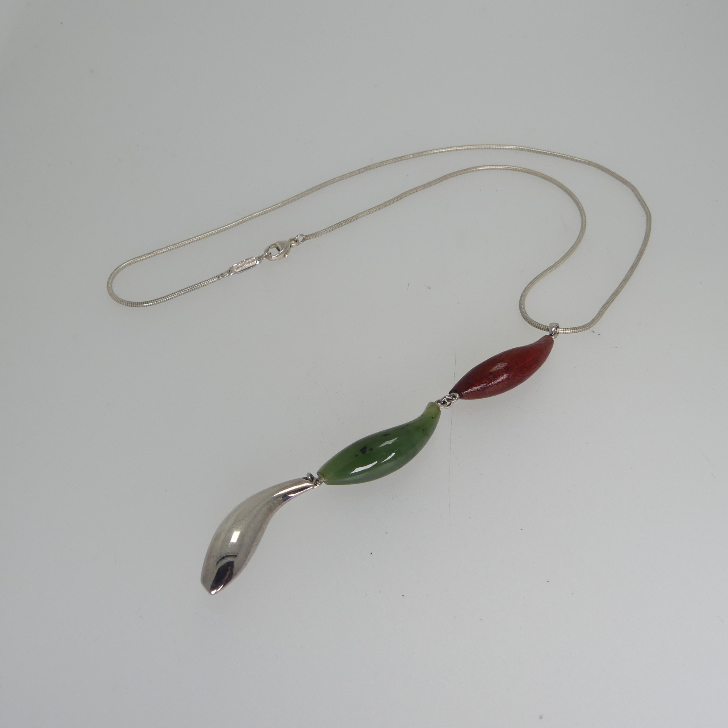 Tiffany & Co;, A Frank Gehry 'fish' design Pendant, with wood, jade and sterling silver drops set vertically on a silver snakelink chain, 40.5cm long, the clasp with Tiffany import marks for London 2008, in original black velvet pouch and outer card box.