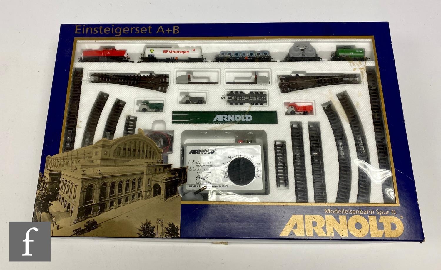 An N gauge Arnold 0301 Starter Train Set A+B, with DB Class 212 red diesel locomotive, four items of rolling stock, complete with all other accessories and instructions, boxed.