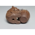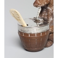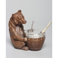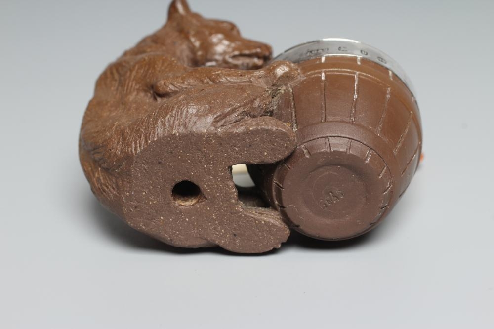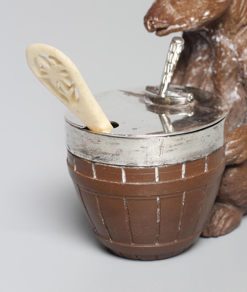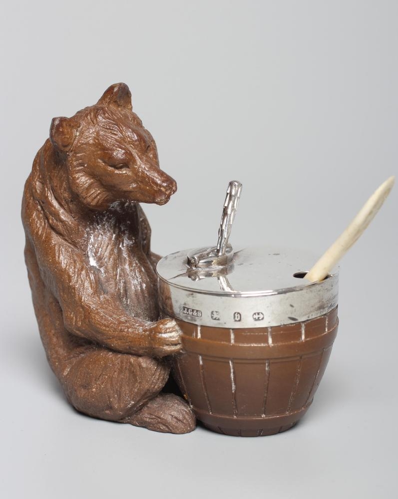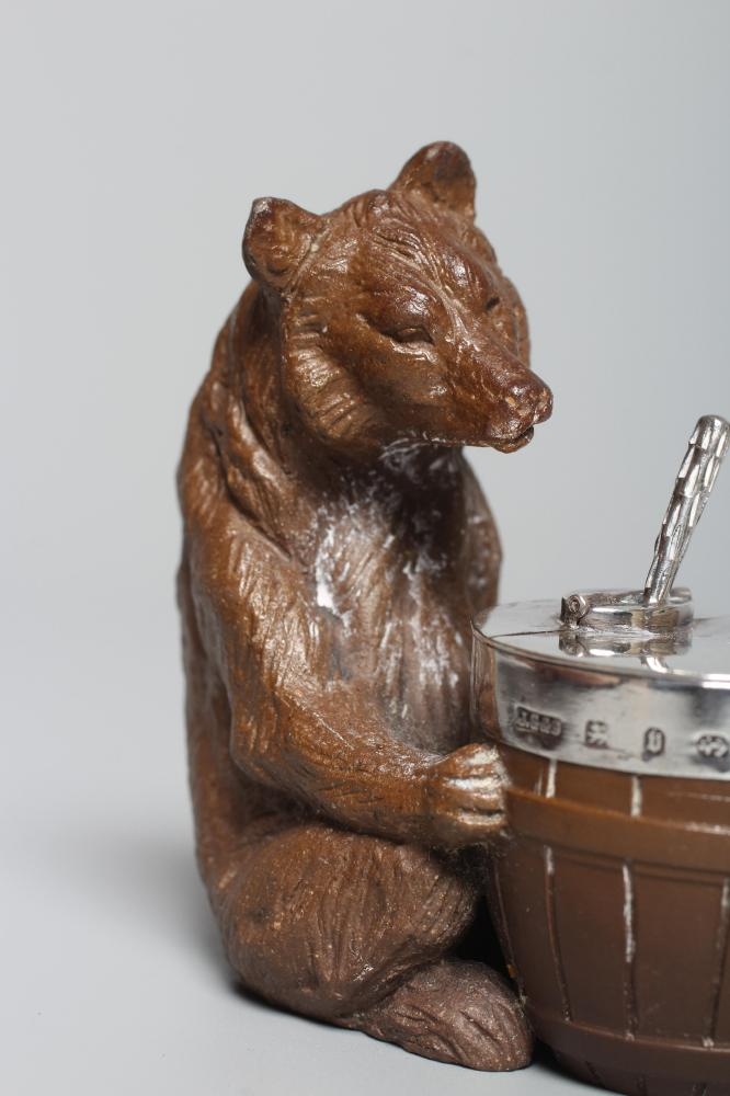 A LATE VICTORIAN SILVER MOUNTED DARK BROWN STONEWARE NOVELTY MUSTARD, modelled as a seated bear with carved fur detail holding a stavel barrel, with plain silver mount and half hinged cover with "twig" handle, by John Grinsell & Sons, Birmingham 1895, base impressed 2705, 3" high N.B. These bear cruets are generally made by Doulton Lambeth and attributed to Mark V. Marshall. However, this bear is unmarked and appears to be German