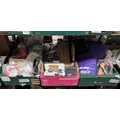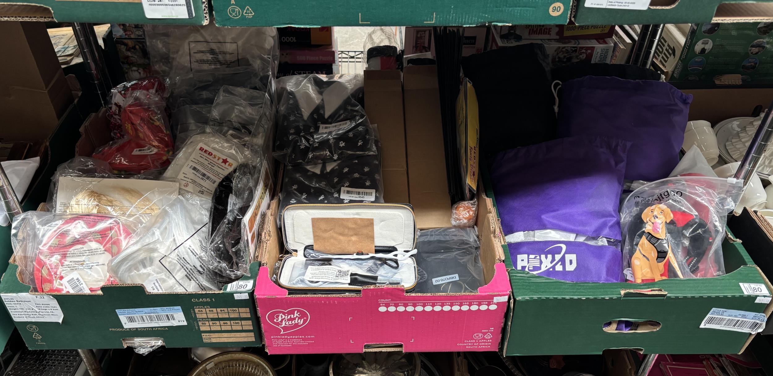 3 Boxes containing new wigs, hairdresser's scissors and shoes etc