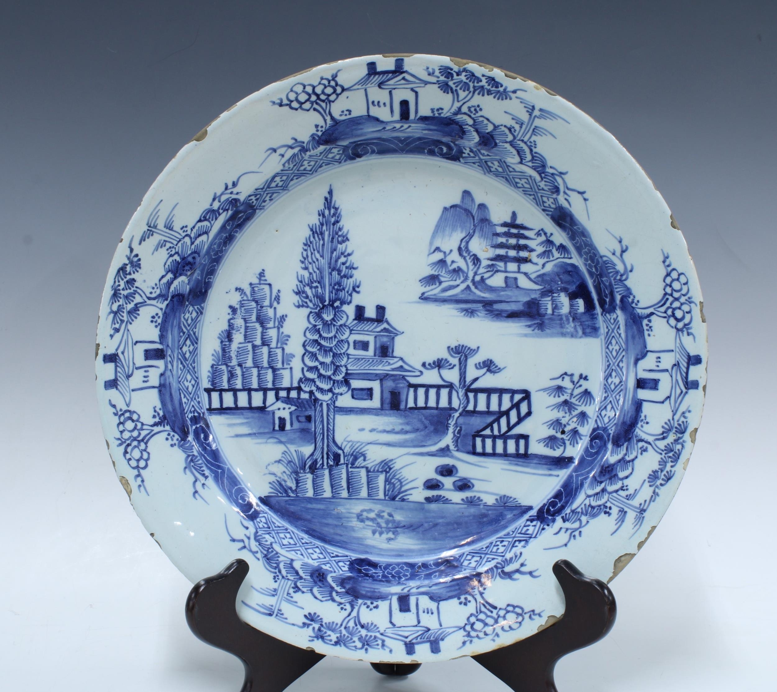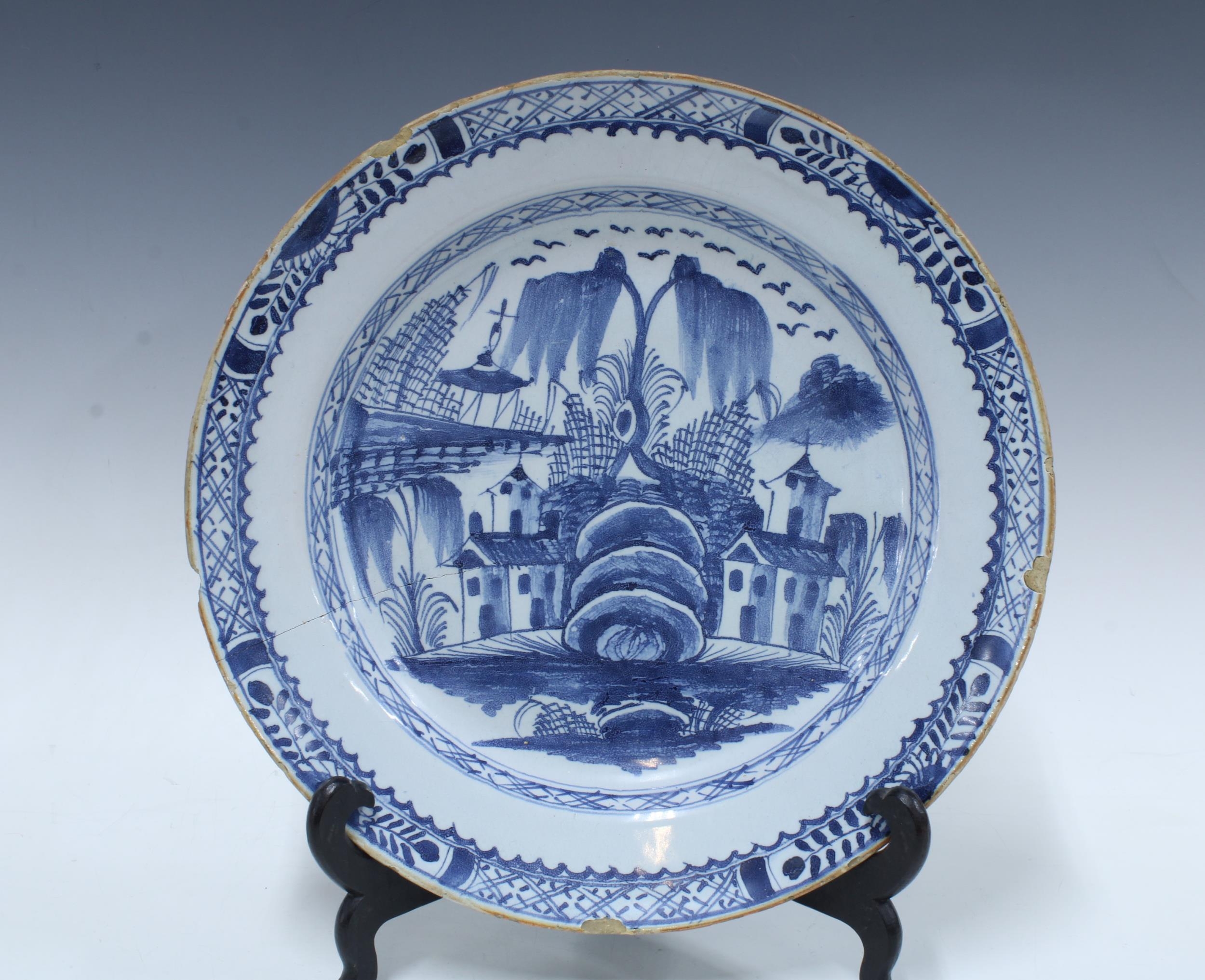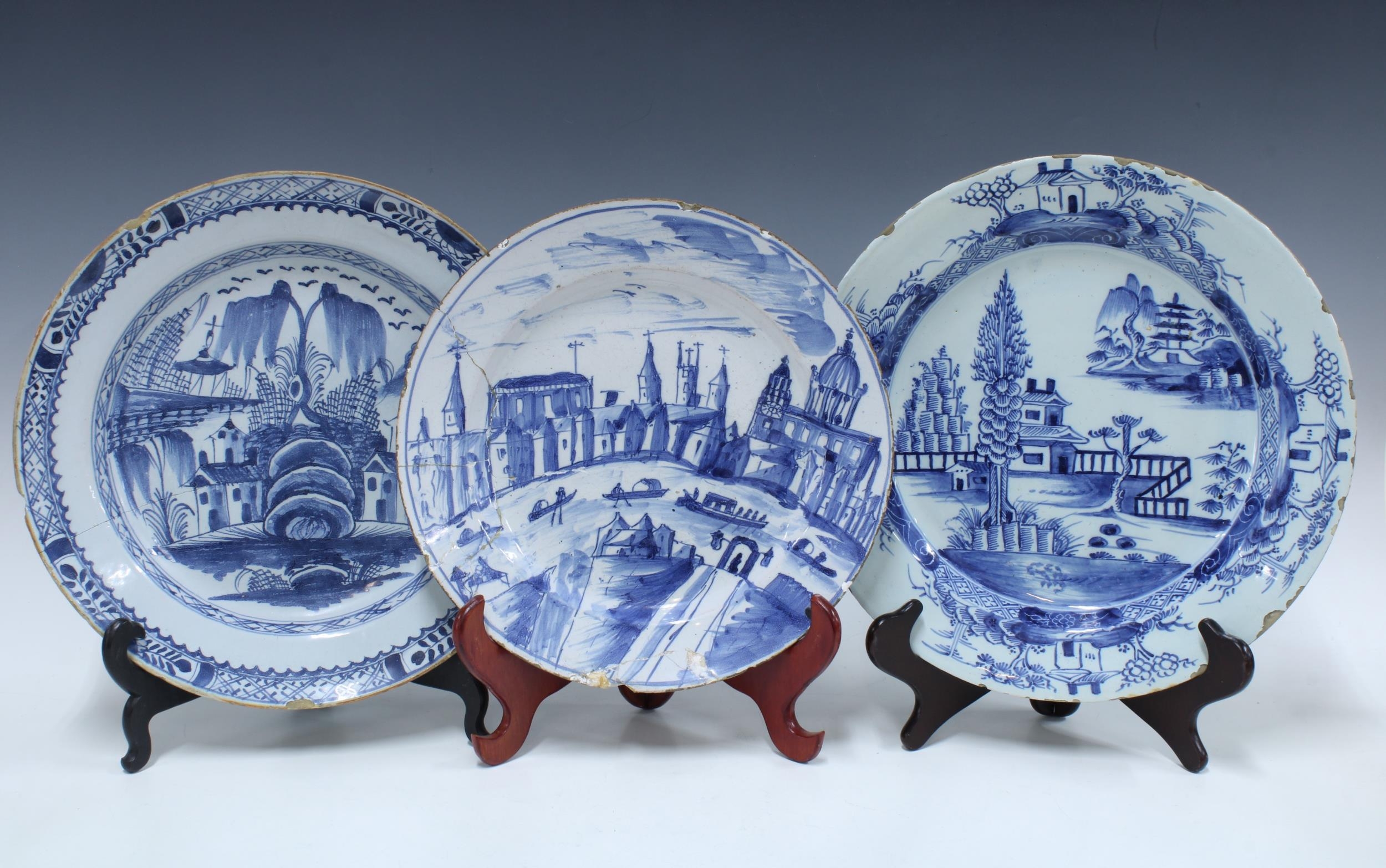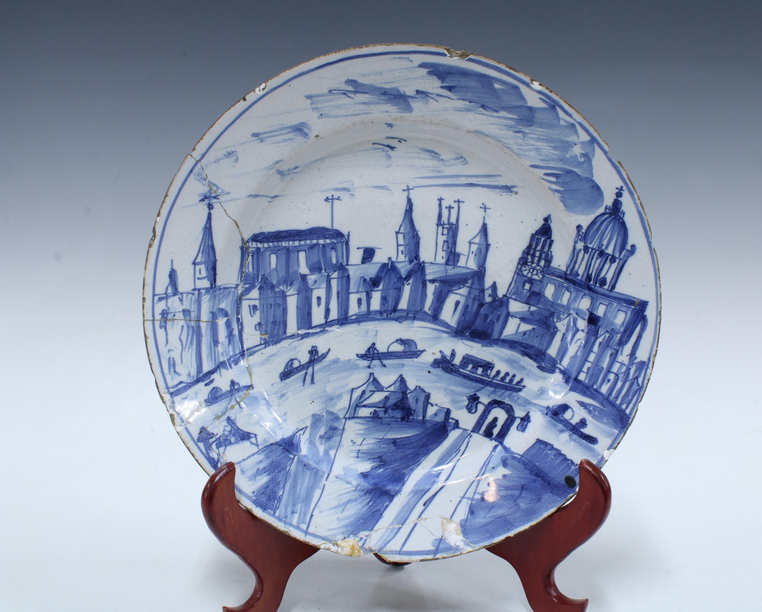 Two large 18th century Delft blue and white tin glazed chargers / plates, together with a smaller tin glazed plate, handpainted with a scene of Venice (all a/f with damages) and repairs (3)